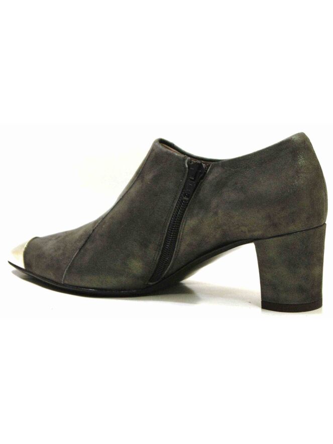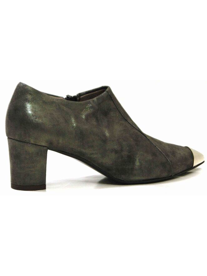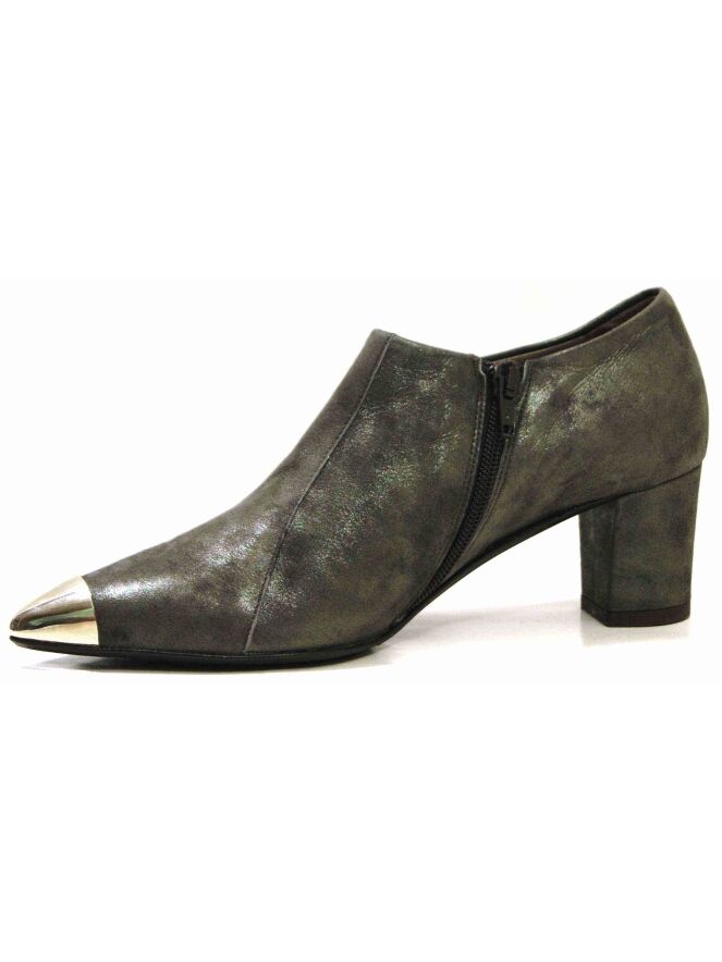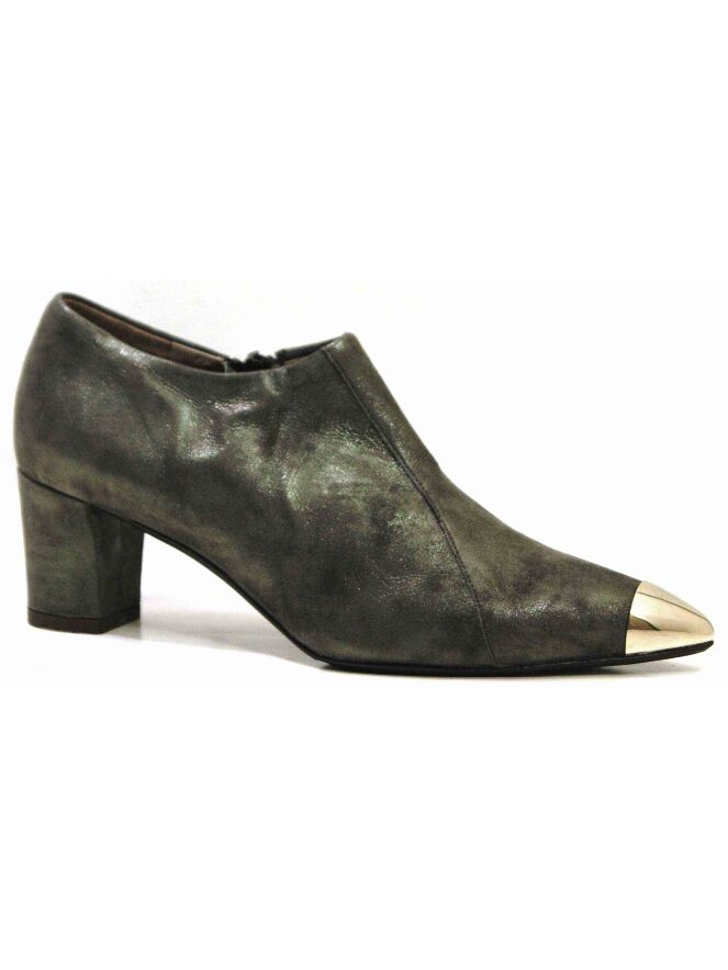 Een instapper schoentje op een 5 cm hak in een metallic bronzen kleur. De neus van de schoen is spits en afgewerkt met een zilver kleurig metalen puntje. De blokhak is in de zelfde kleur bekleed als het schoentje. De binnenvoering is van leder.