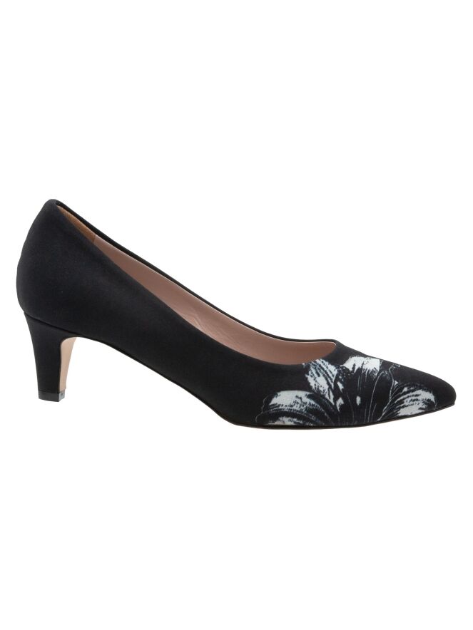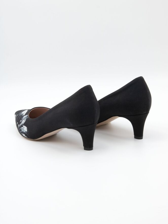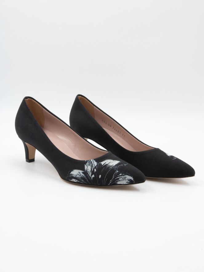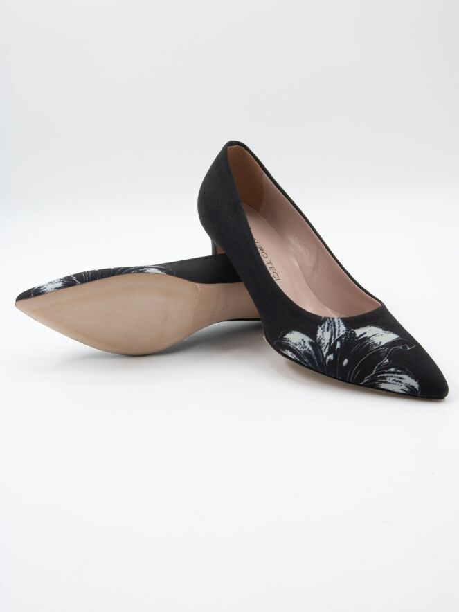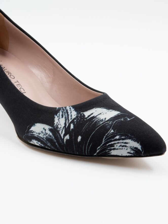 Een pump van het merk Mauro Teci in een print met meerdere zwarte tinten. De pump heeft een iets spitse neus . De binnenzijde van de pump is met leder bekleed.