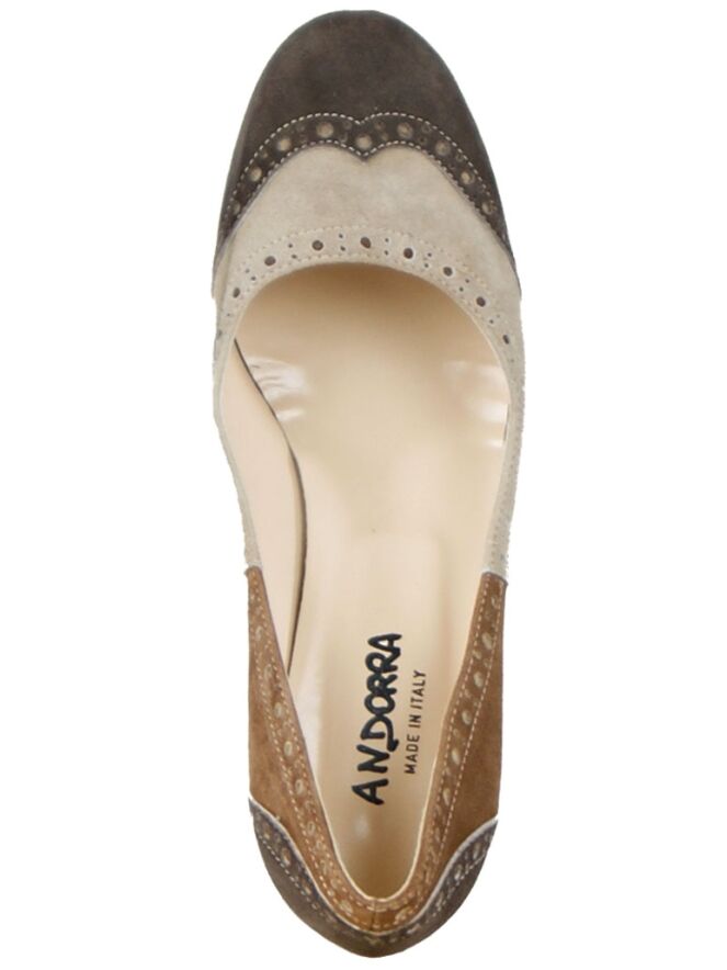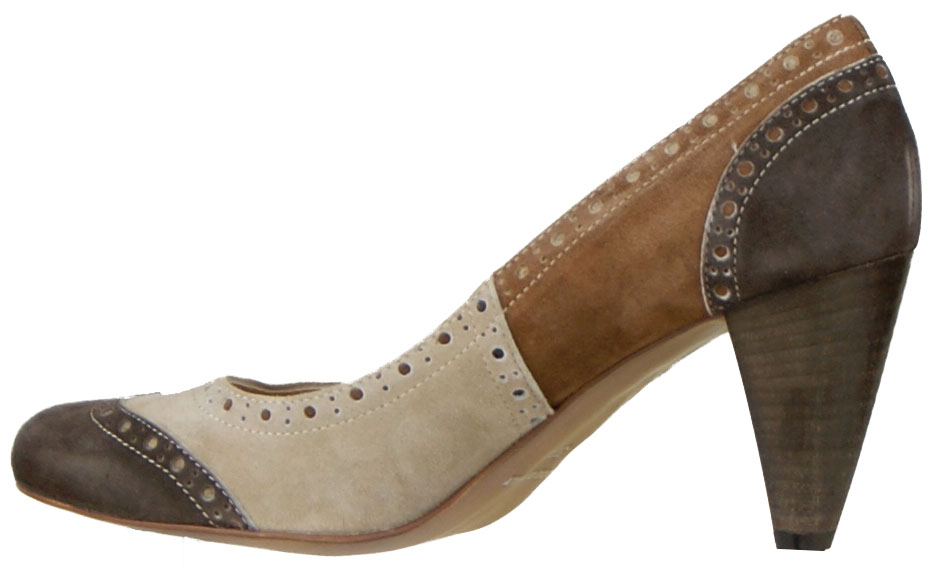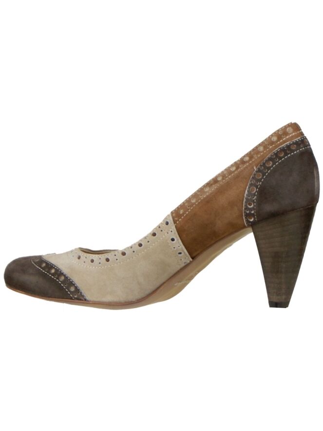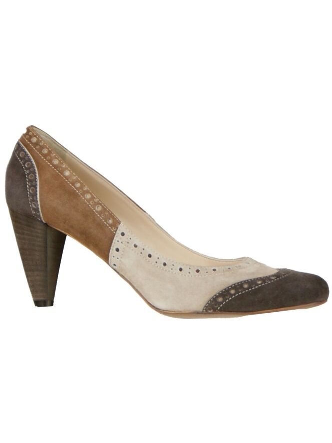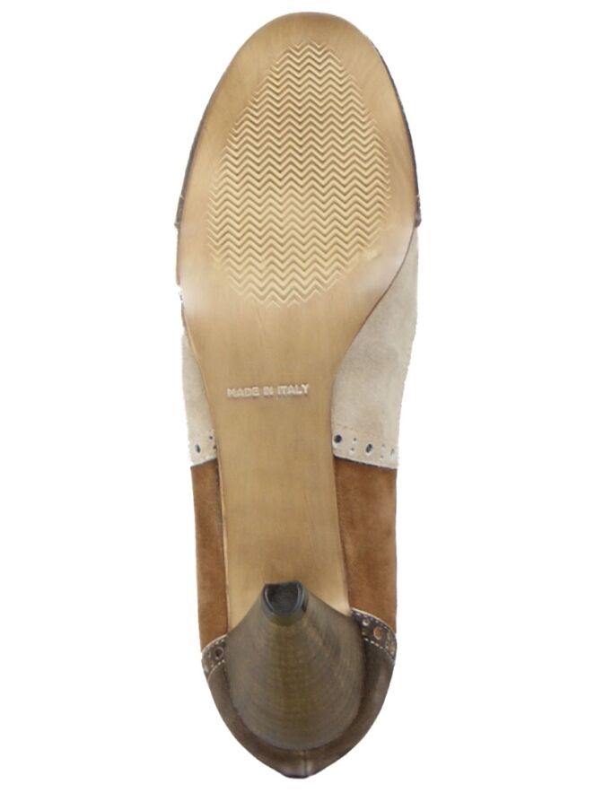 Een pump van het merk Mauro Teci met een ronde neus in drie kleuren bruin. Op de neus en langs de randen heeft de pump brooks details. De pump is aan de binnenkant met leder gevoerd.