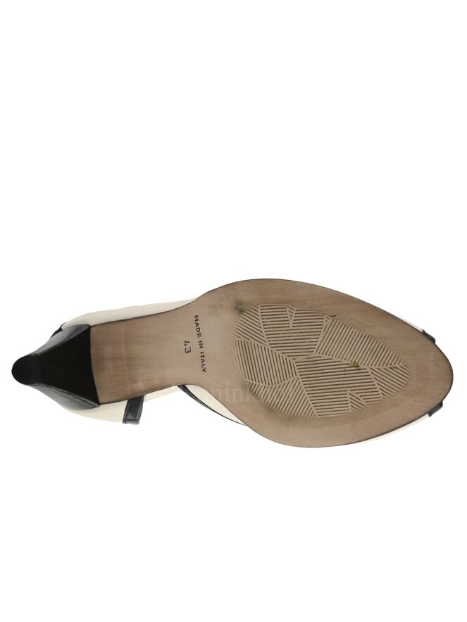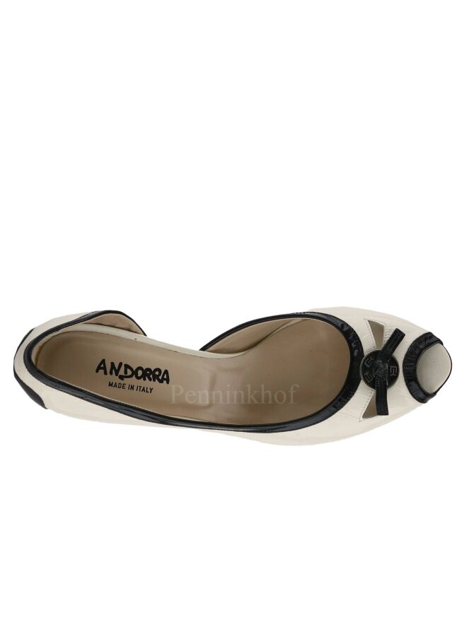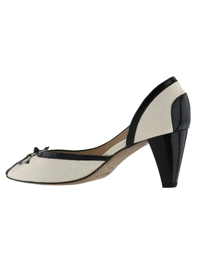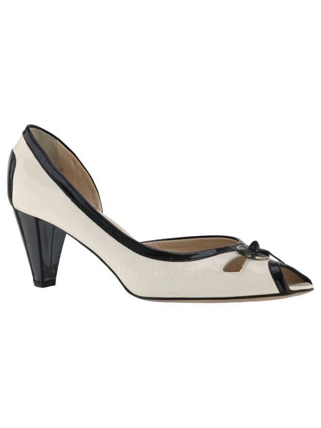Een pump met open teen van Mauro Teci in de kleur wit. De randen hebben een zwarte bies. Op de voorvoet is een decoratieve munt met een lak lederen strikje. De binnenzijde van de pump is open en de binnenkant is met leder gevoerd.