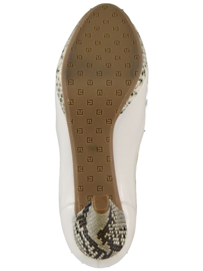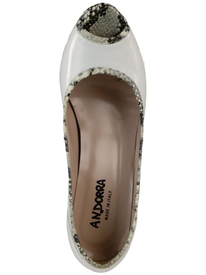 Een pump met een open teen van Mauro teci in de kleur wit. Langs de randen is een bies in een slangenprint. De plateauzool en de hak zijn tevens in een slangenprint bekleed. De binnenkant is met leder gevoerd.