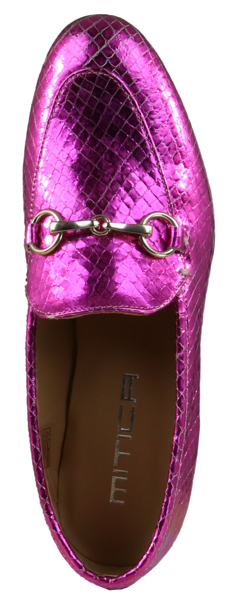 Een instapper van Mitica in een croco print in de kleur fuchsia. Over de voorvoet is een smal zilveren bitje. De binnenkant is met leder gevoerd.