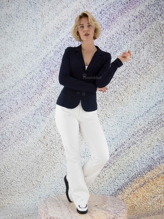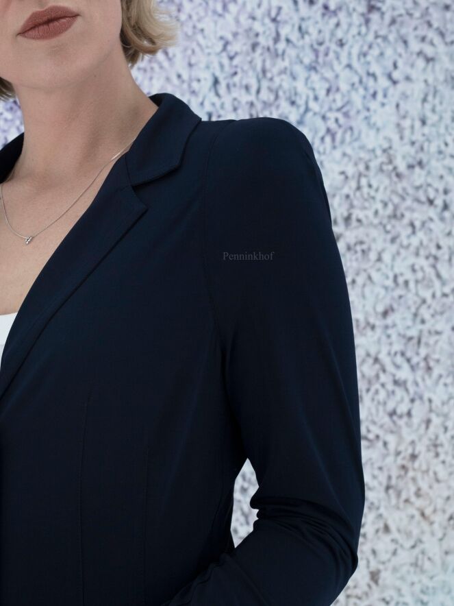 Een blazer van ML Collections in de kleur marineblauw. De blazer heeft een 3 knoops sluiting en is ongevoerd. Deze blazer mag niet worden gewassen.