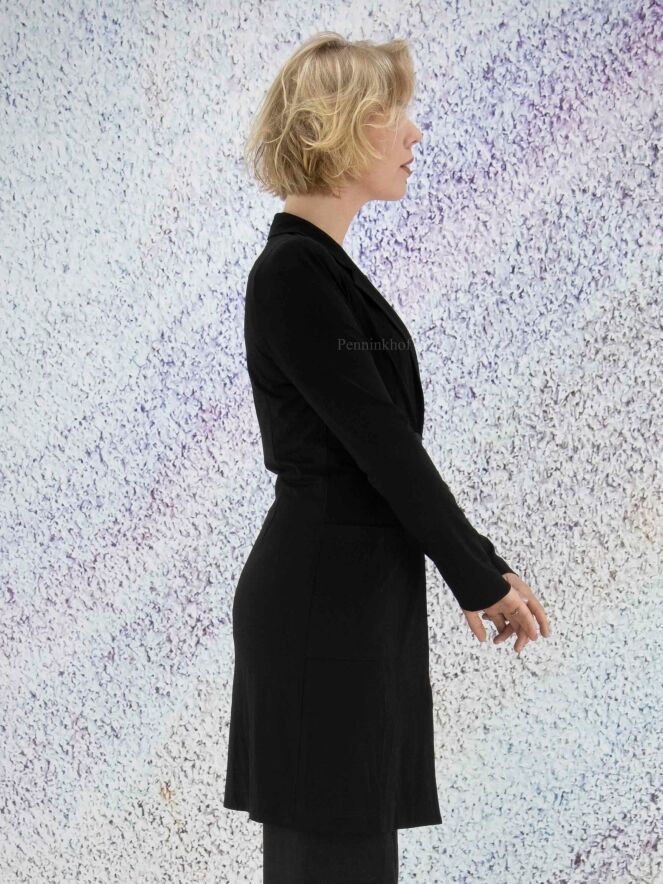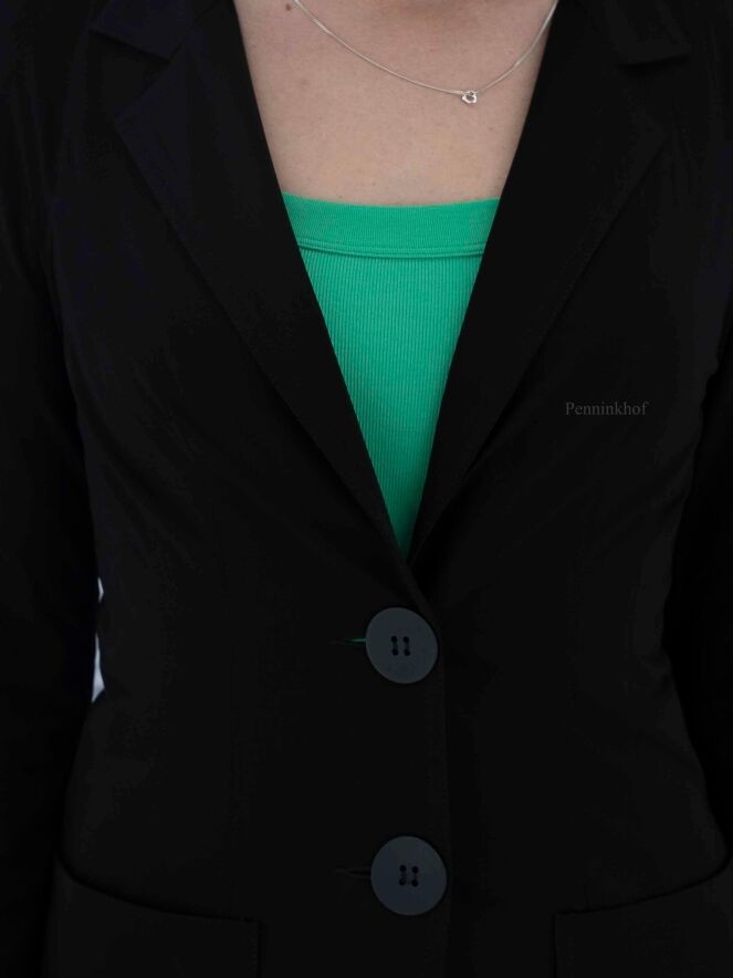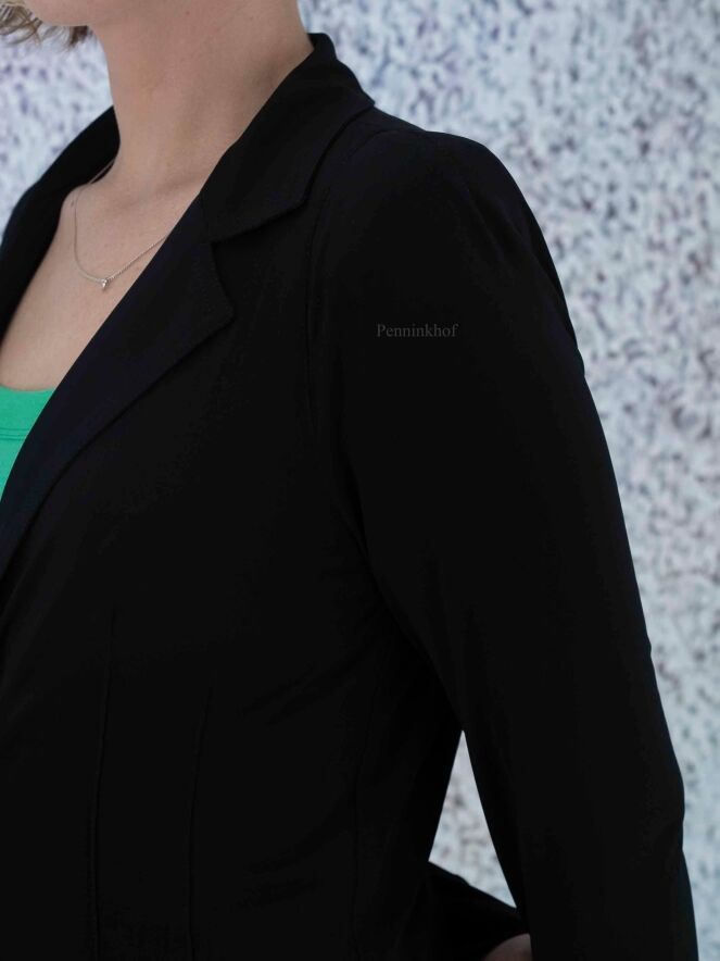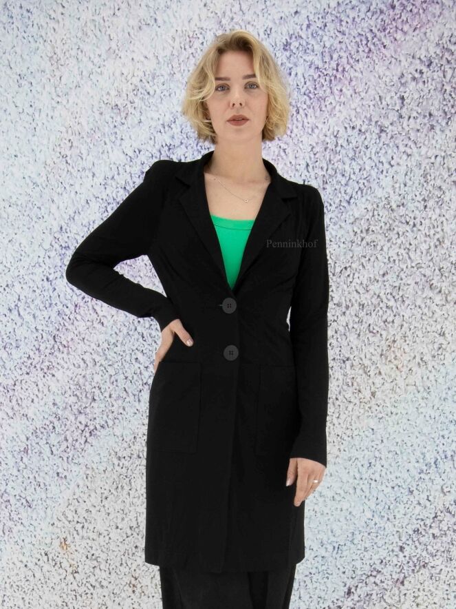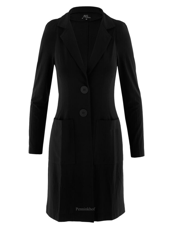 Een lange blazer van ML Collections in de kleur zwart. De blazer heeft een 2 knoops sluiting en is ongevoerd. Deze blazer mag niet worden gewassen.