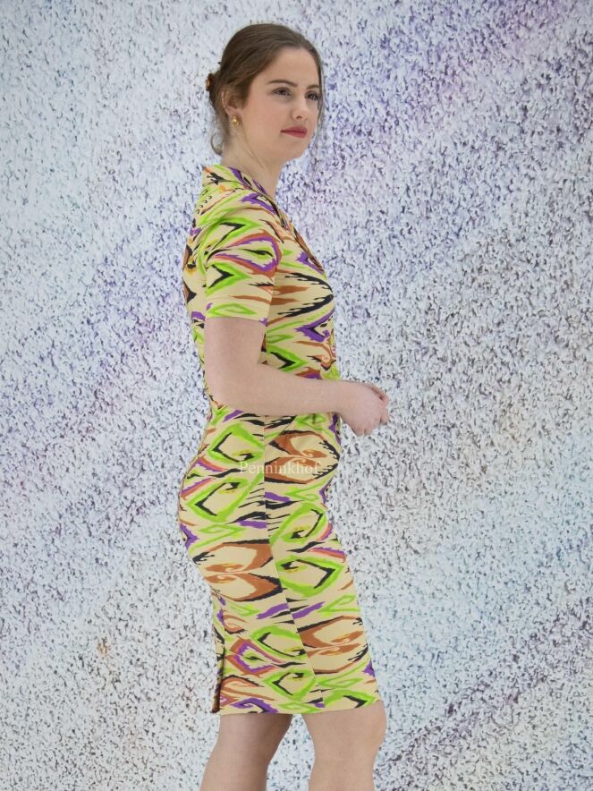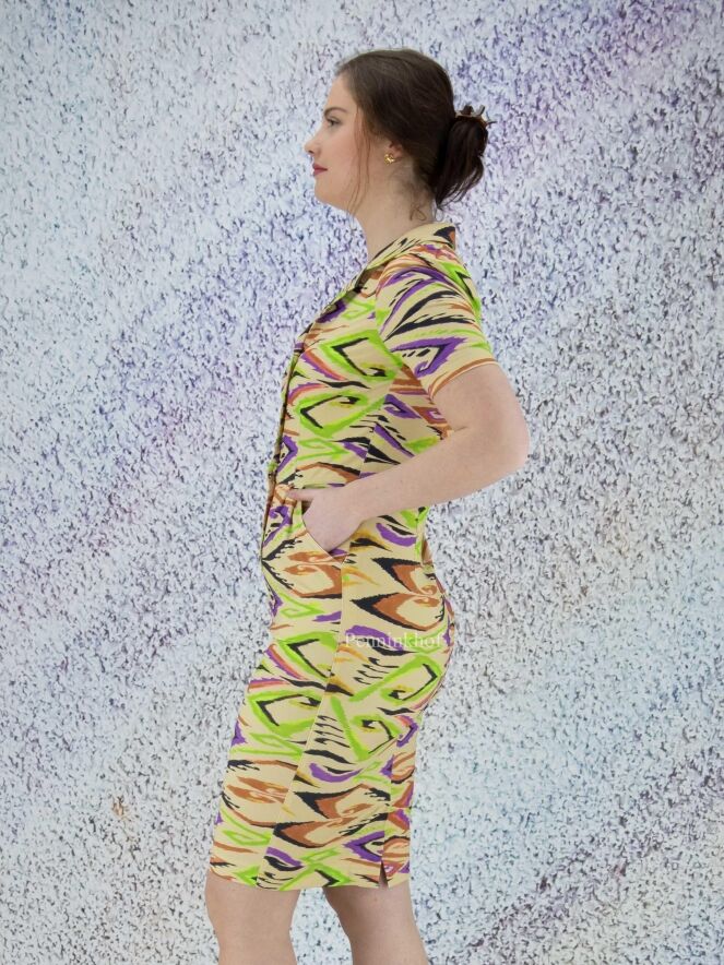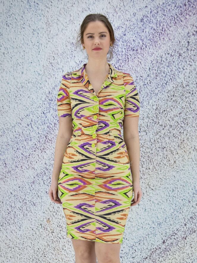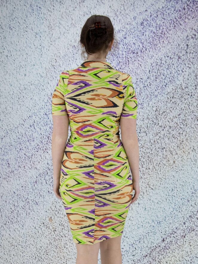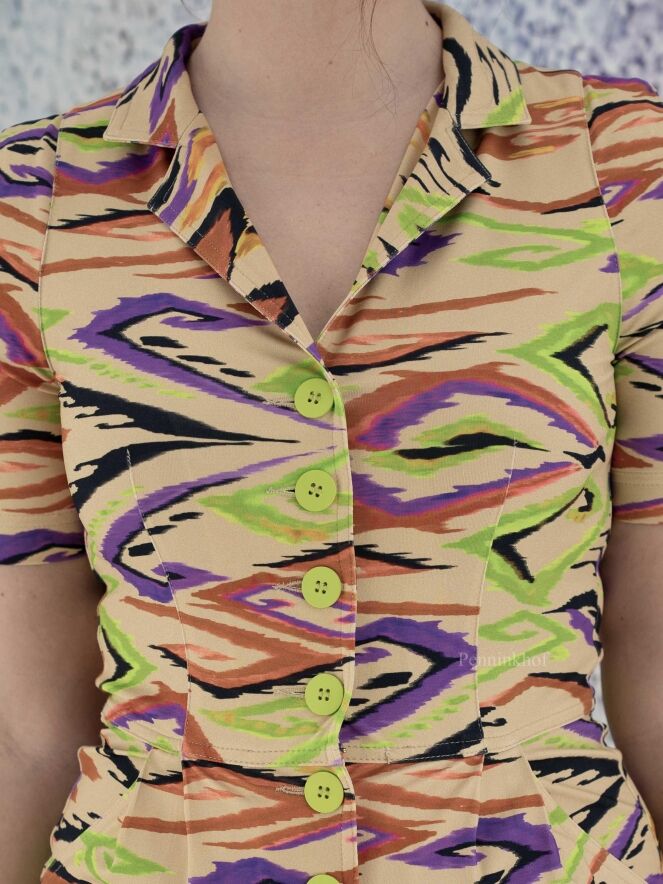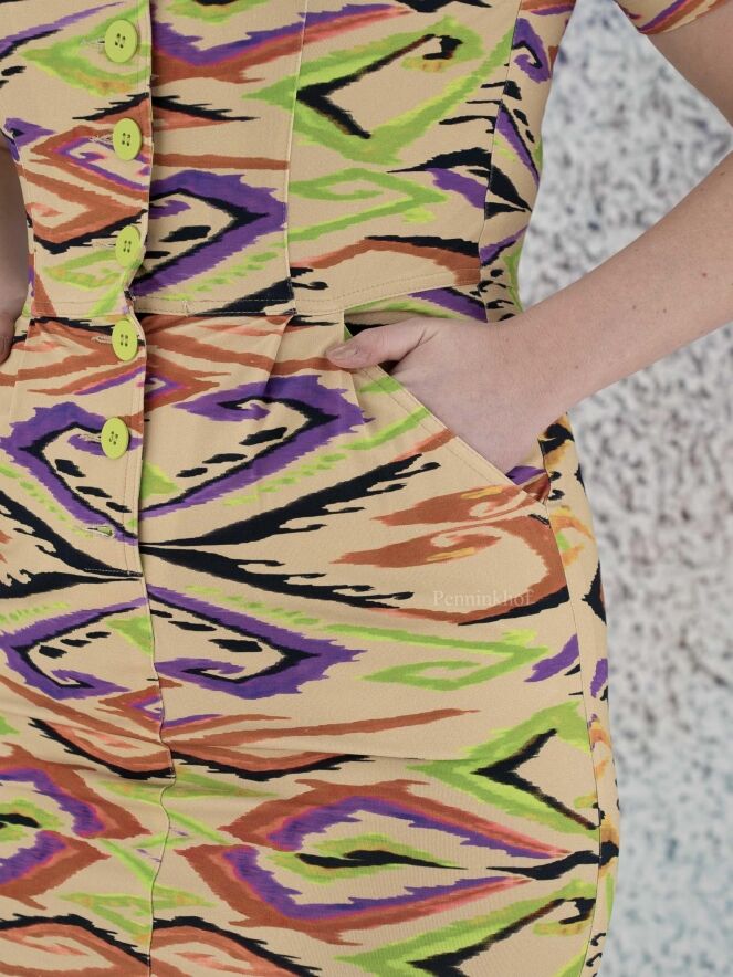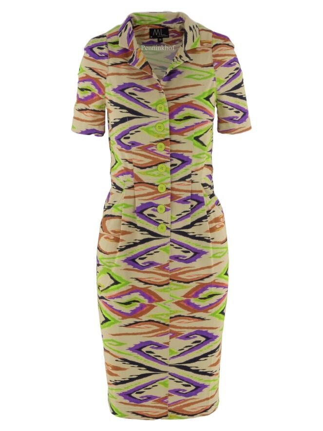 Een jurk van ML Collections in een gevlamde grafische print met meerdere tinten groen, zwart, paars en roest op een beige achtergrond. In de taille zijn steekzakken. Deze jurk heeft korte mouwen en mag niet worden gewassen.