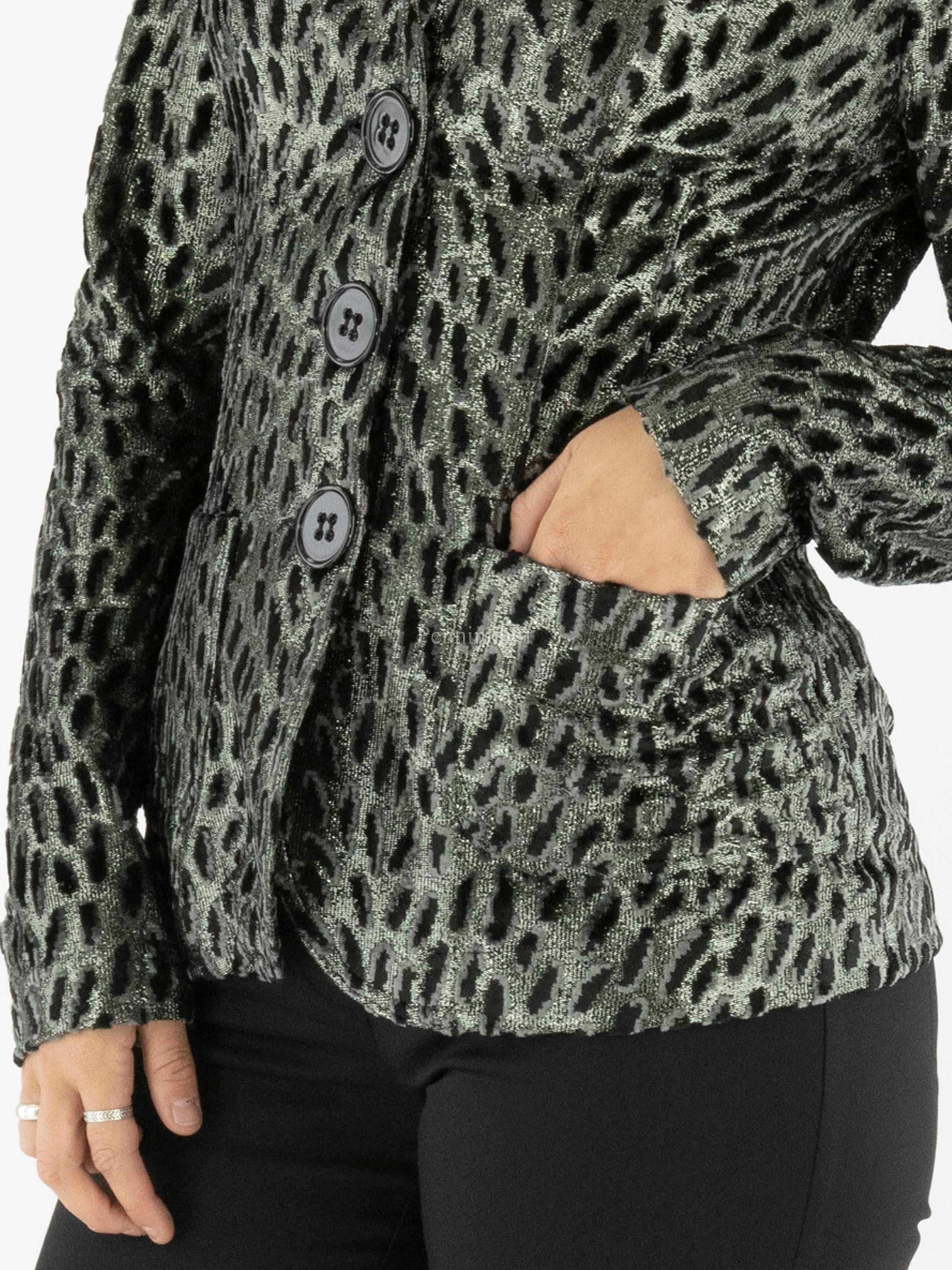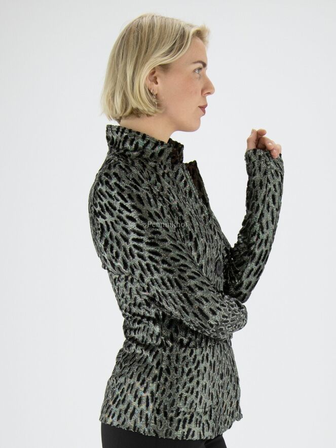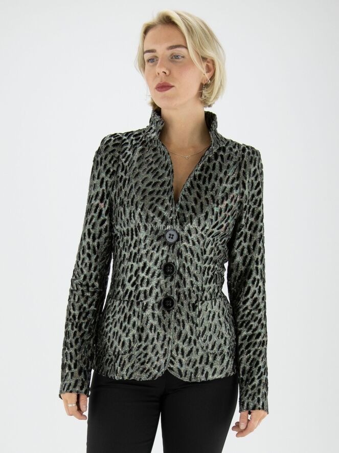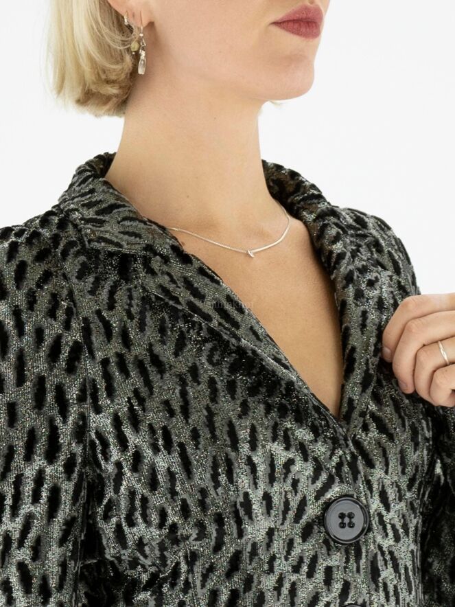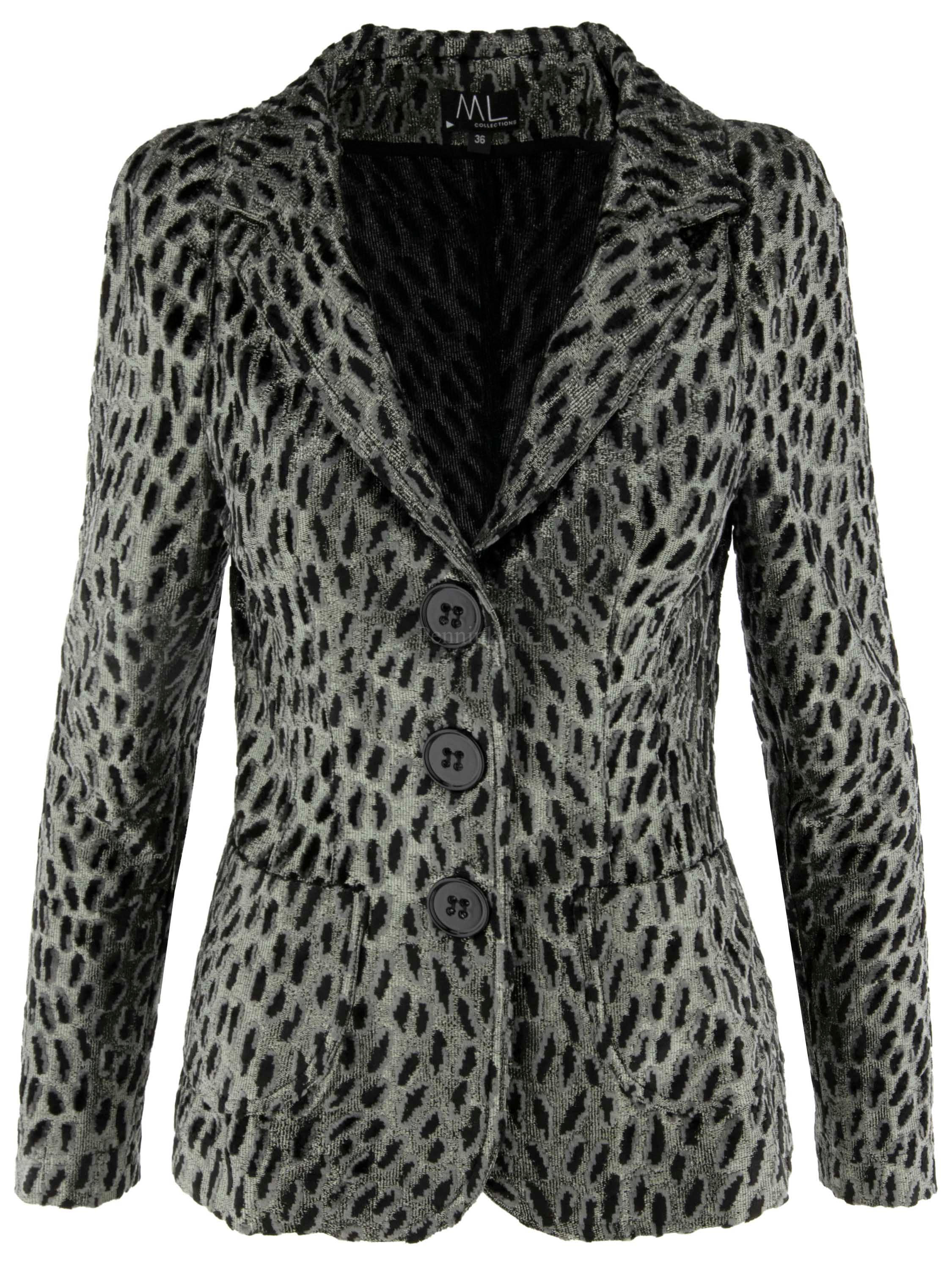 Een blazer van ML Collections in een luipaardprint met de kleuren zilver, zwart en lichtgrijs velour. De blazer heeft een 3 knoops sluiting en is niet gevoerd. Deze blazer mag niet worden gewassen.