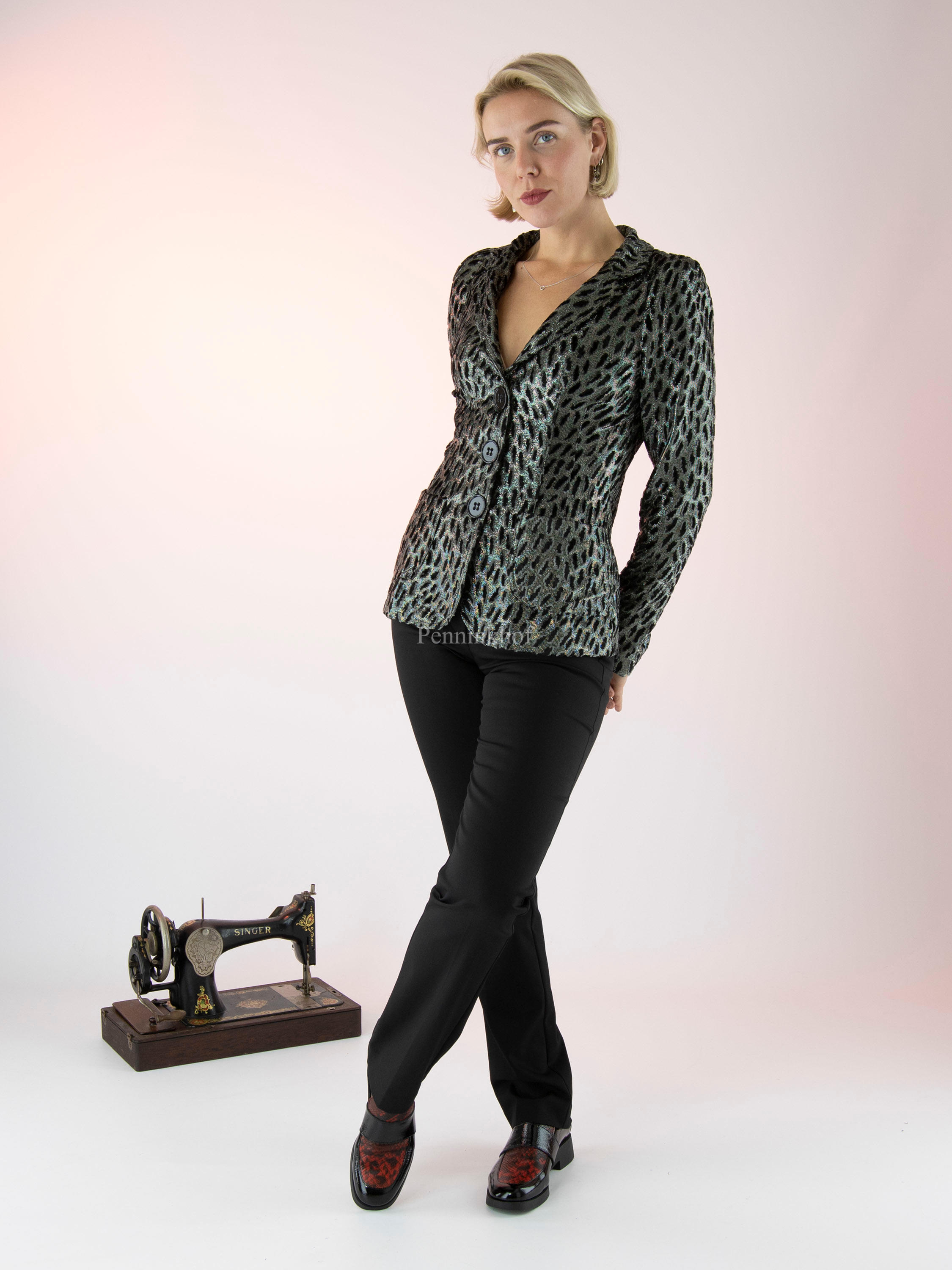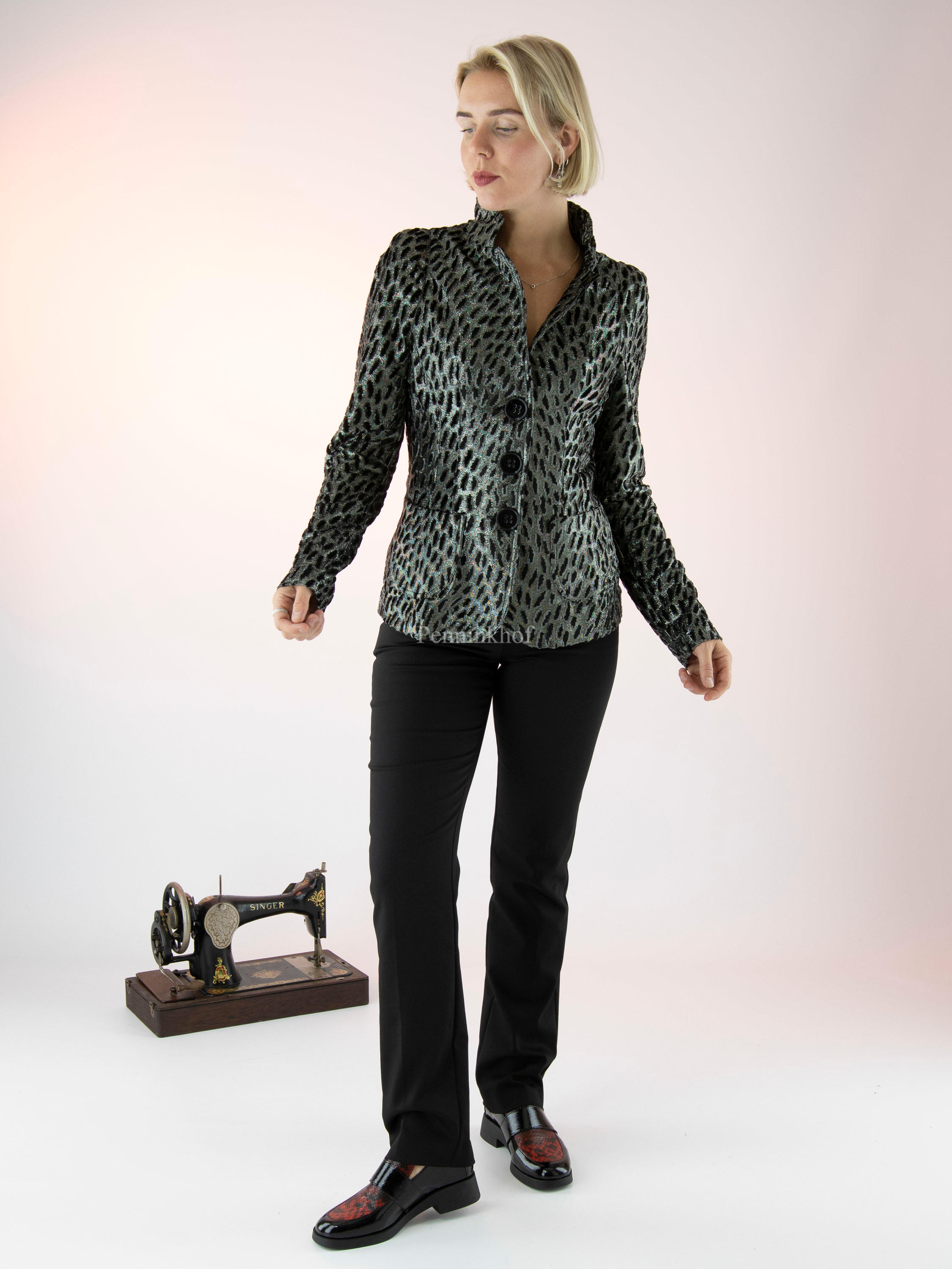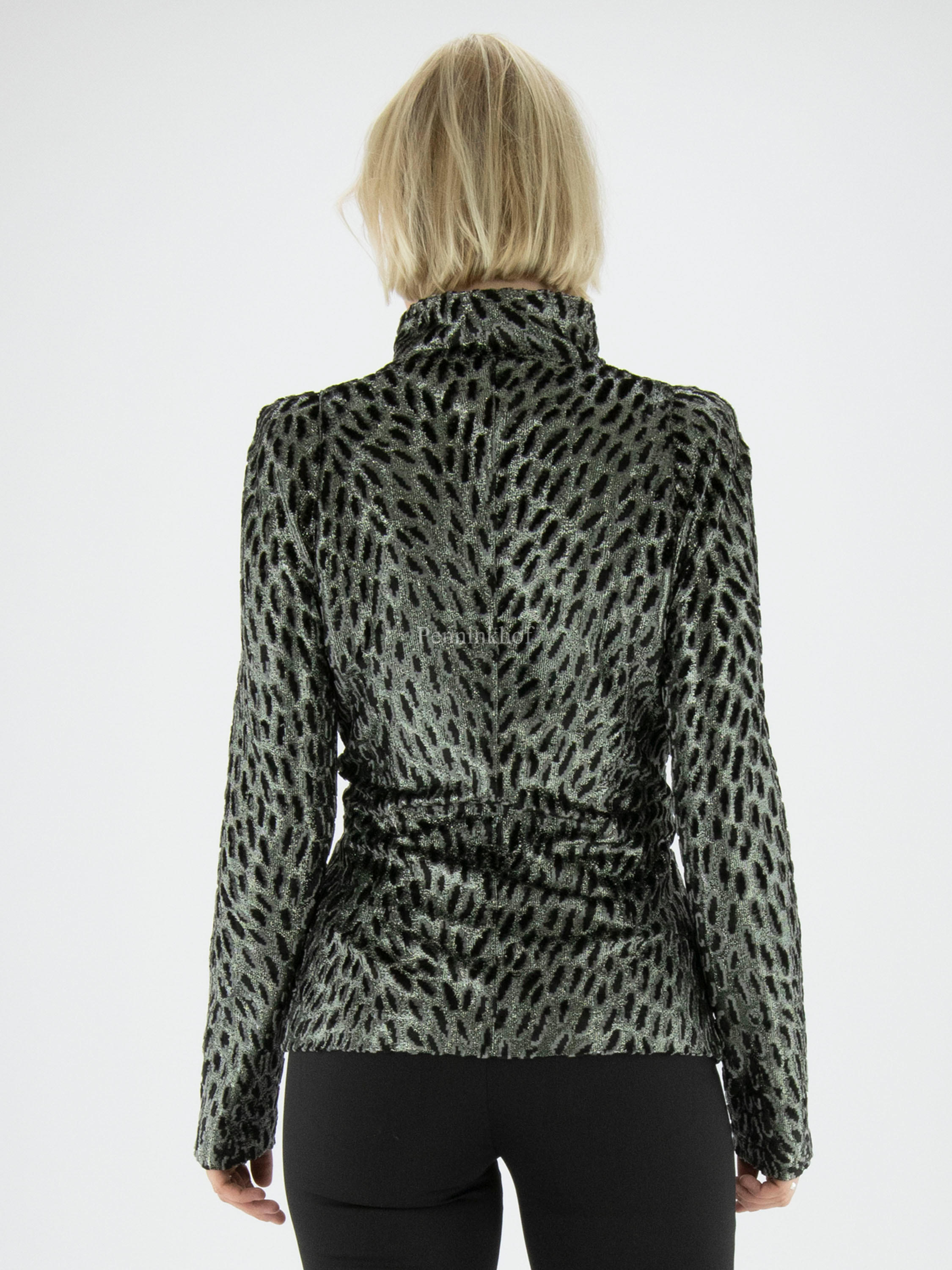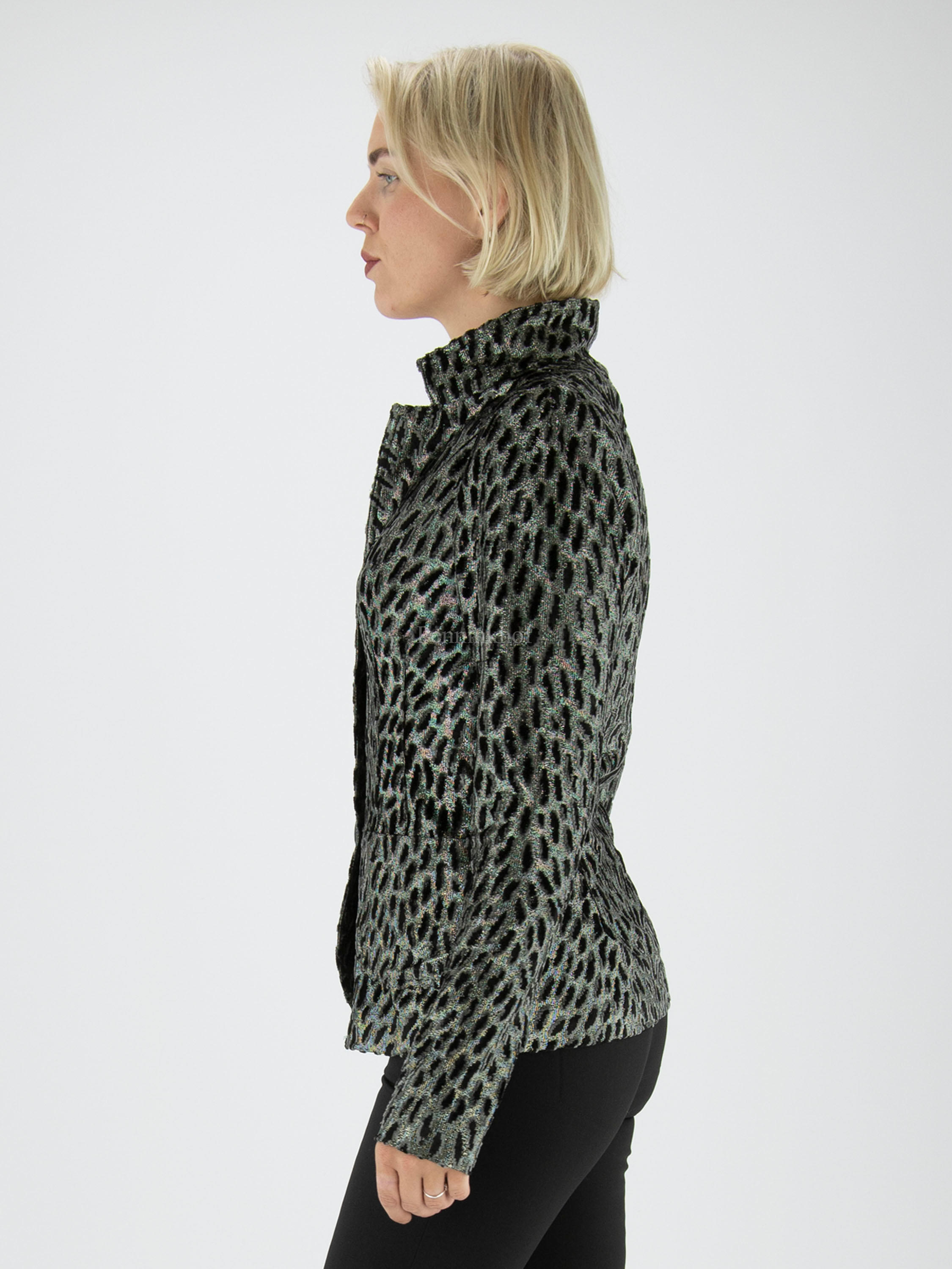 Een blazer van ML Collections in een luipaardprint met de kleuren zilver, zwart en lichtgrijs velour. De blazer heeft een 3 knoops sluiting en is niet gevoerd. Deze blazer mag niet worden gewassen.
