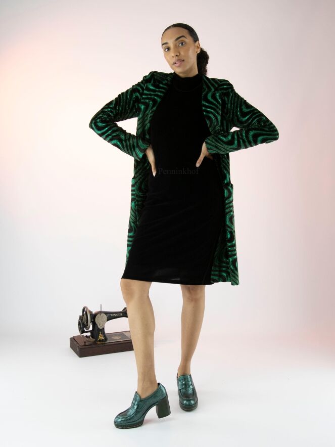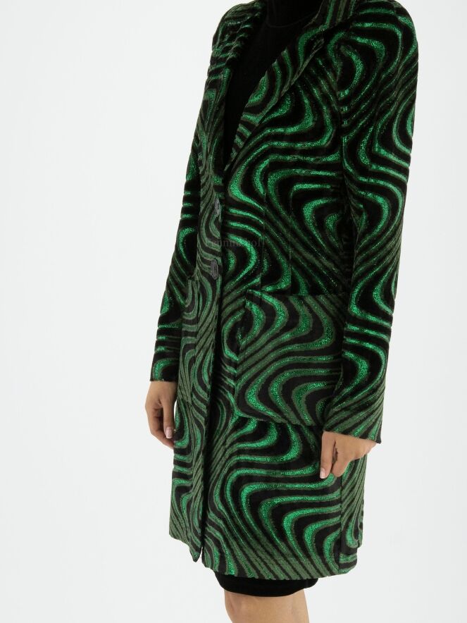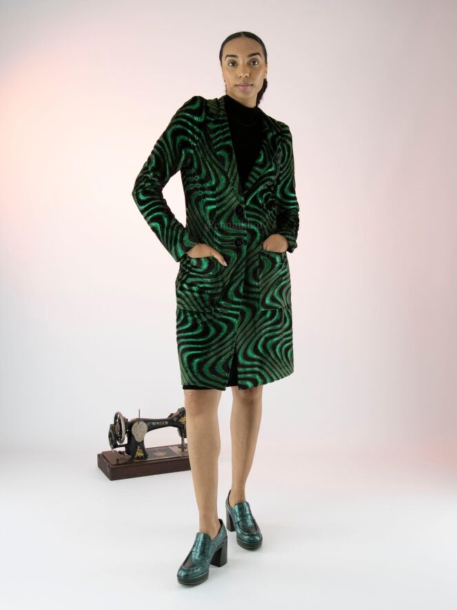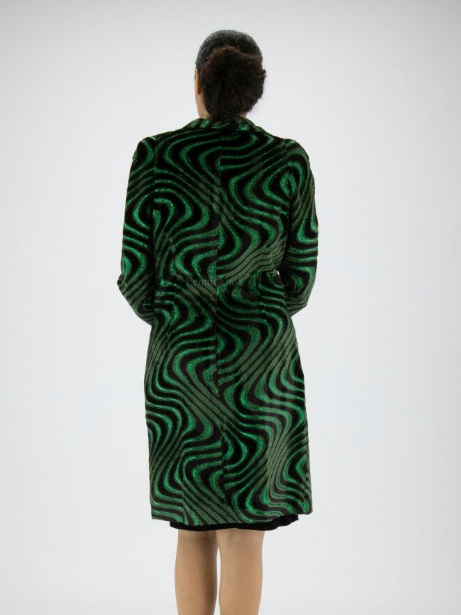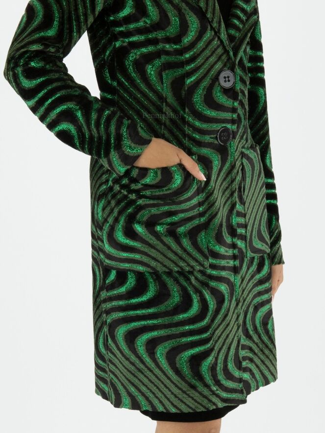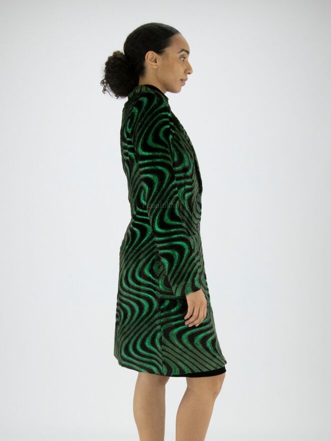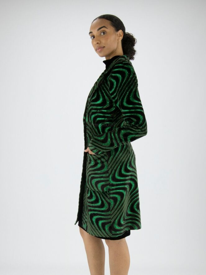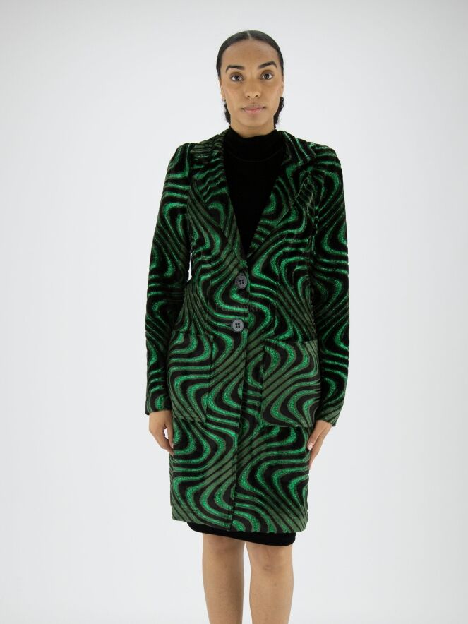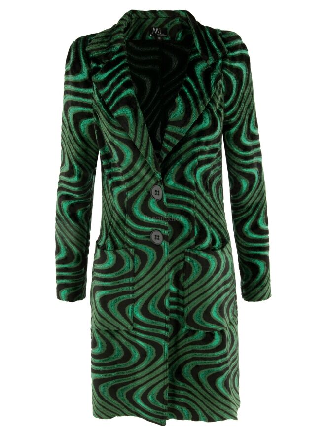 Een lange blazer van ML Collections in een golvende print met de kleuren metallic groen, zwart en groen velour. De blazer heeft een 2 knoops sluiting en is niet gevoerd. Deze blazer mag niet worden gewassen.