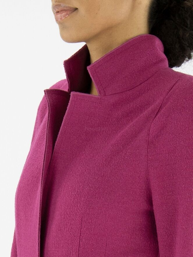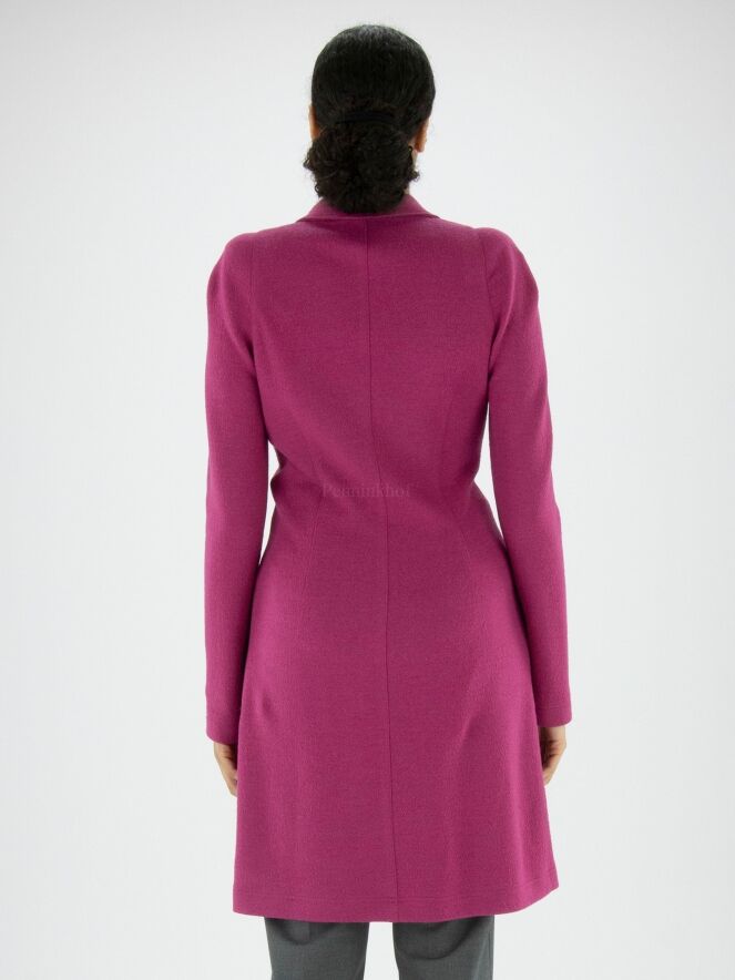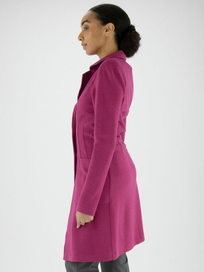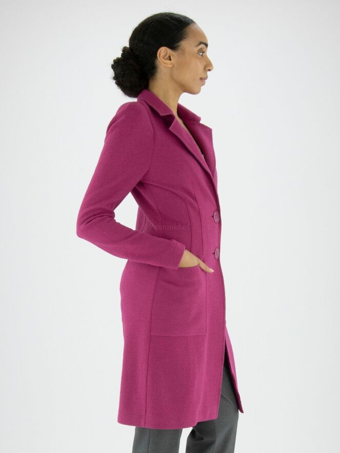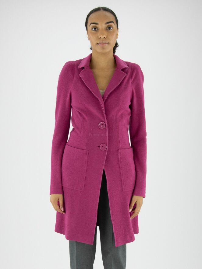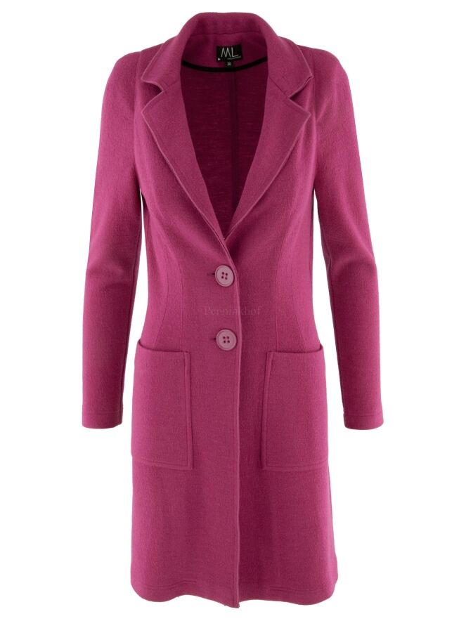 Een lange blazer van ML Collections in de kleur fuchsia. De blazer heeft een 2 knoops sluiting en is ongevoerd. Deze blazer mag niet worden gewassen.
