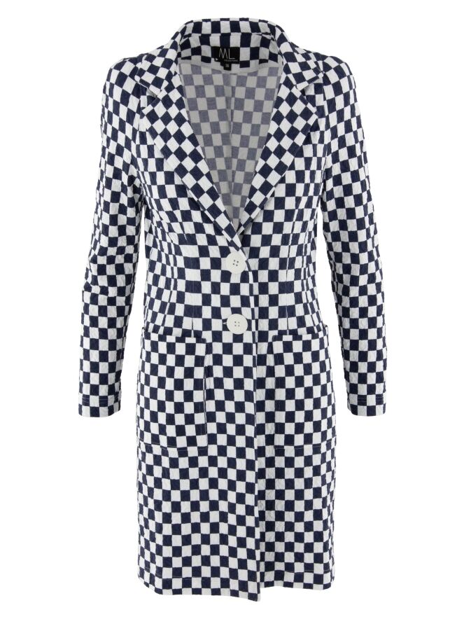 Een lange blazer van ML Collections in een blokprint met de kleuren marineblauw en wit. De blazer heeft een sluiting met 3 knopen en is ongevoerd. Deze blazer mag niet worden gewassen.