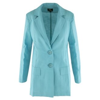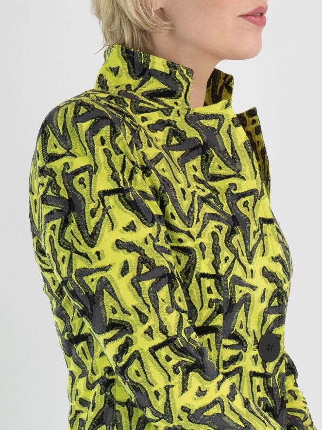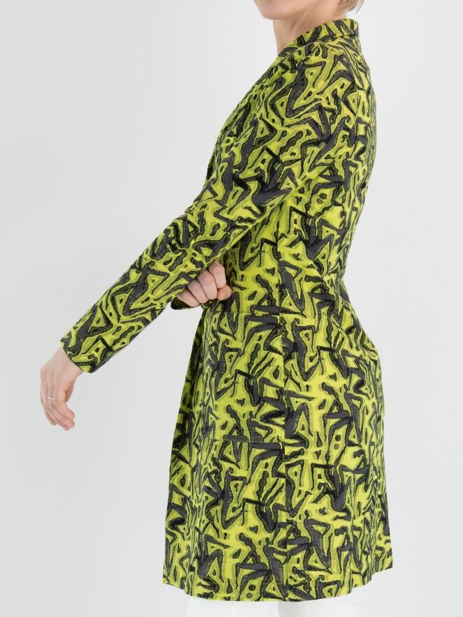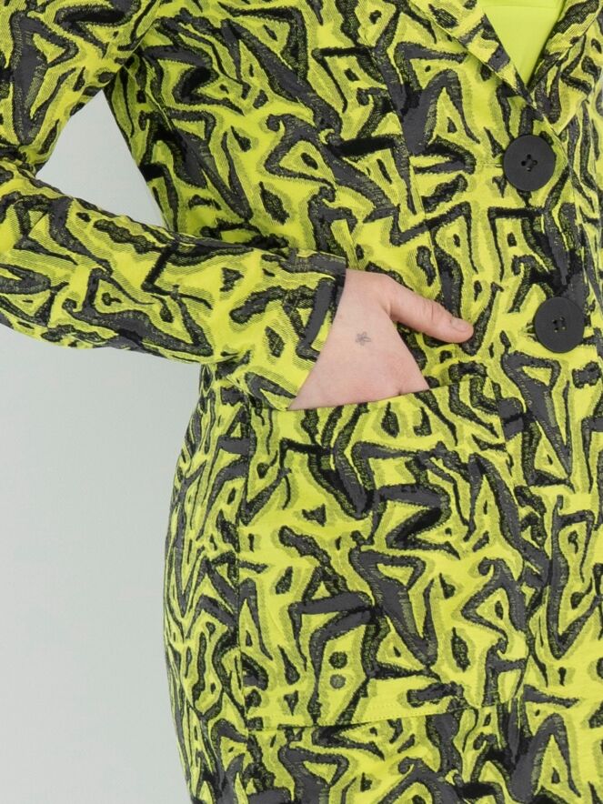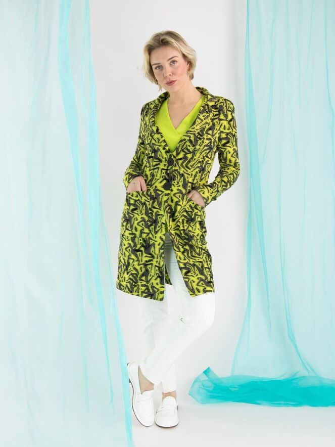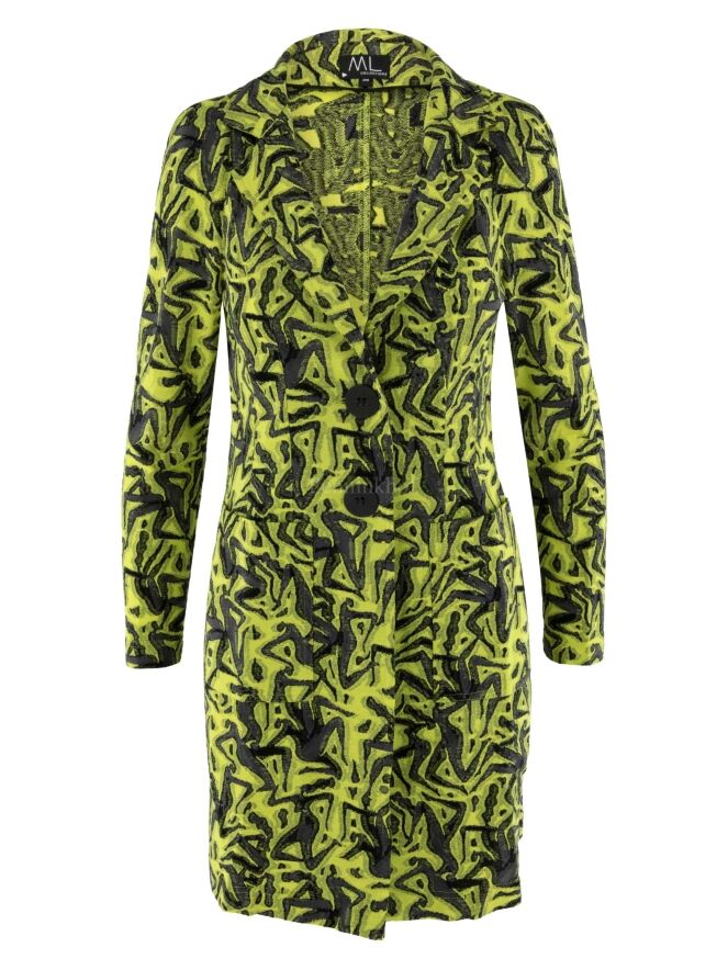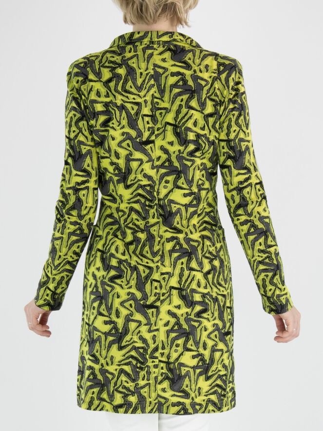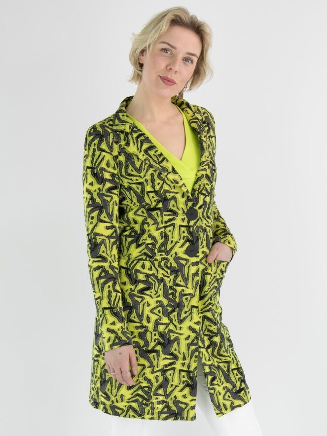 Een lange blazer van ML Collections in een grafische print met de kleuren lime groen en grijs. De blazer heeft een 2 knoops sluiting en is ongevoerd. Deze blazer mag niet worden gewassen.