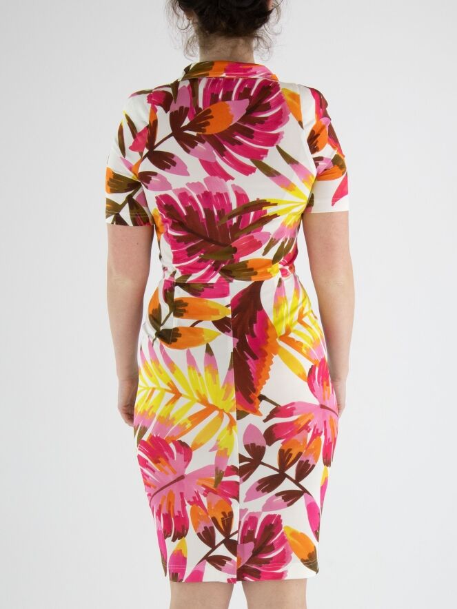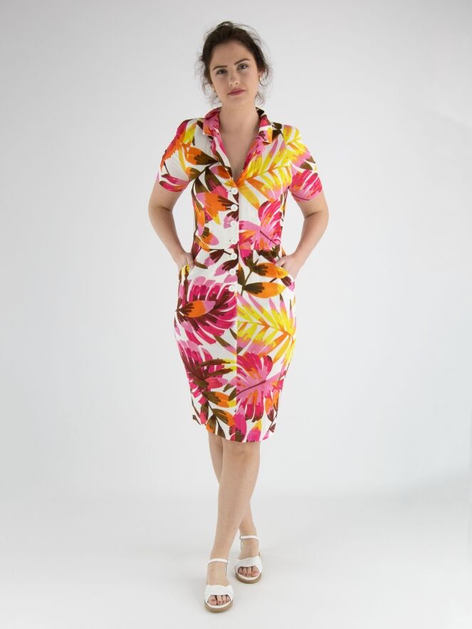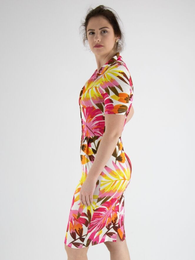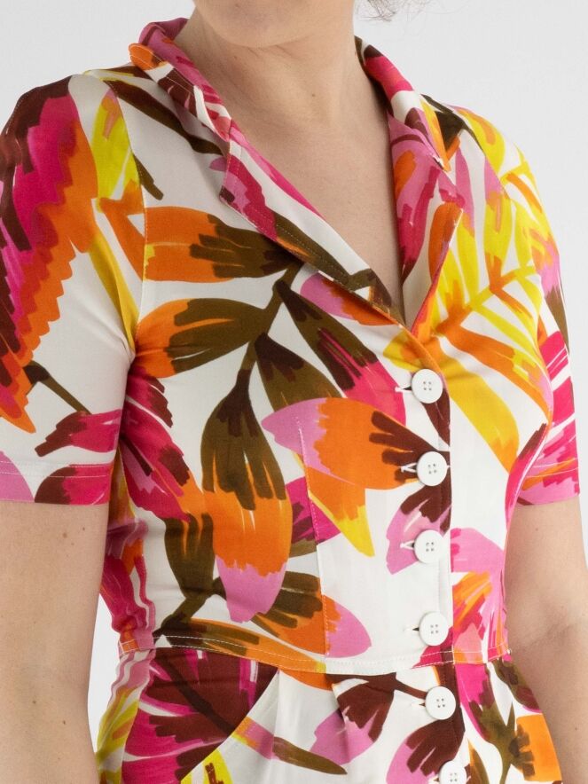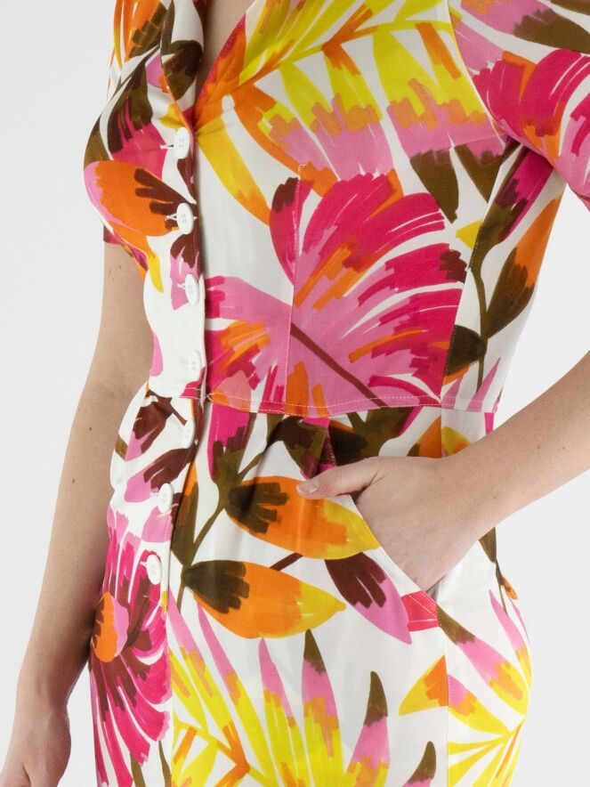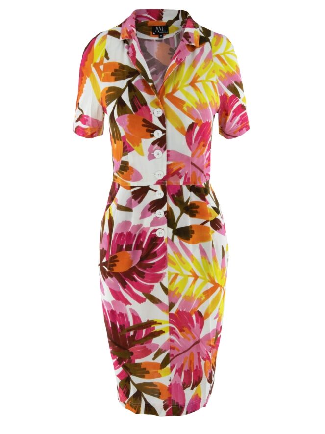 Een doorknoop jurk van ML Collections in een bloemenprint met de kleuren fuchsia, geel, bruin en oranje op een witte achtergrond. In de taille is een stiknaad met daaronder steekzakken. De jurk is ongevoerd en mag niet worden gewassen.
