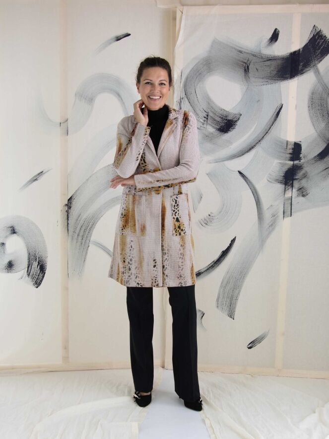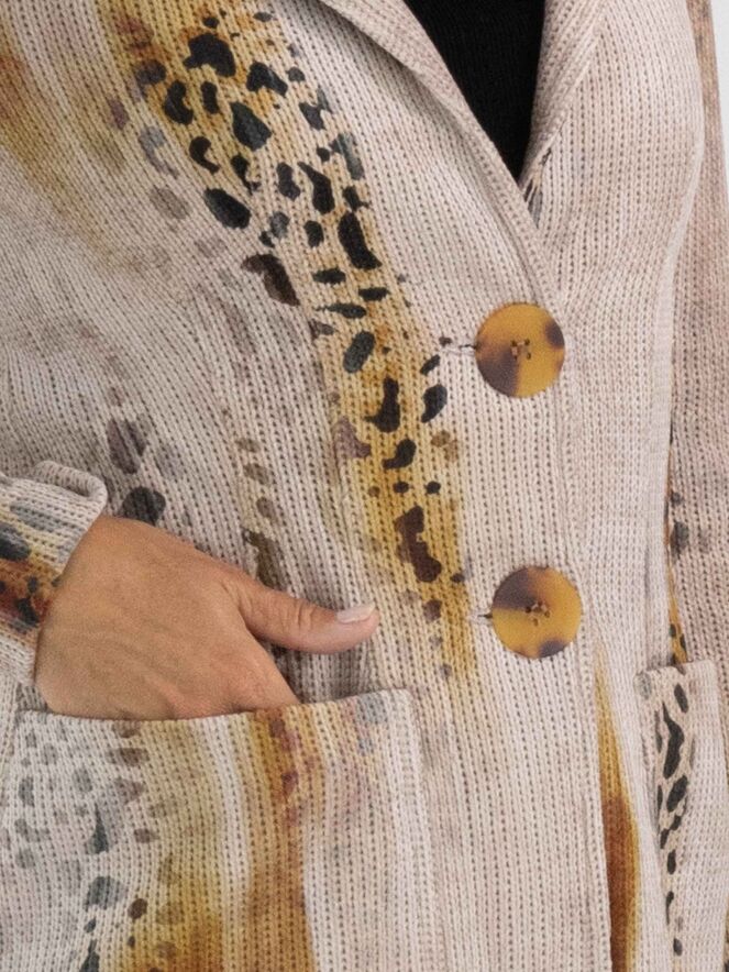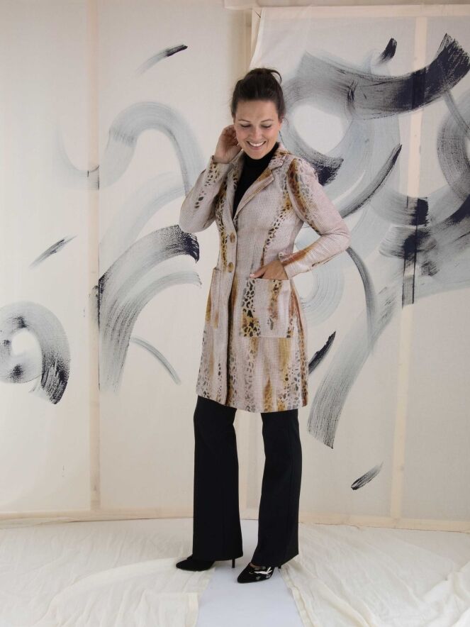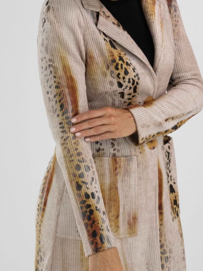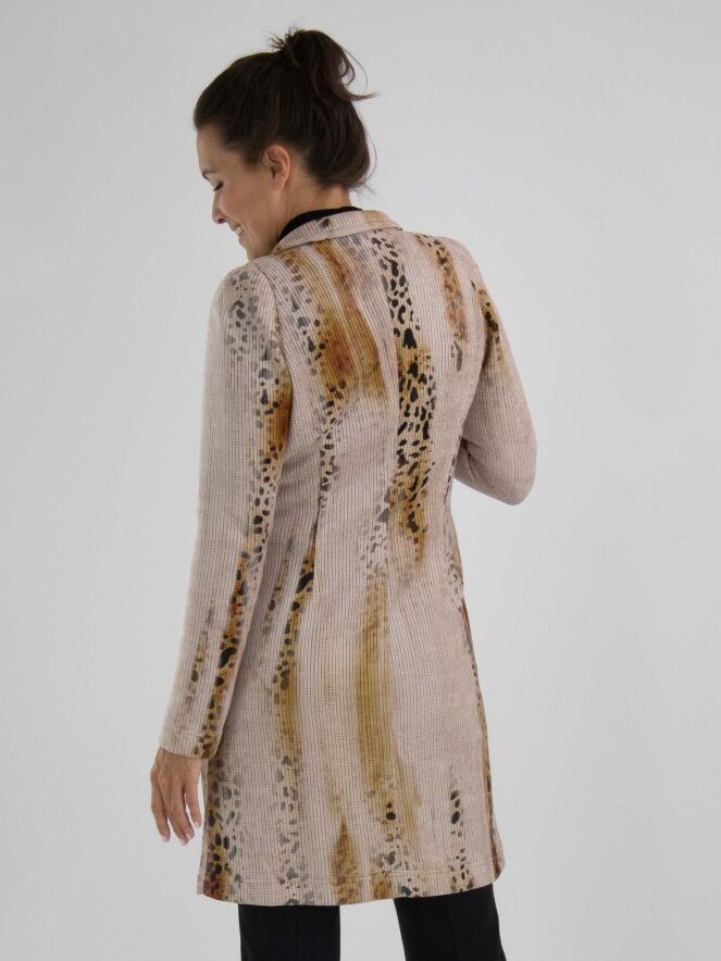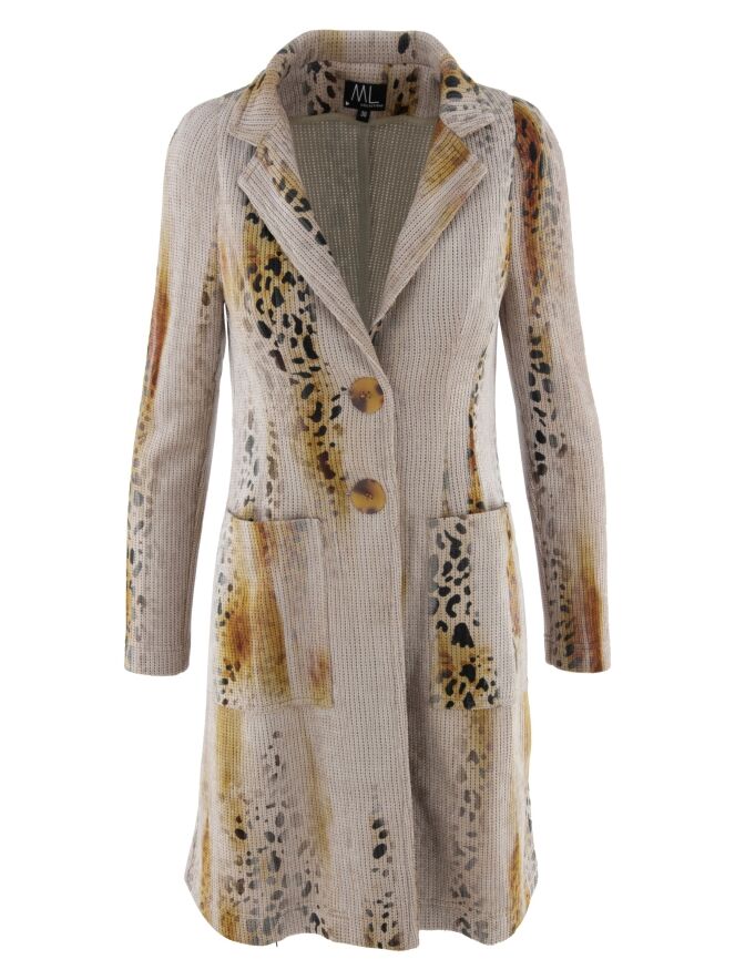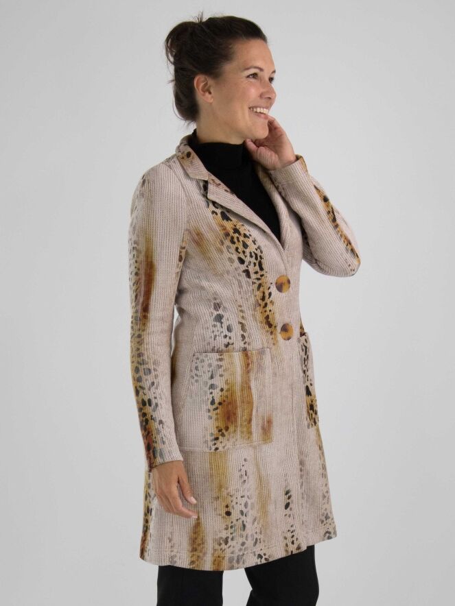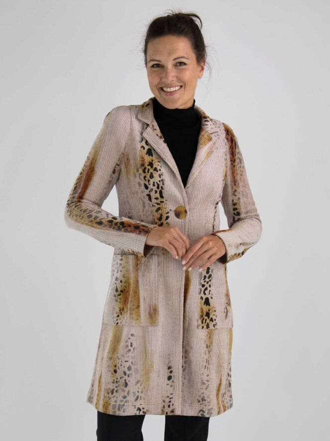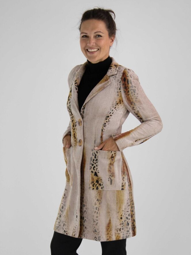 Een lange blazer van ML Collections in een camel kleur met een panter dessin in de stof geprint met meerdere tinten cognac en zwart. De blazer heeft een 2 knoops sluiting en is ongevoerd. Deze blazer mag niet worden gewassen.