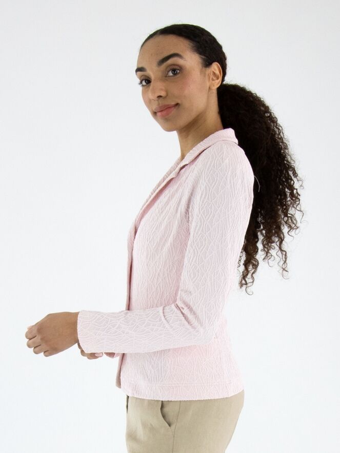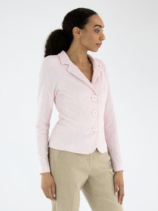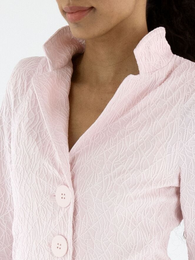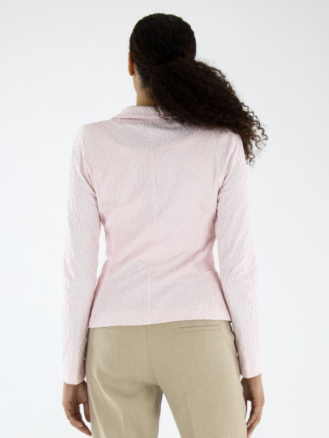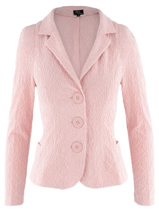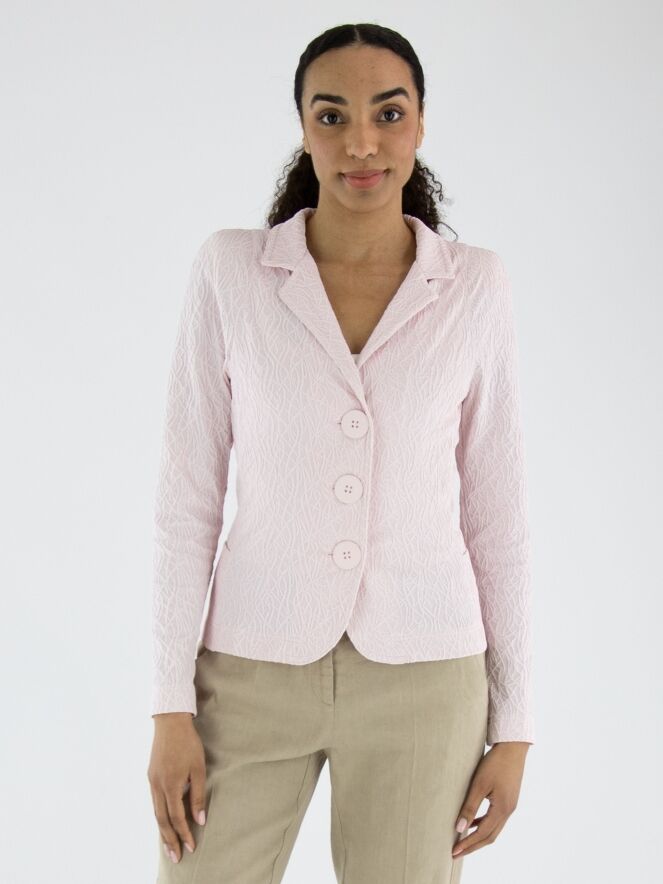 Een blazer van ML Collections met een sierlintjespatroon in pastelroze. De blazer heeft een sluiting met drie knopen en is ongevoerd. Deze blazer mag niet worden gewassen.