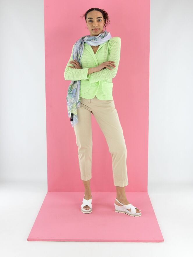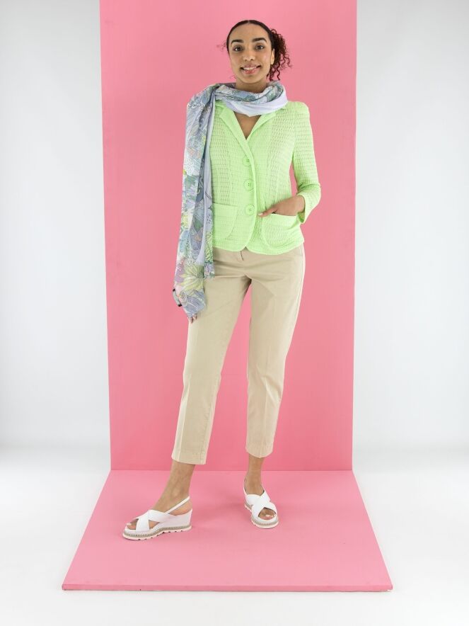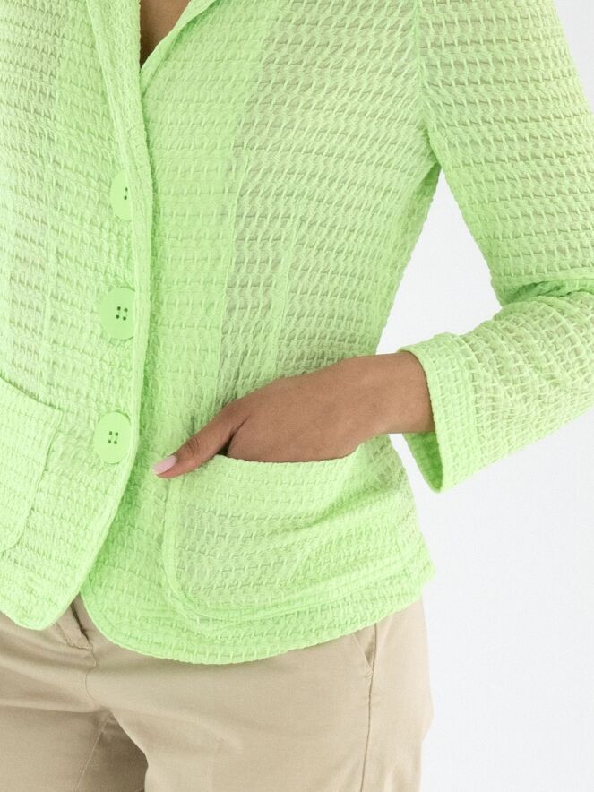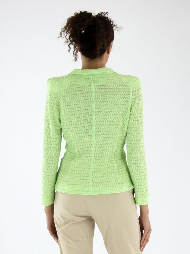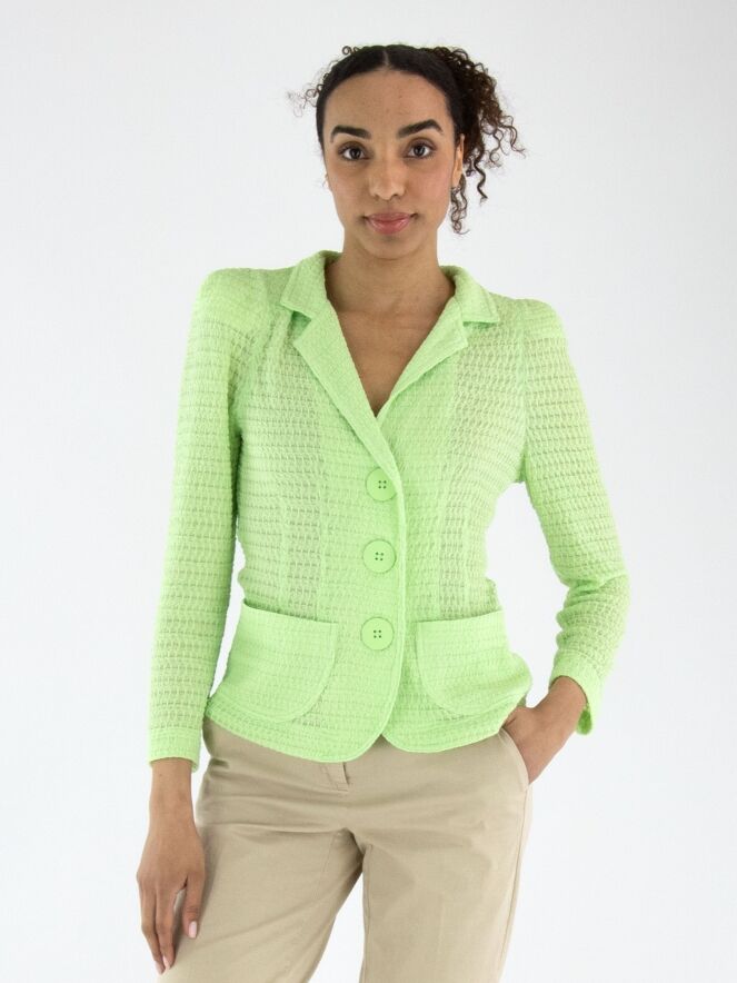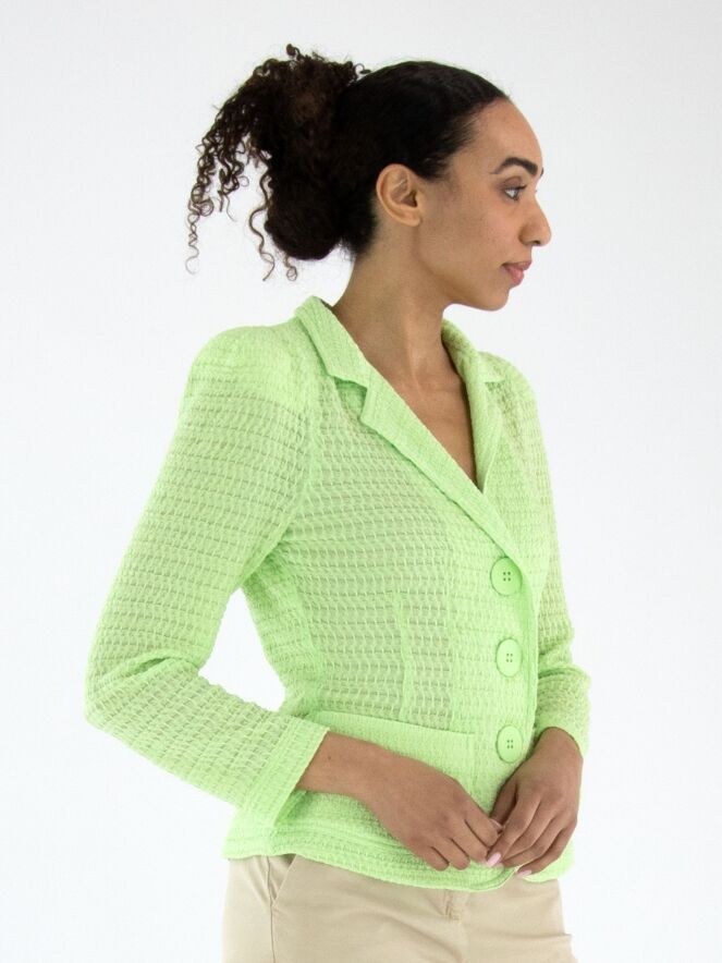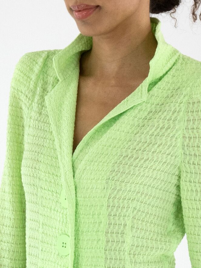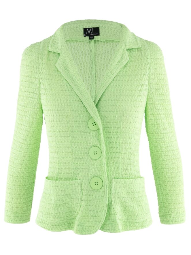 Een blazer van ML Collections met een gesmokte structuur in een frisse pistachegroene kleur. De blazer heeft een sluiting met drie knopen en is ongevoerd. Deze blazer mag niet worden gewassen.