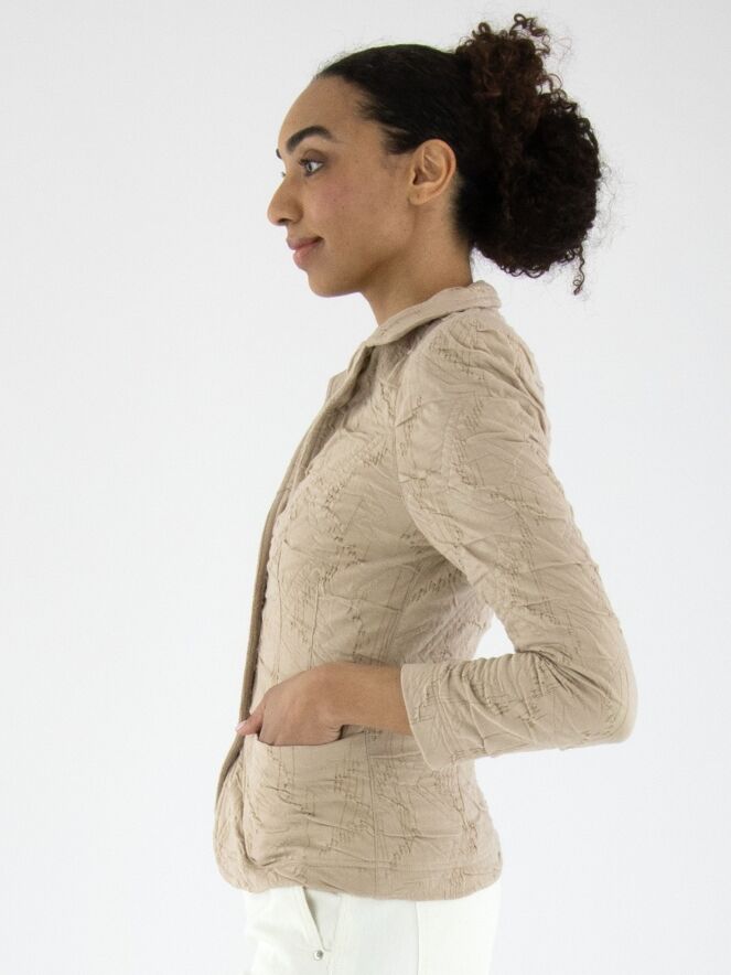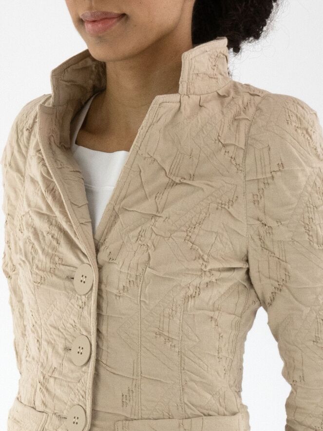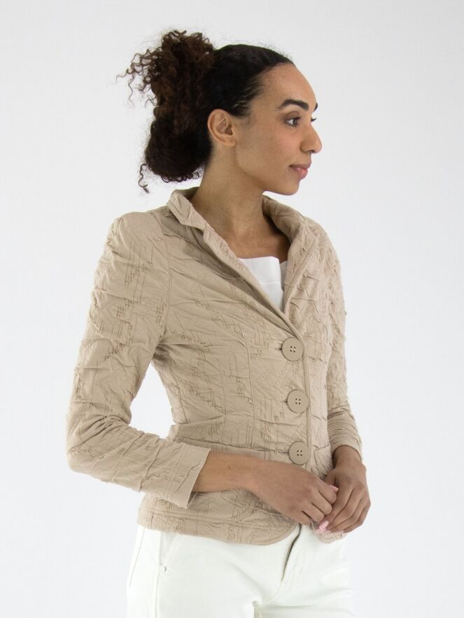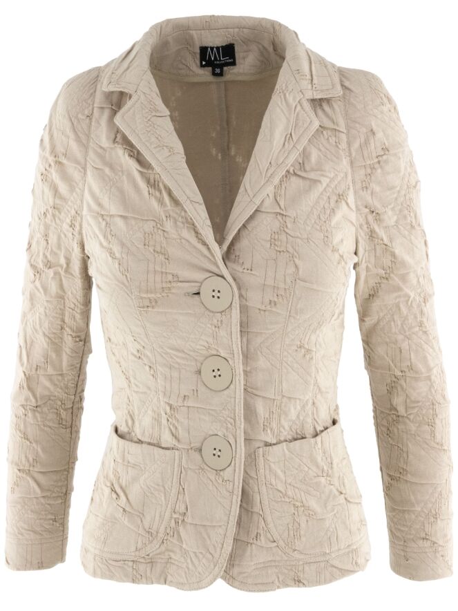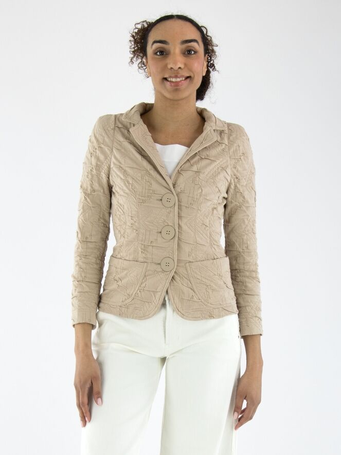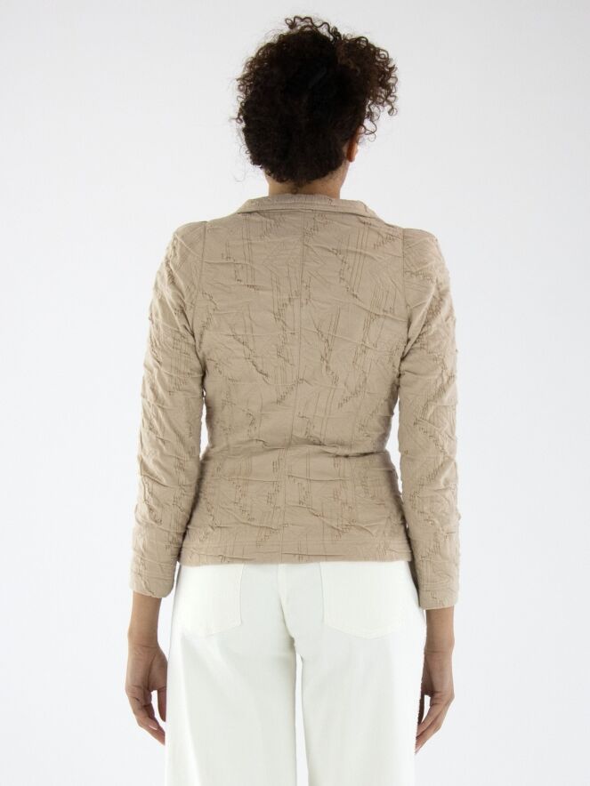 Een blazer van ML Collections in de kleur zand. De stof heeft een gesmokte structuur. De blazer is ongevoerd en heeft een sluiting met drie knopen. Deze blazer mag niet worden gewassen.