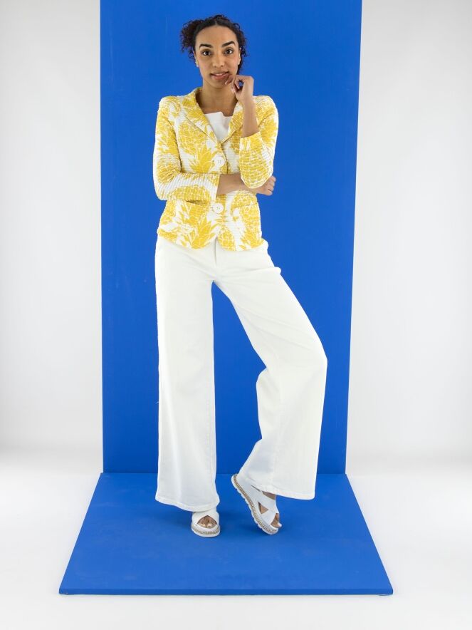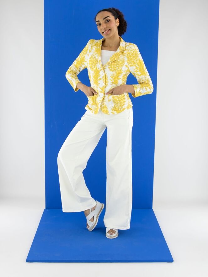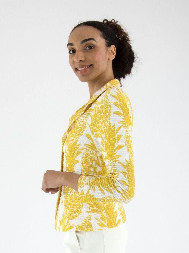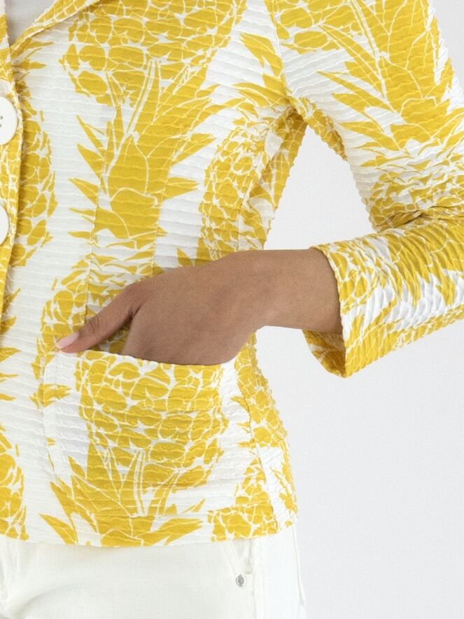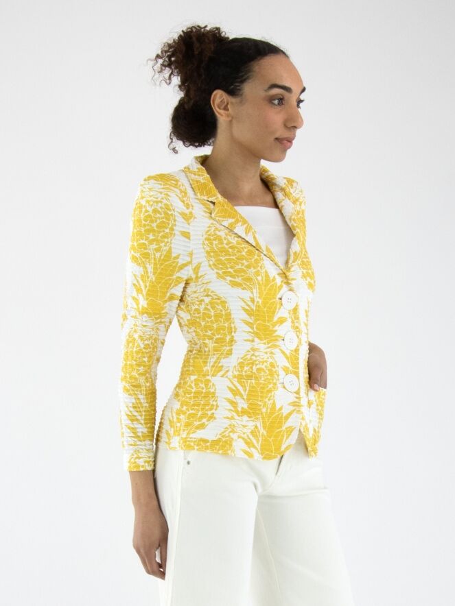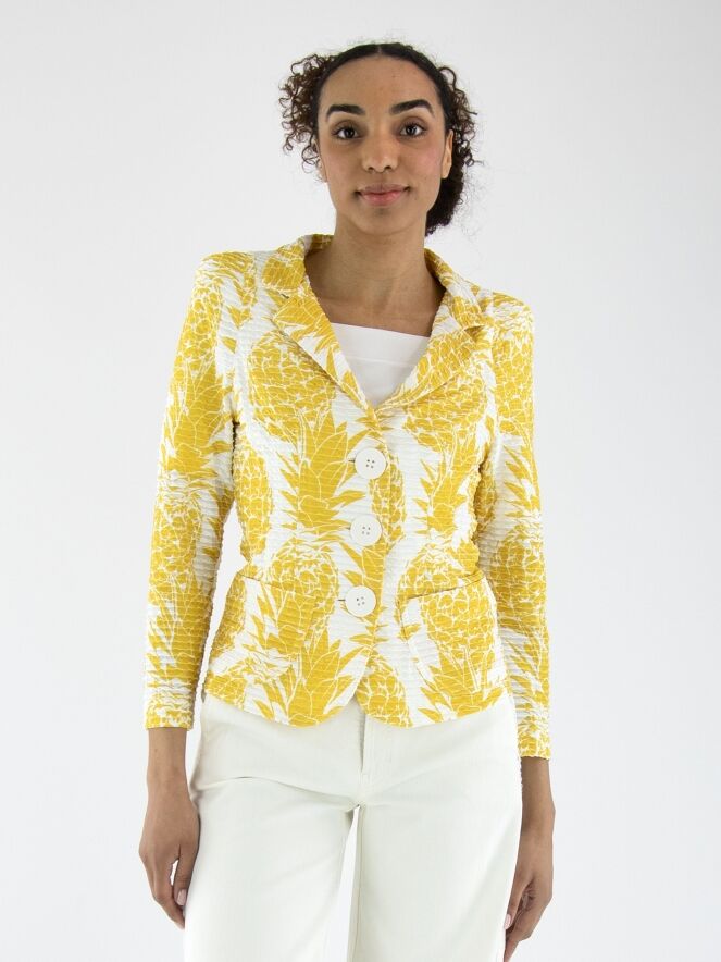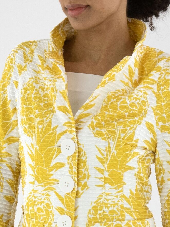 Een blazer van ML Collections met een ananasprint in geel op een witte achtergrond. De stof heeft een horizontale, geribbelde structuur. De blazer heeft een sluiting met drie knopen en is ongevoerd. Deze blazer mag niet worden gewassen.