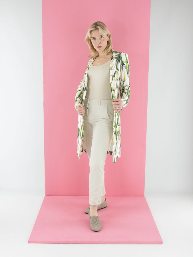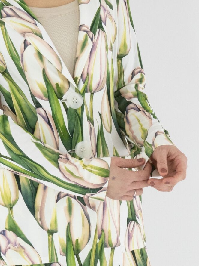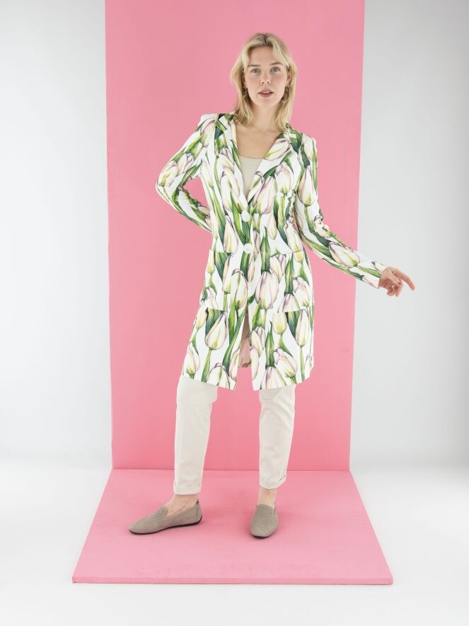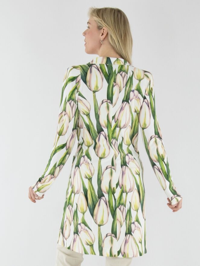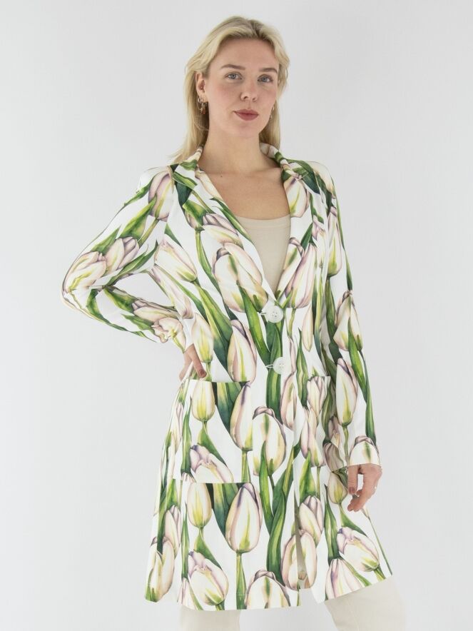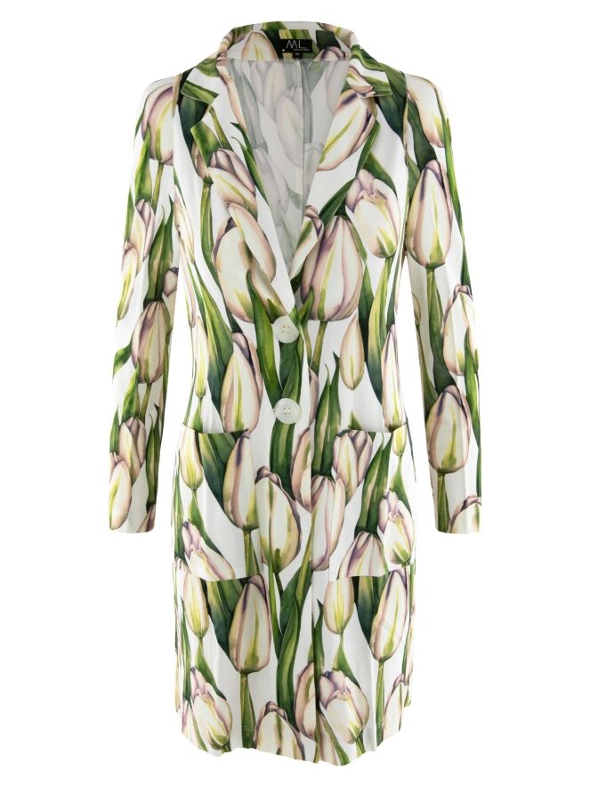Een lange blazer van ML Collections met een tulpenprint in meerdere tinten groen en roze op een witte achtergrond. De blazer heeft een 2-knoops sluiting en is ongevoerd. Deze blazer mag niet worden gewassen.