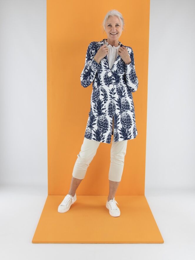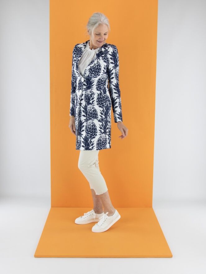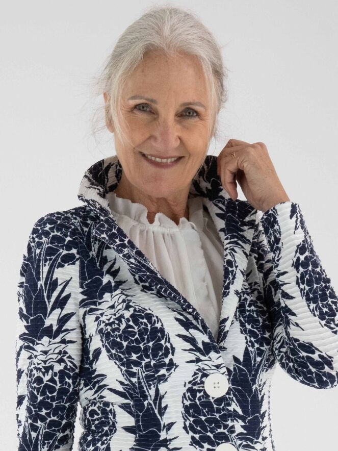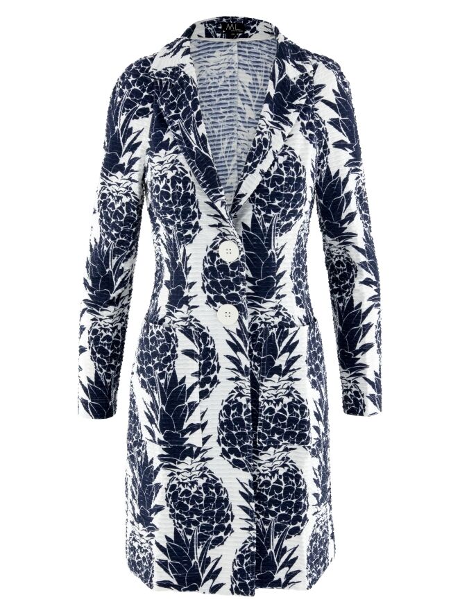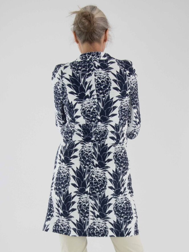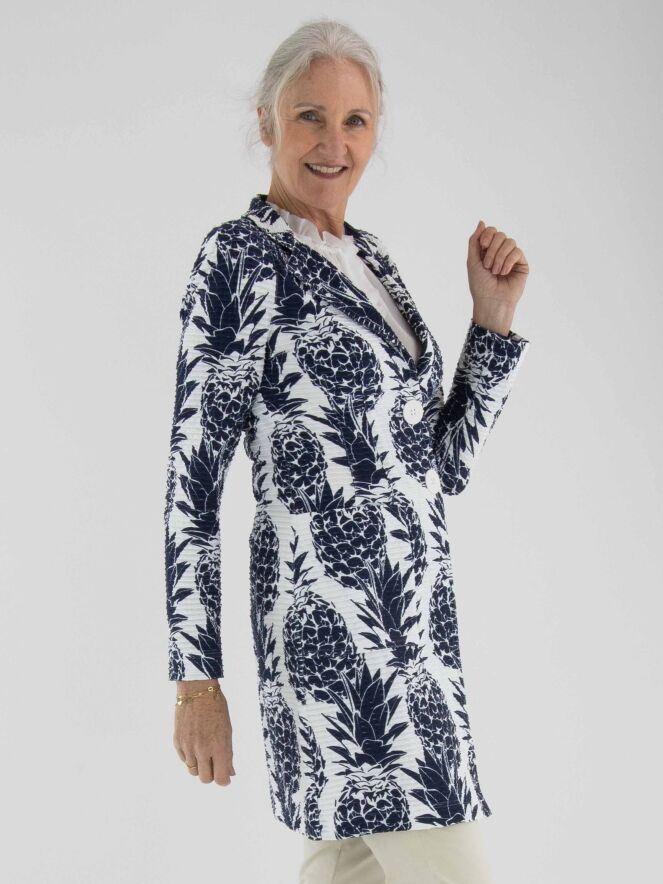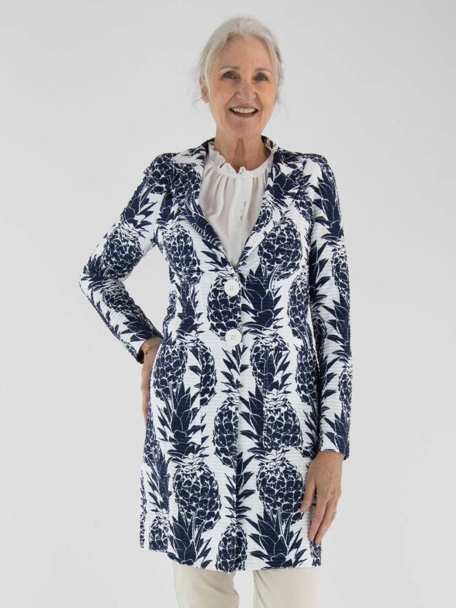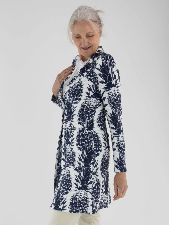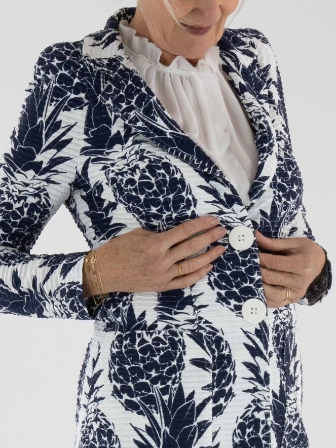 Een lange blazer van ML Collections met een ananasprint in marineblauw op een witte achtergrond. De stof heeft een horizontale, geribbelde structuur. De blazer heeft een tweeknoopssluiting en is ongevoerd. Deze blazer mag niet worden gewassen.