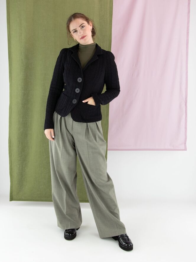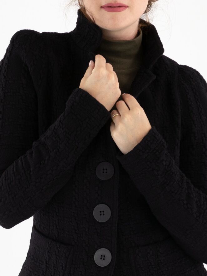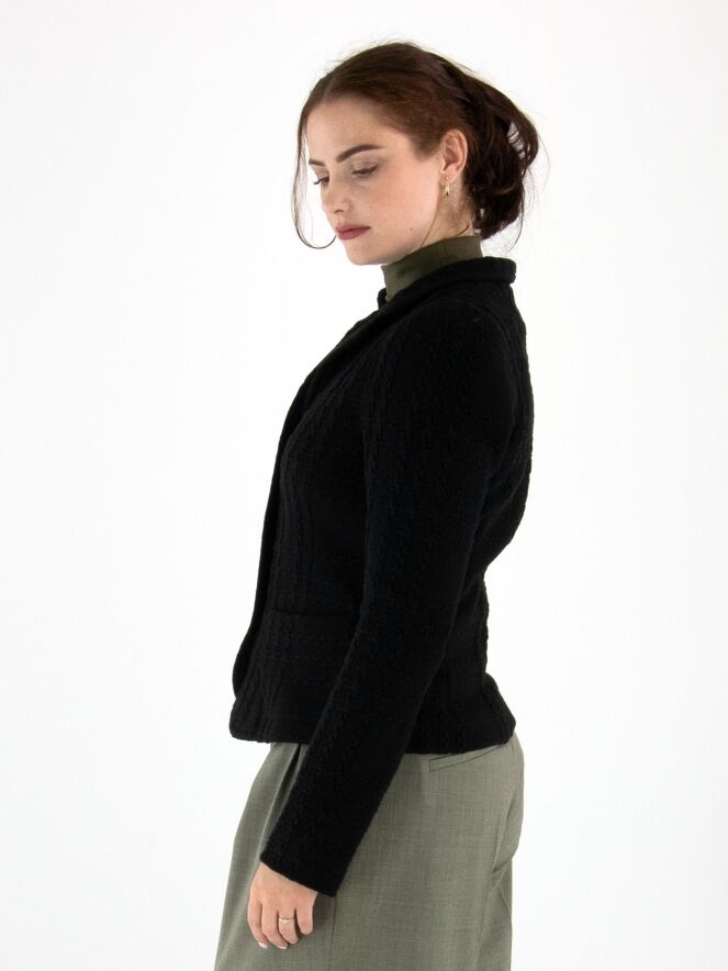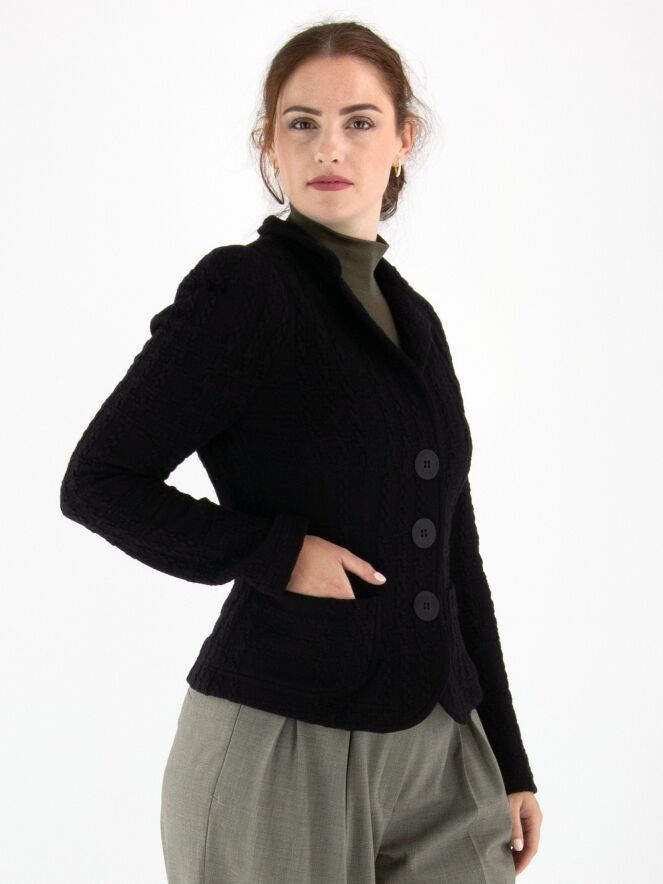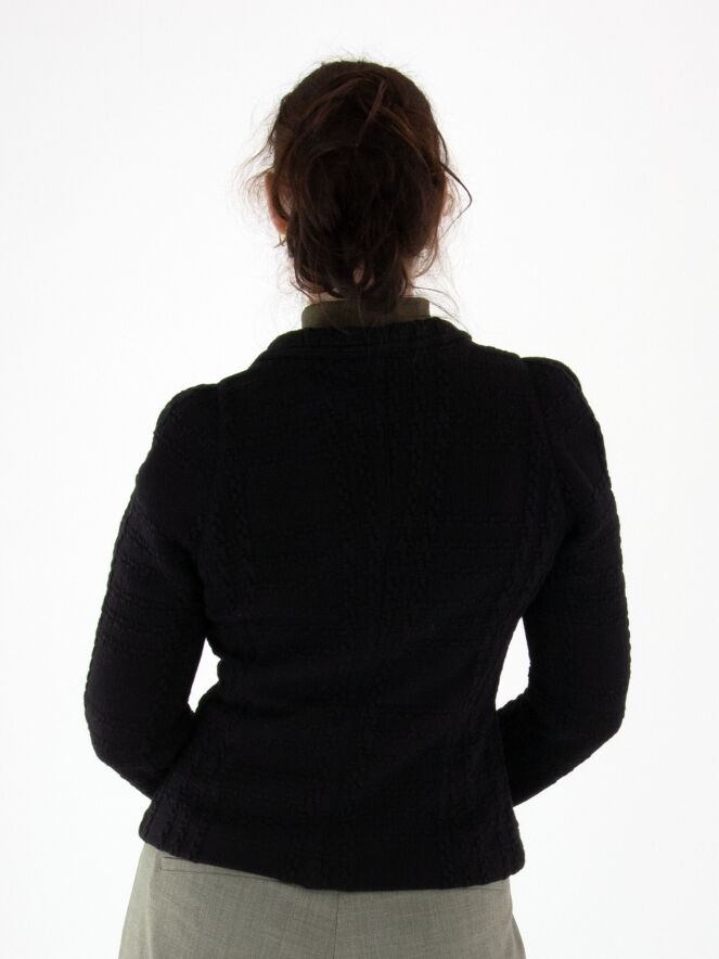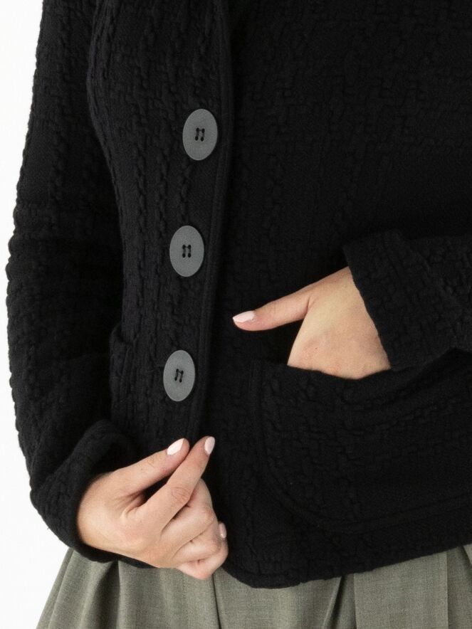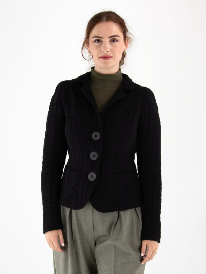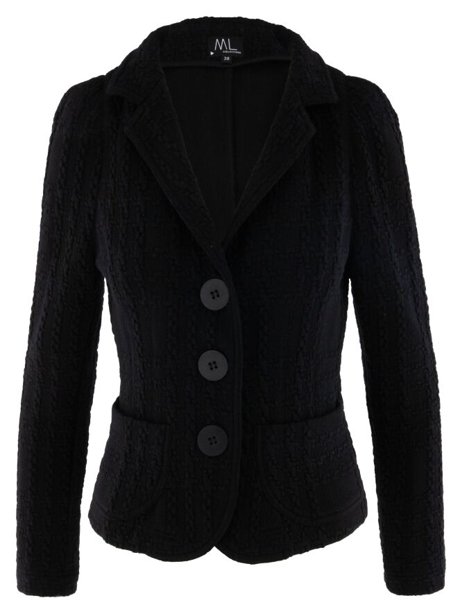 Een blazer van ML Collections in de kleur zwart. De stof heeft een structuur van verticale en horizontale lijnen en is ongevoerd. De sluiting bestaat uit drie knopen. Deze blazer mag niet worden gewassen.