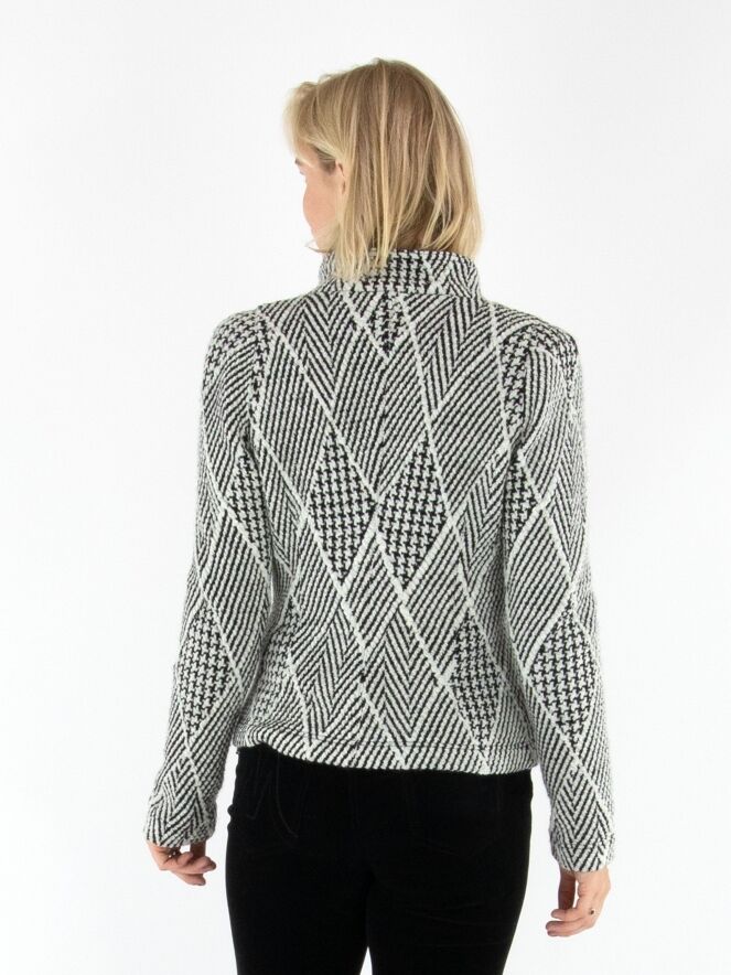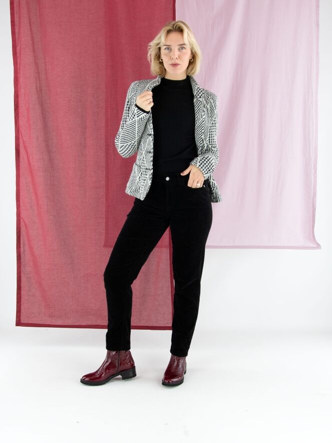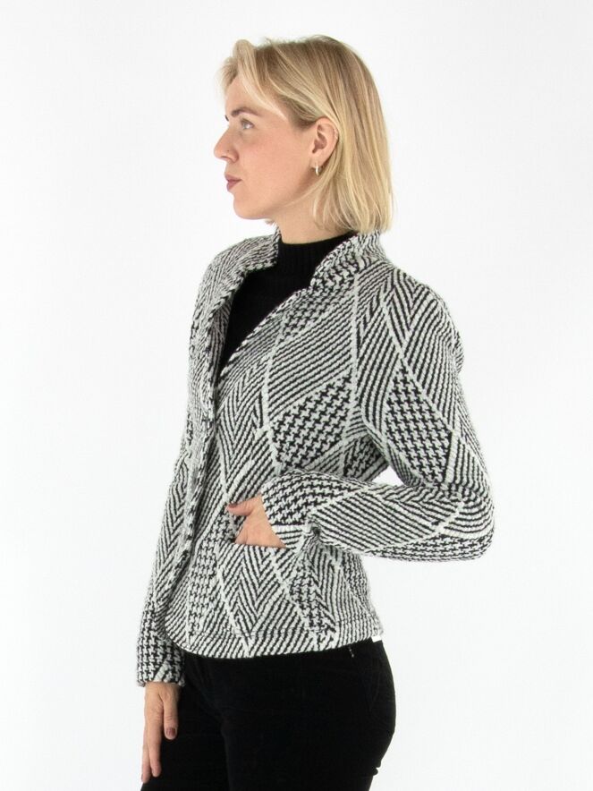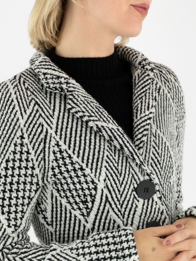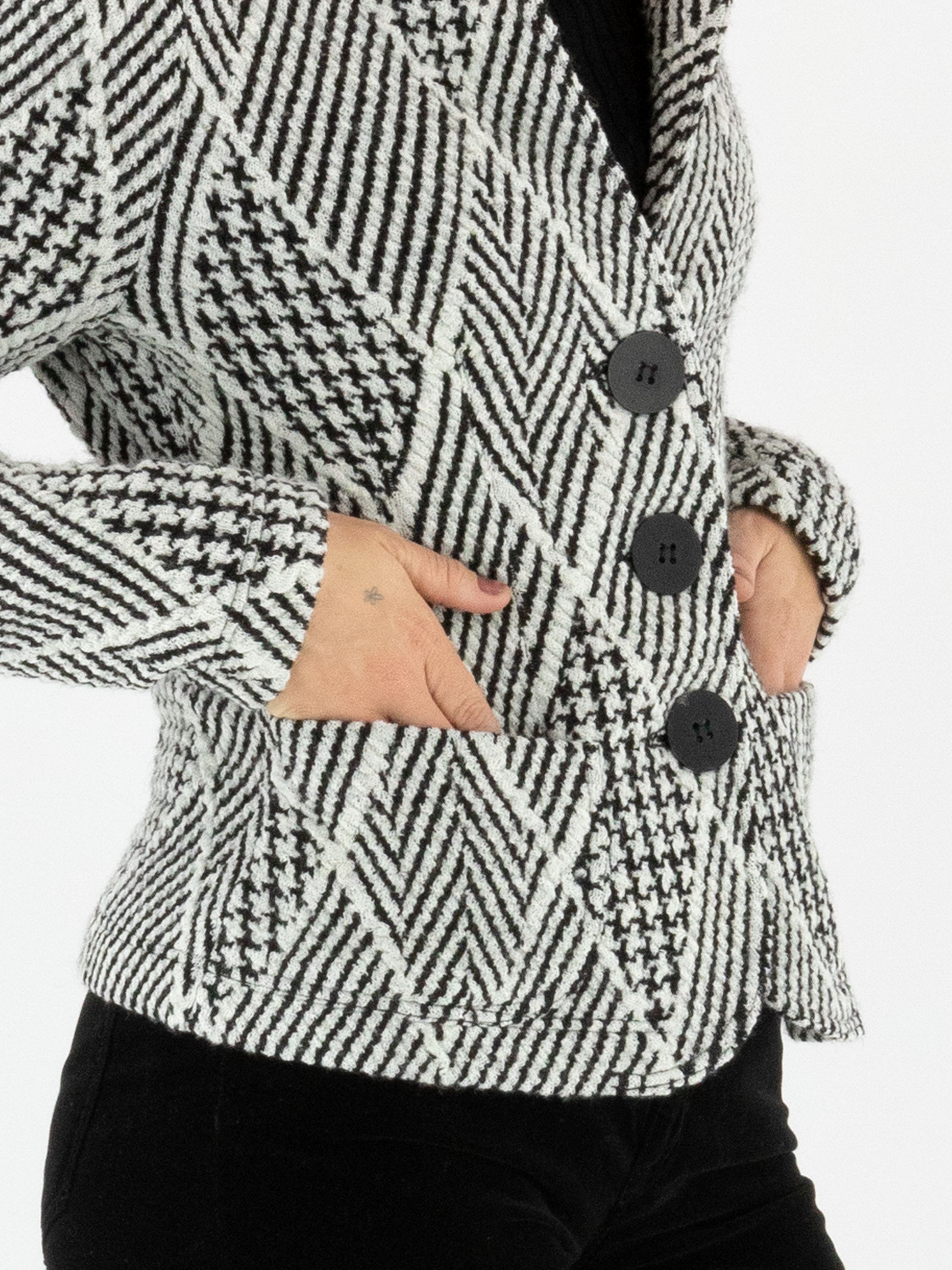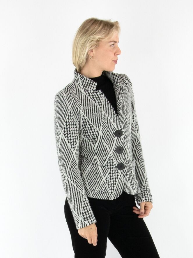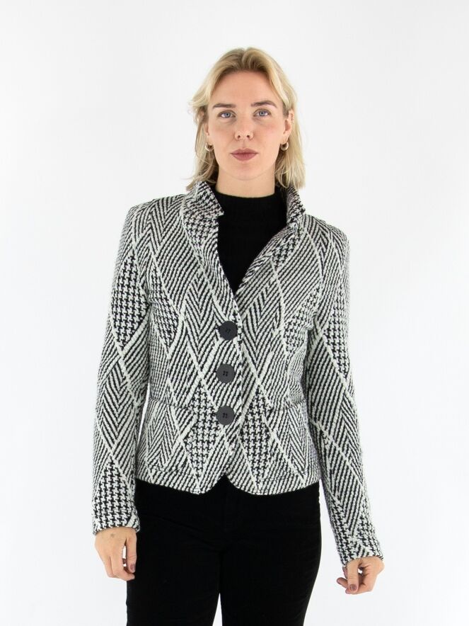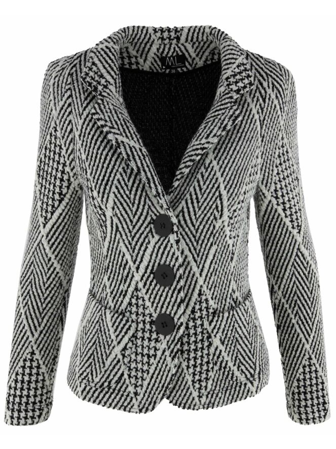 Een blazer van ML Collections in een stof met meerdere structuren, waaronder een visgraatpatroon, een pied-de-coq en een ruitmotief. De dessins zijn uitgevoerd in roomwit en zwart, wat de blazer een luxe en grafische uitstraling geeft. Het model sluit met drie knopen en is ongevoerd. Deze blazer mag niet worden gewassen.