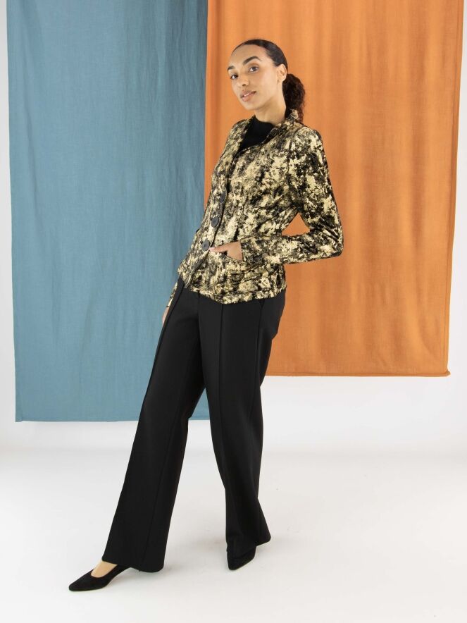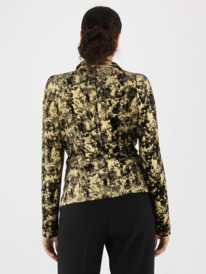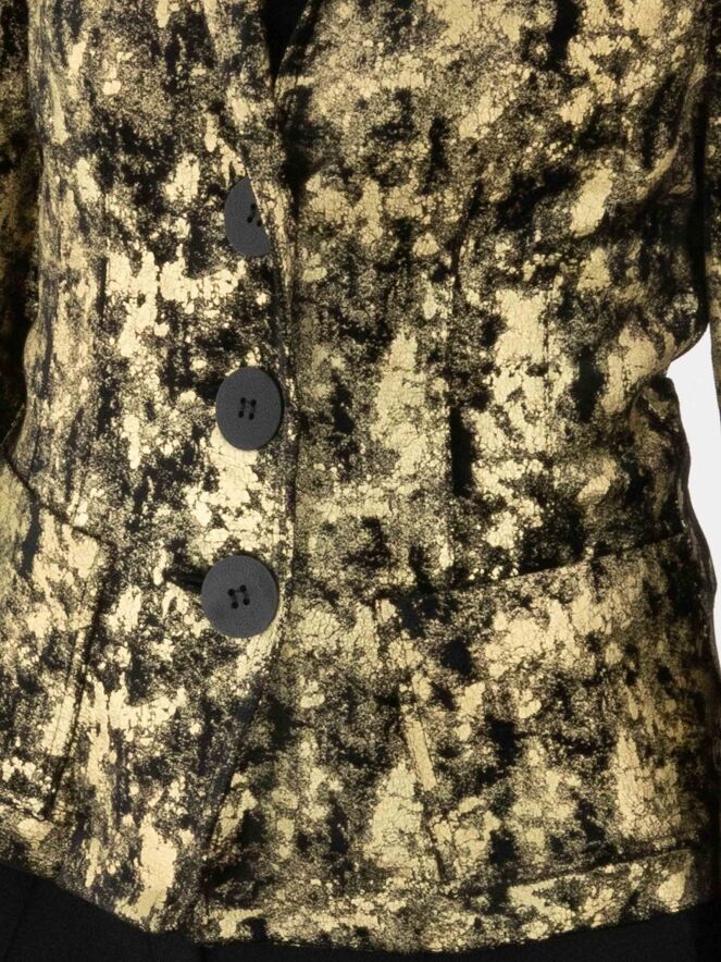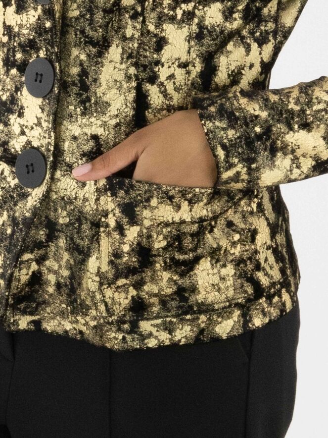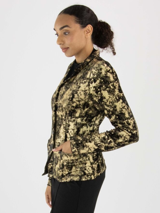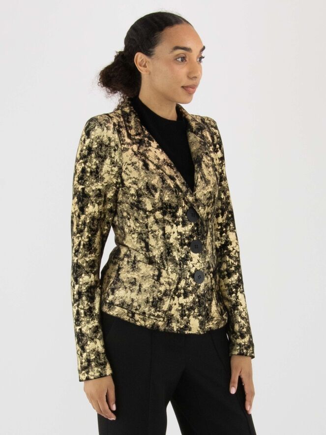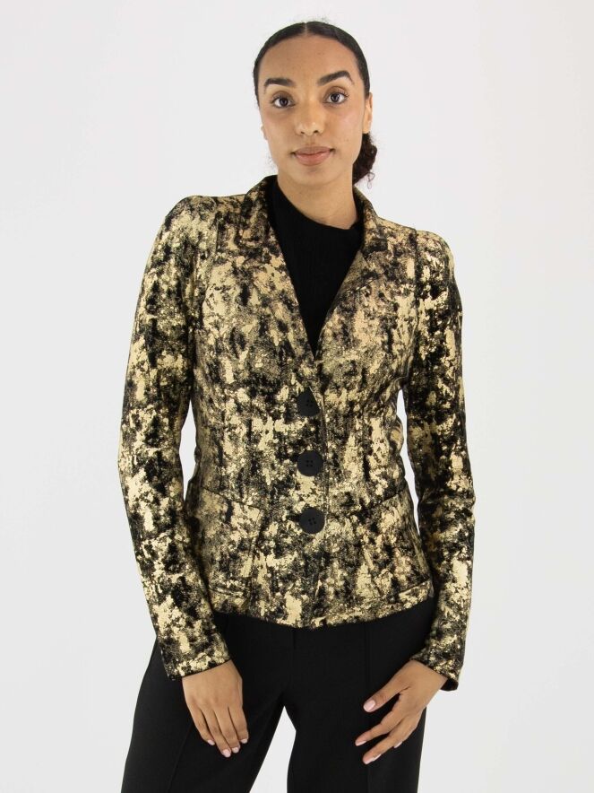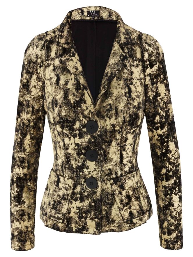 Een velours blazer van ML Collections in een grafische print met de kleuren goud en zwart. De blazer heeft een drieknoopssluiting en is ongevoerd. Deze blazer mag niet worden gewassen.