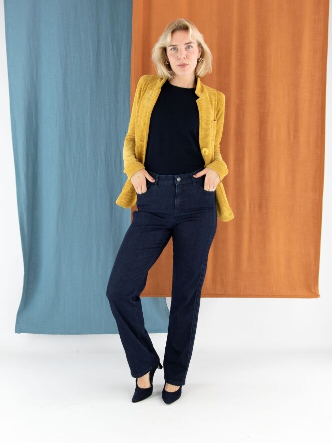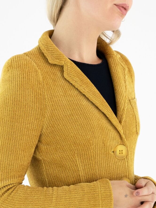 Blazer van ML Collections in stijlvol okergeel. Deze exclusieve damesblazer is uitgevoerd in een luxueuze ribcordkwaliteit en is ongevoerd, waardoor hij een soepele en elegante uitstraling heeft. Met een sluiting van drie knopen benadrukt dit designerstuk een tijdloze, vrouwelijke pasvorm. Voor langdurig draagplezier en behoud van kwaliteit adviseren wij de blazer niet te wassen.