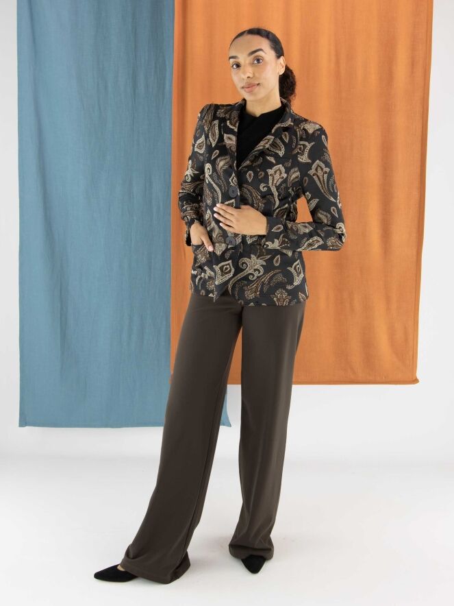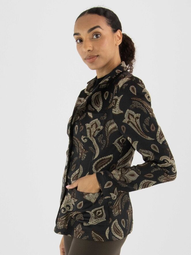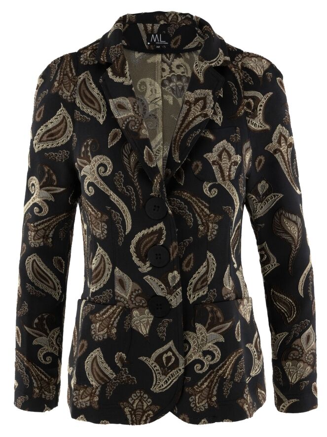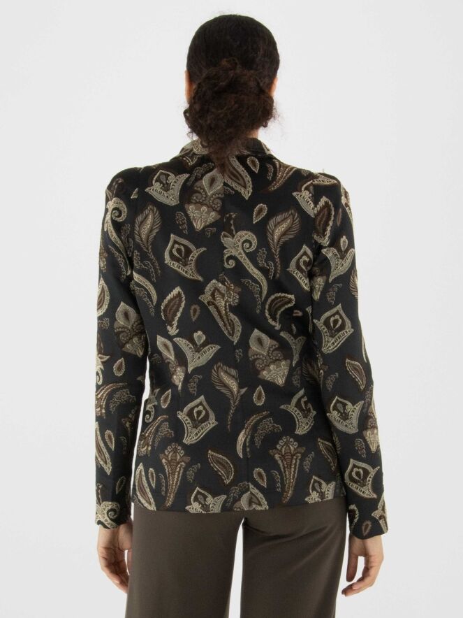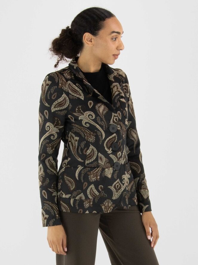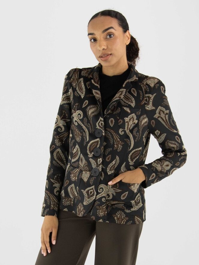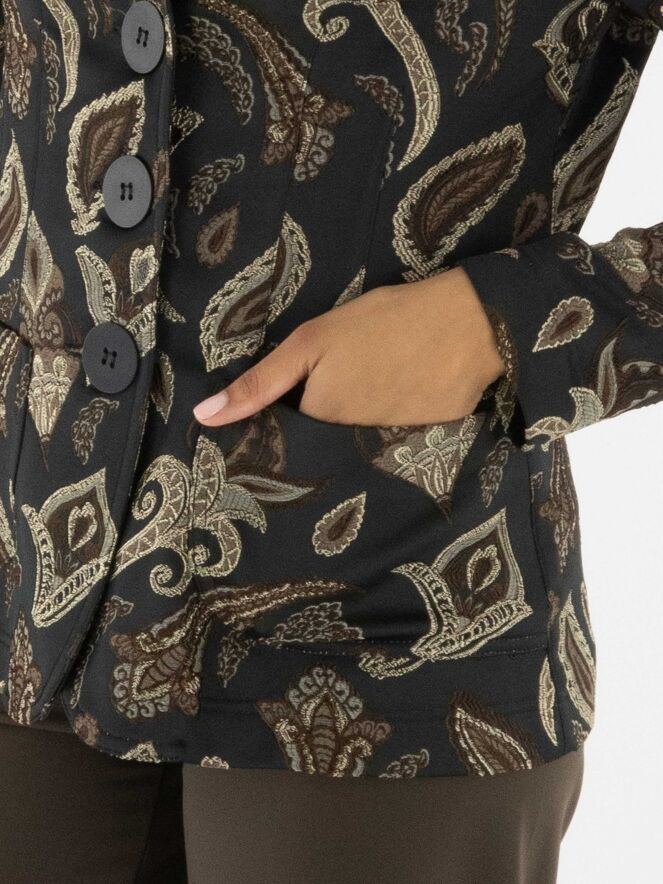 Een blazer van ML Collections in een jacquardprint met meerdere bruintinten en goud op een zwarte achtergrond. De blazer heeft een drieknoopssluiting en is ongevoerd. Deze blazer mag niet worden gewassen.