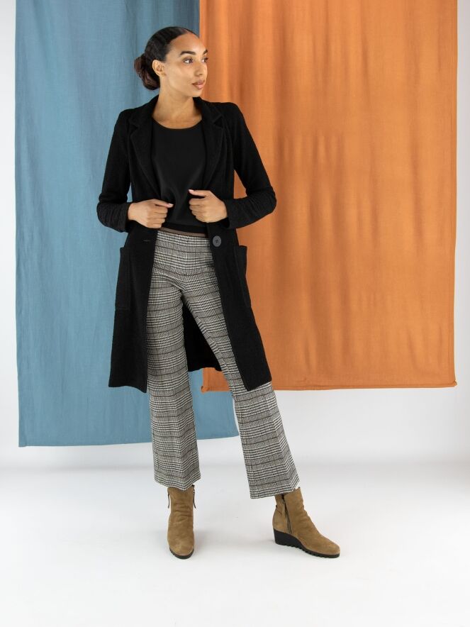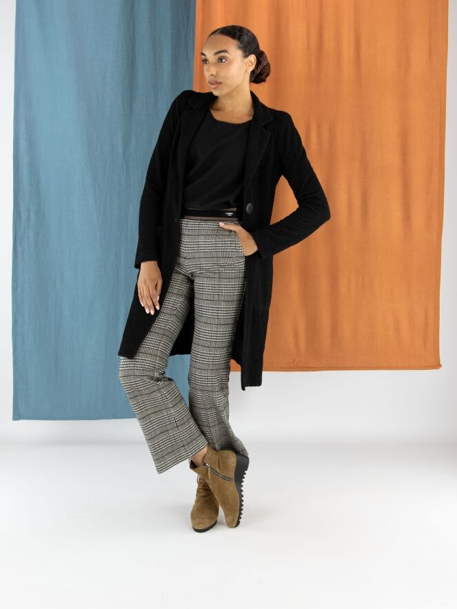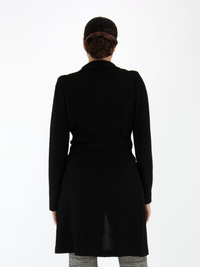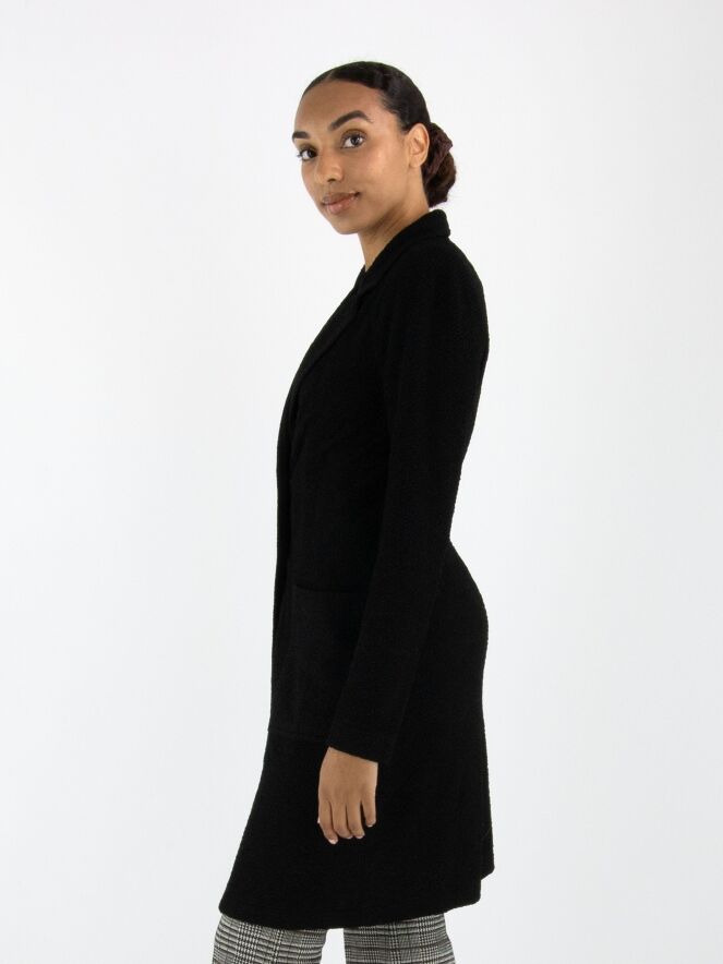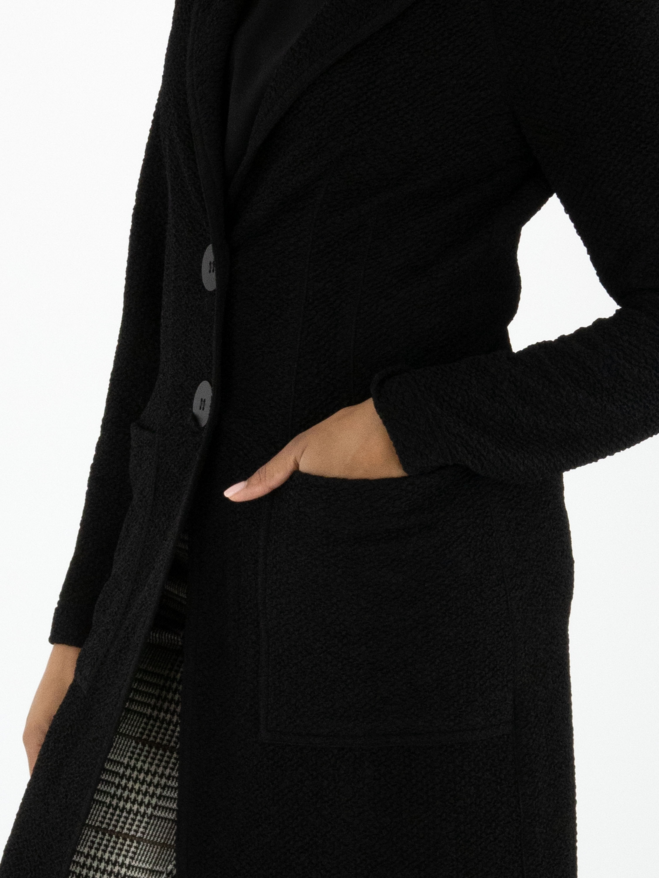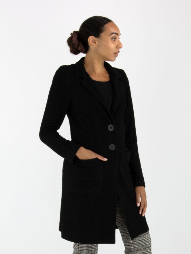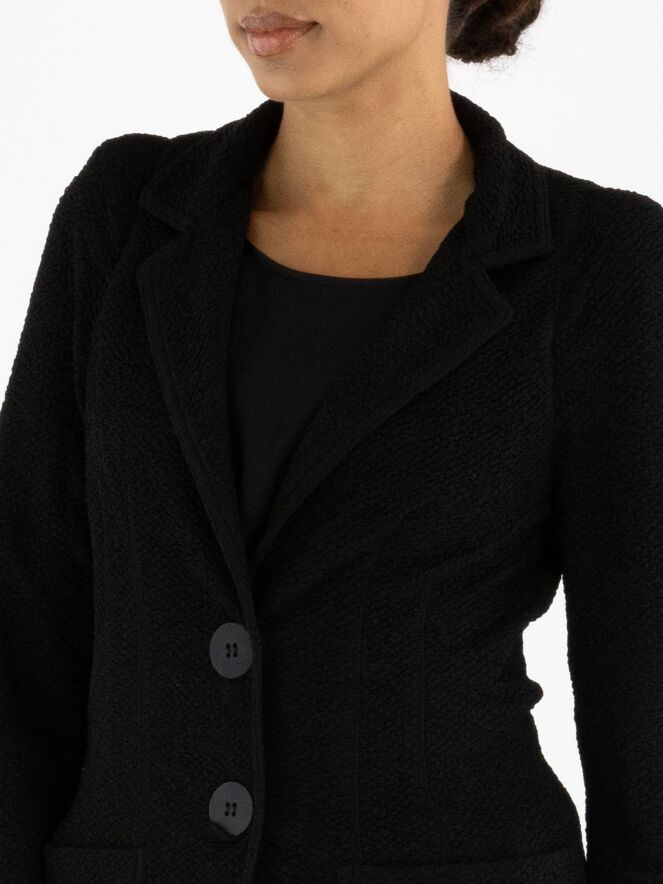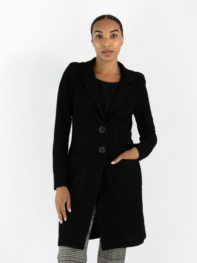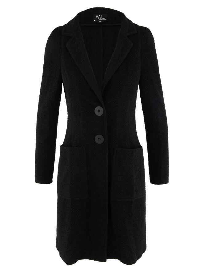 Een lange blazer van ML Collections in de kleur zwart. De stof heeft een fijne bobbelstructuur en is ongevoerd. De sluiting bestaat uit twee knopen. Deze blazer mag niet worden gewassen.