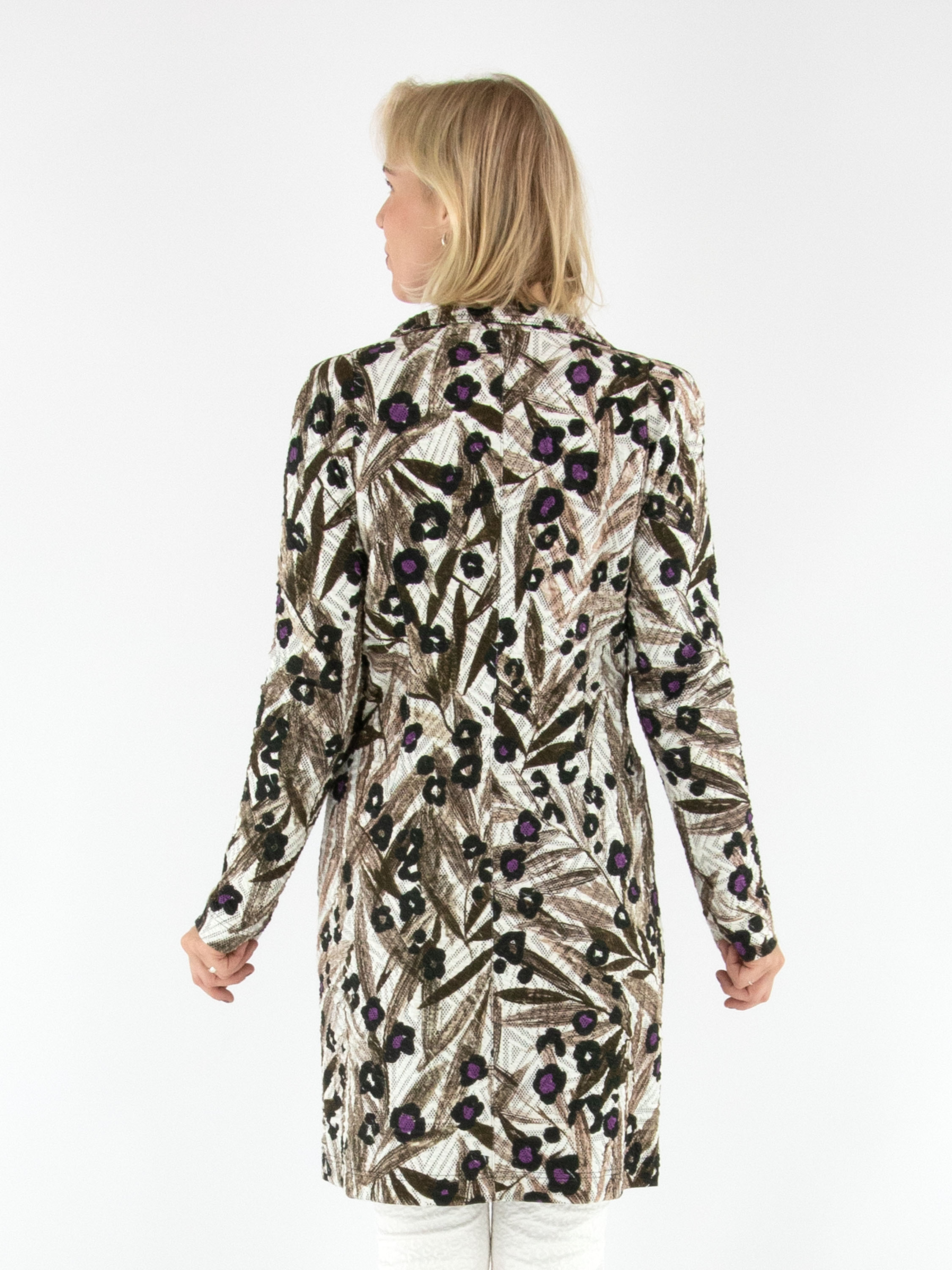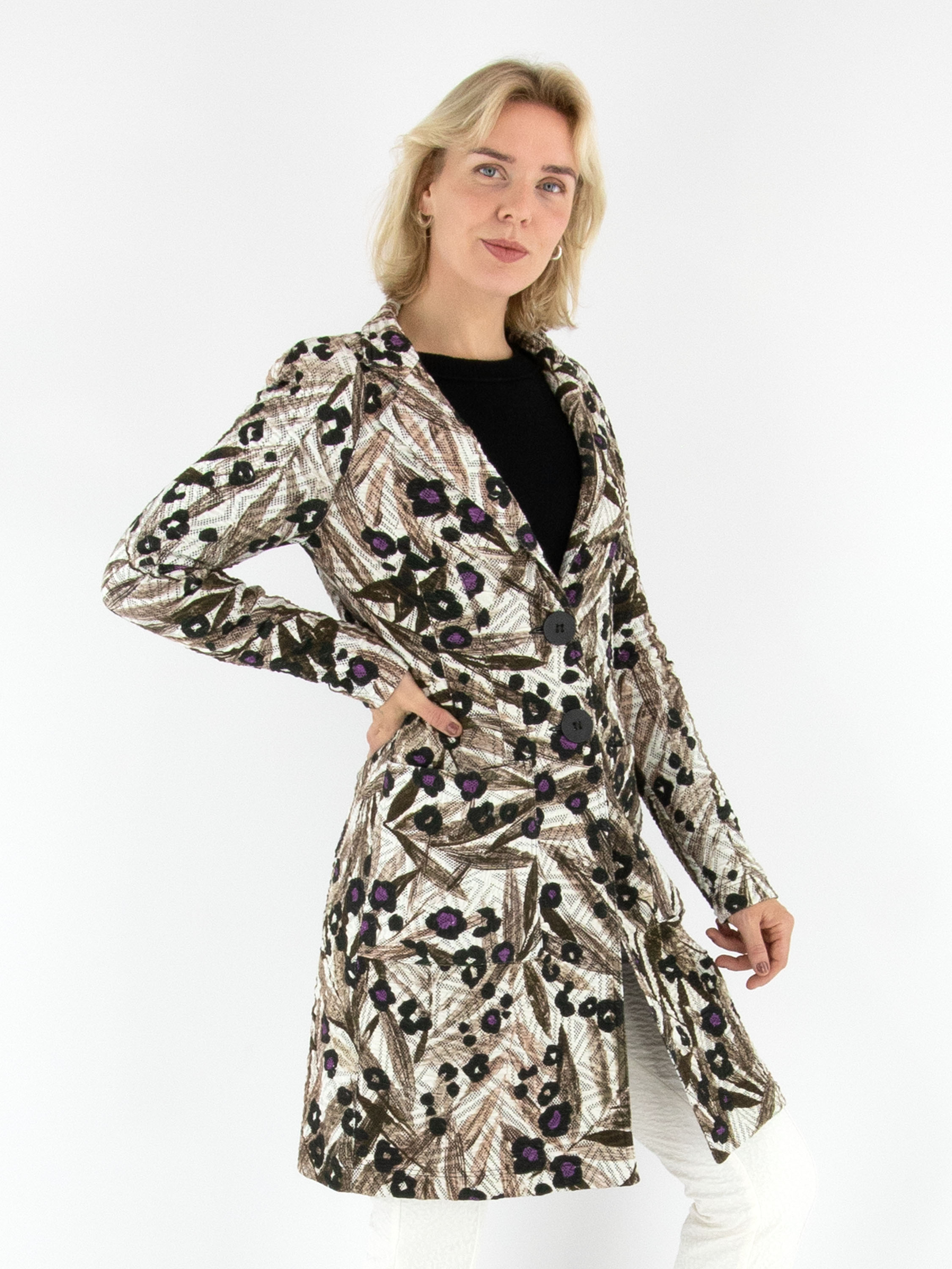Lange blazer van ML Collections met een verfijnde bladeren- en bloemenprint in paars en zwart, op een roomwitte achtergrond met warme bruintinten. Deze stijlvolle damesblazer is ongevoerd en sluit met twee knopen, waardoor hij een elegante en vloeiende pasvorm heeft. Voor langdurig draagplezier adviseren wij de blazer niet te wassen.