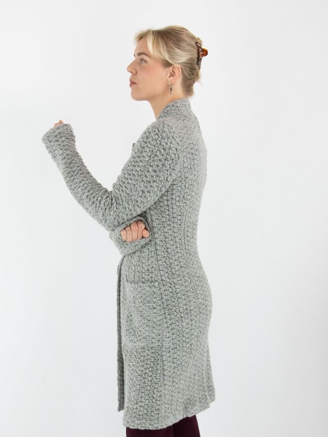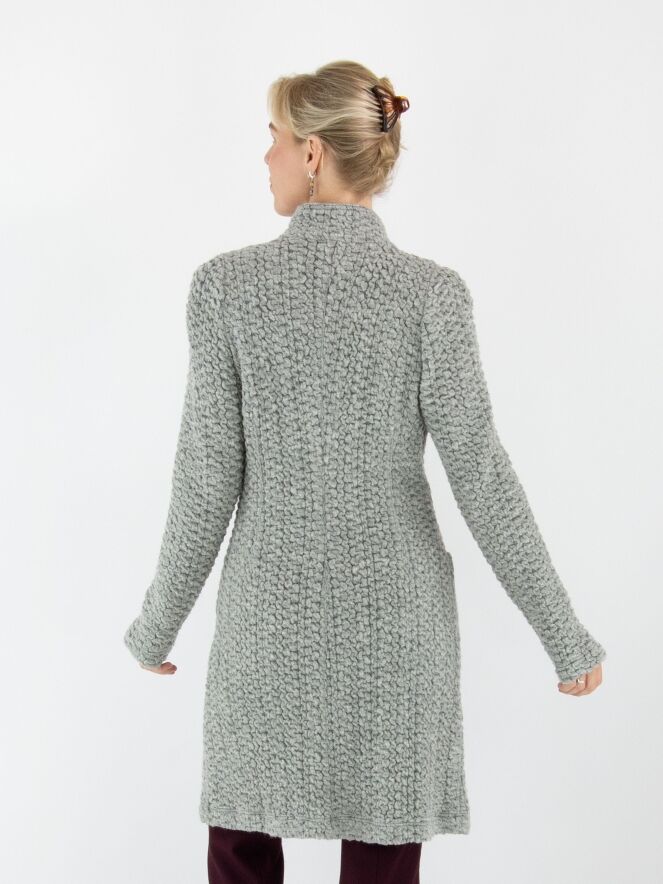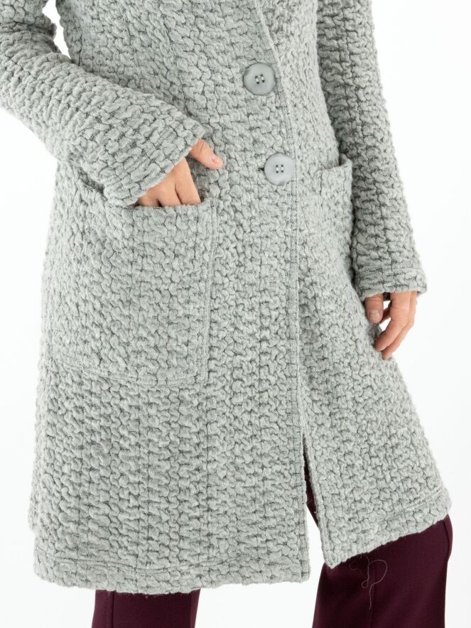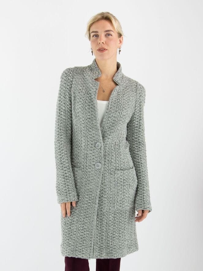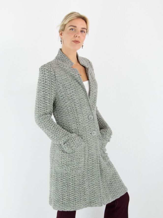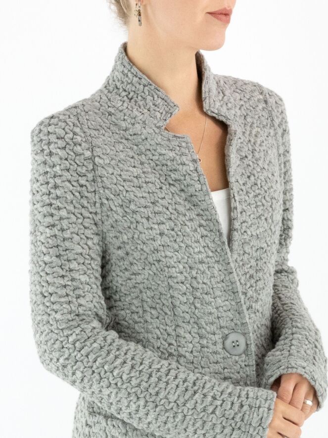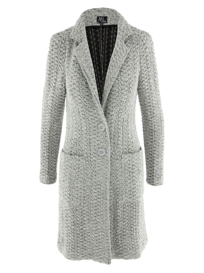 Een lange blazer van ML Collections in een lichtgrijze kleur met een gesmokte structuur. De blazer heeft een sluiting met twee knopen en is ongevoerd. Deze blazer mag niet worden gewassen.