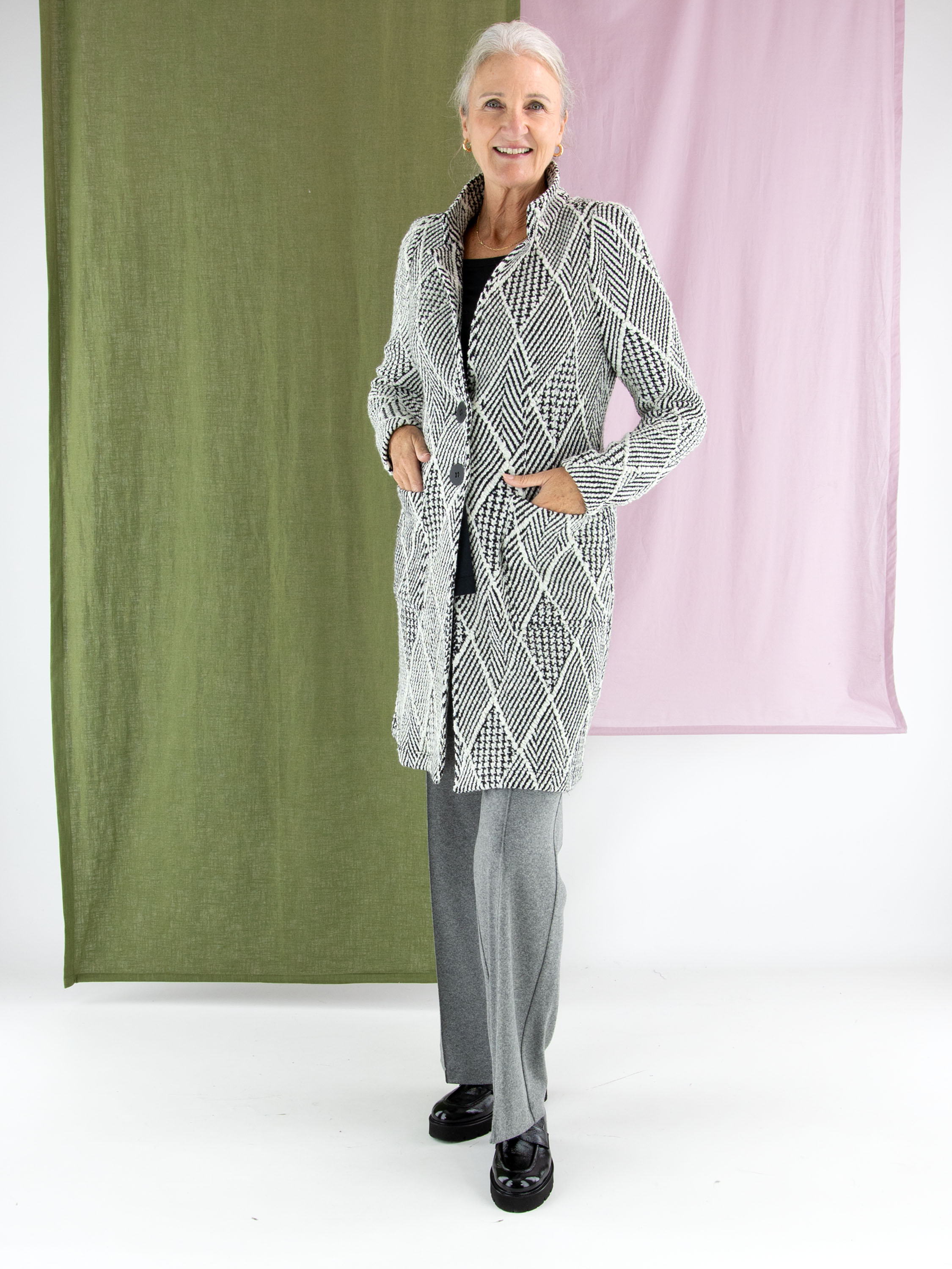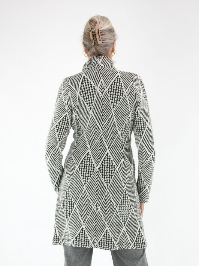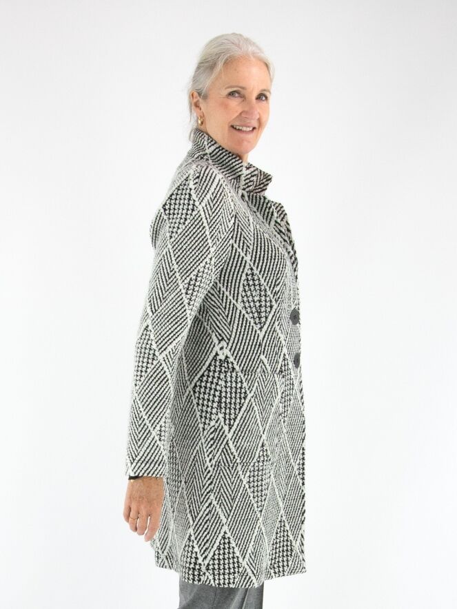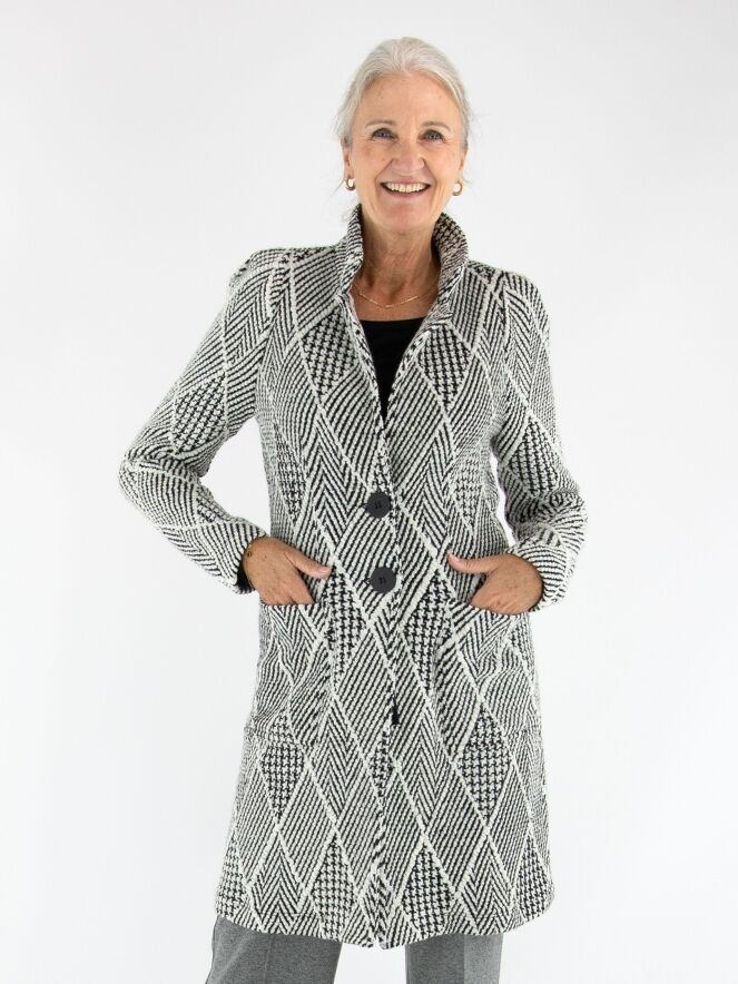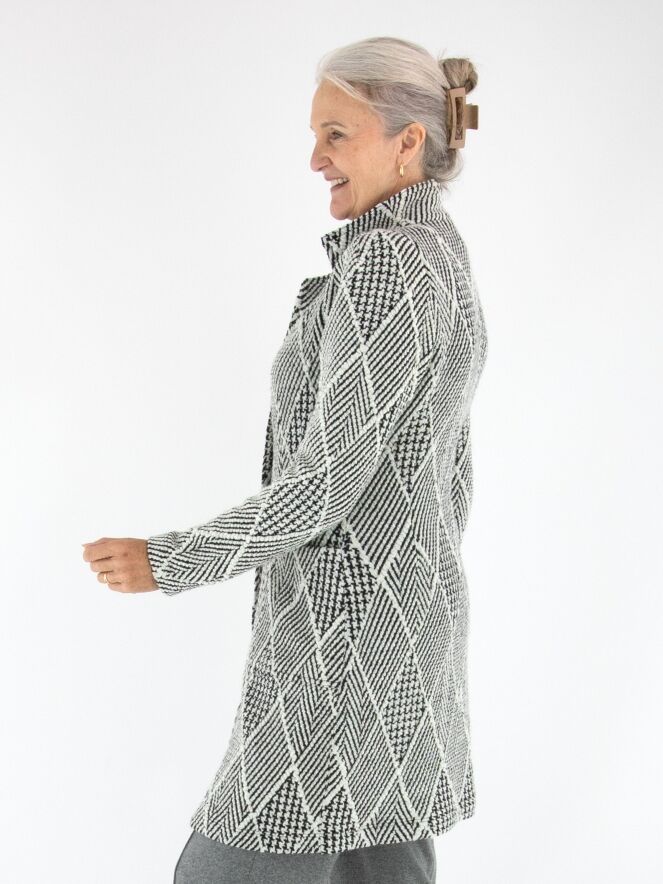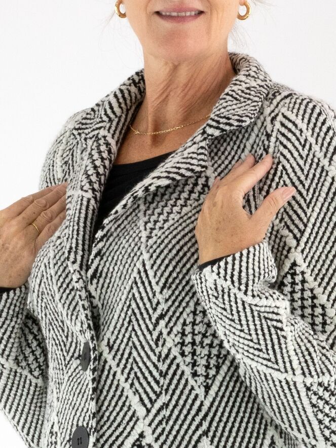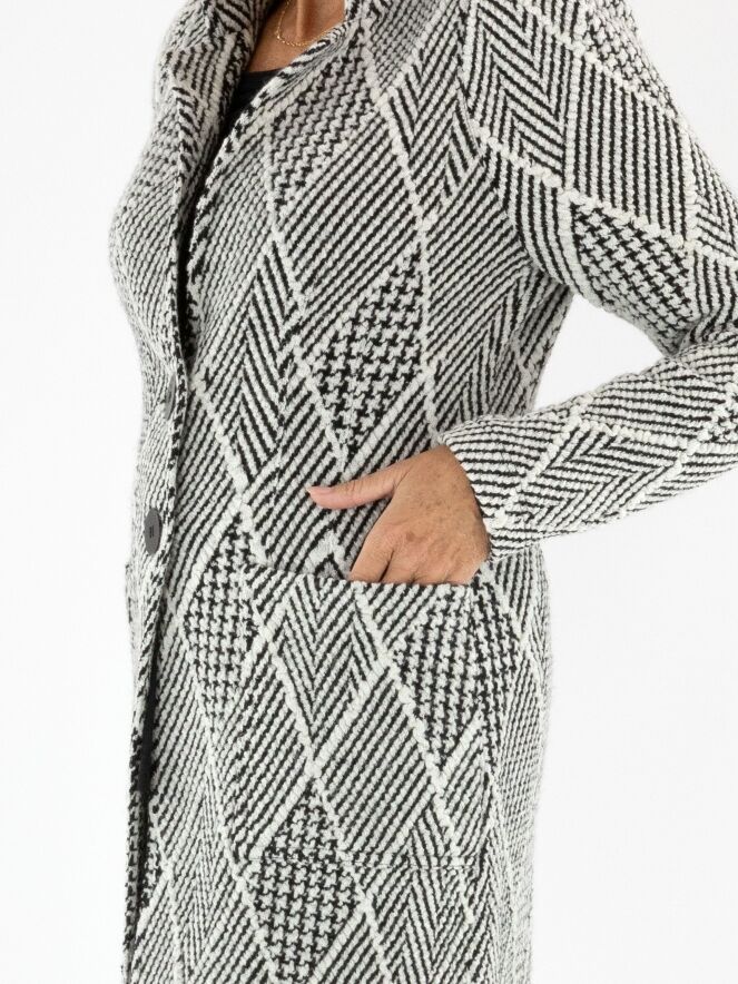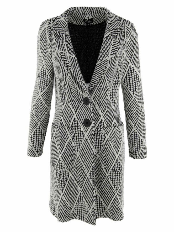 Een lange blazer van ML Collections, uitgevoerd in een bijzondere stof met meerdere structuren, waaronder een visgraatpatroon, een pied-de-coq en een ruitmotief. De dessins zijn gecombineerd in roomwit en zwart, wat zorgt voor een grafische en stijlvolle uitstraling. De blazer sluit met twee knopen en is ongevoerd. Deze blazer mag niet worden gewassen.