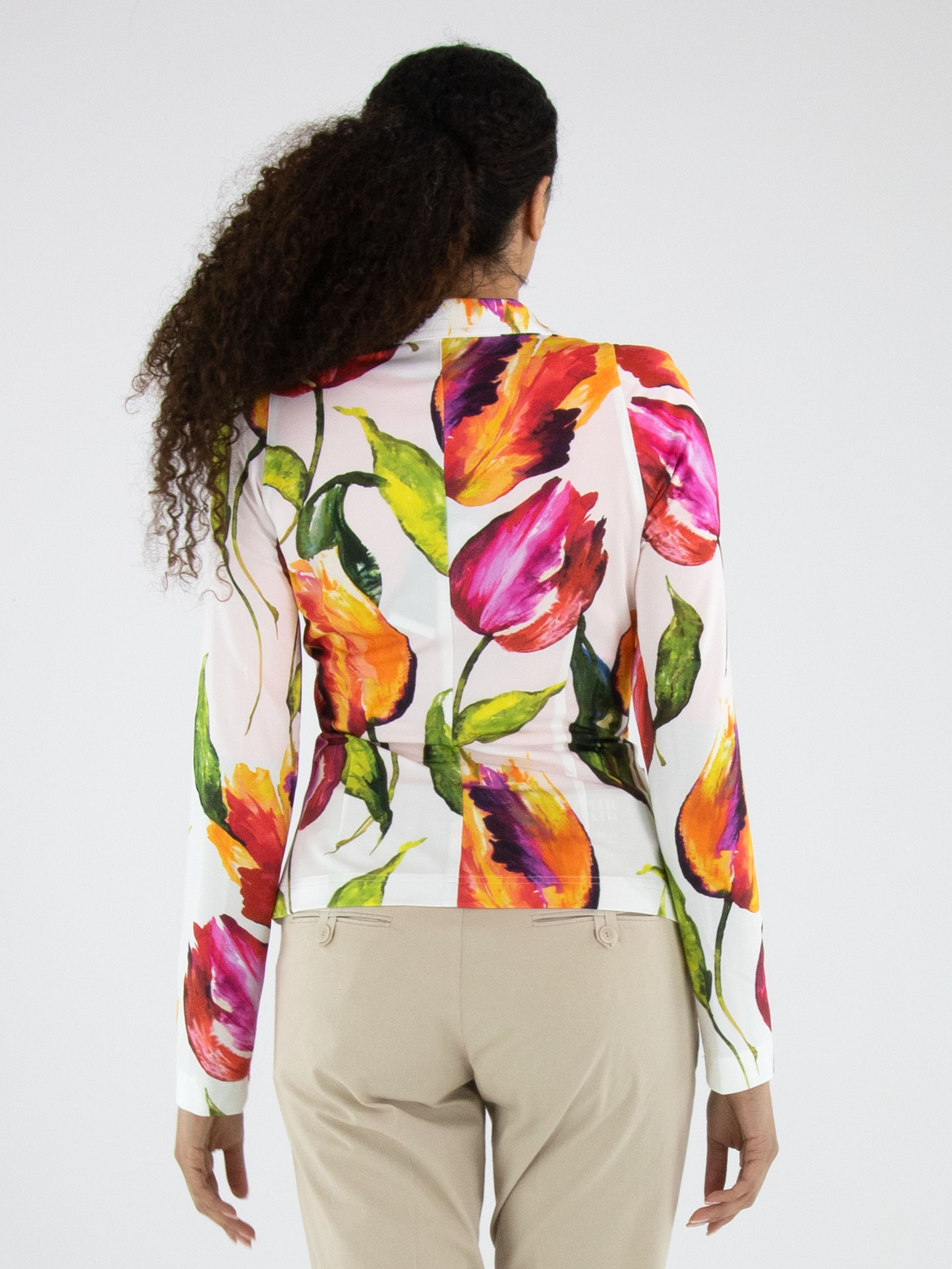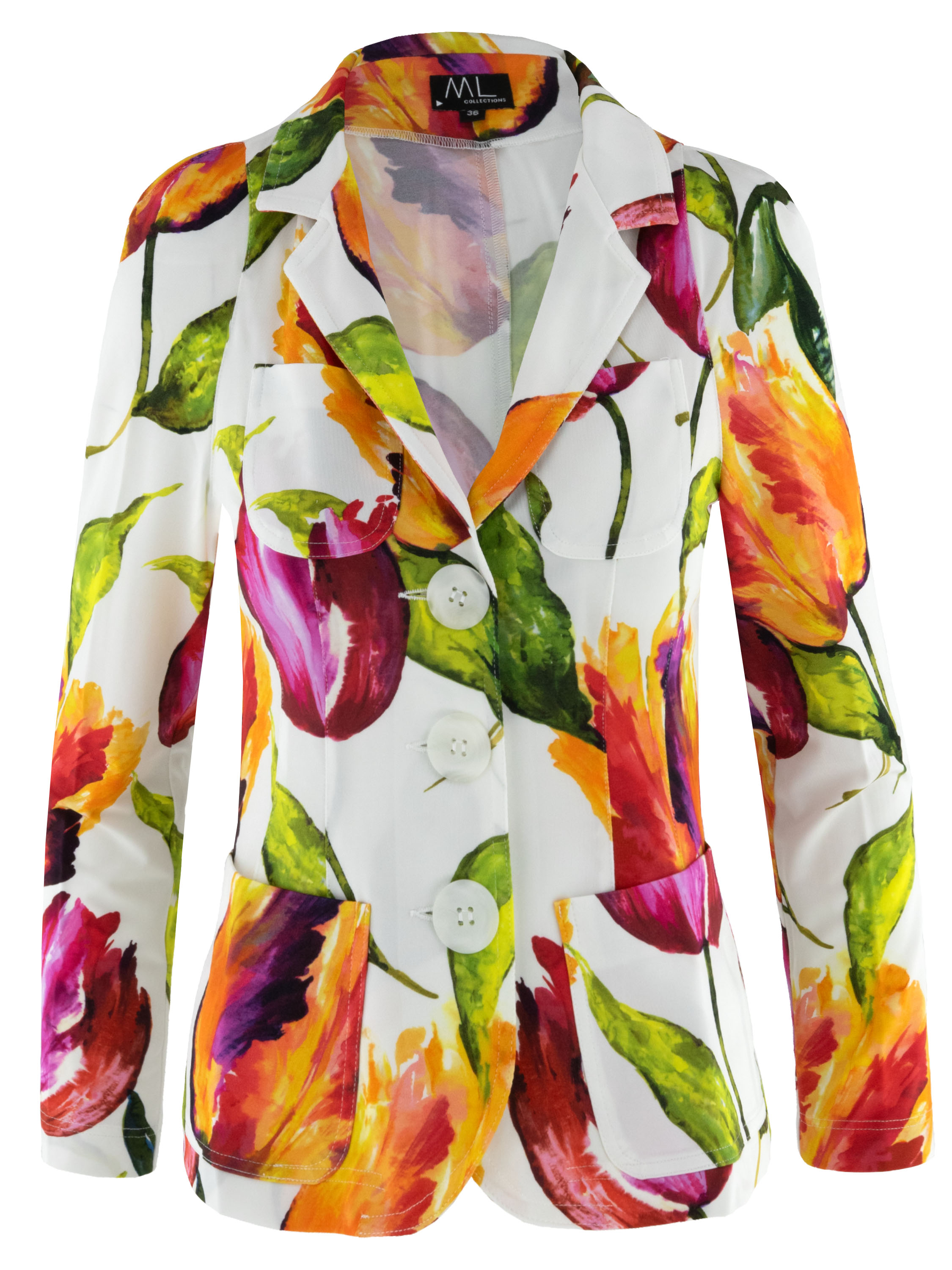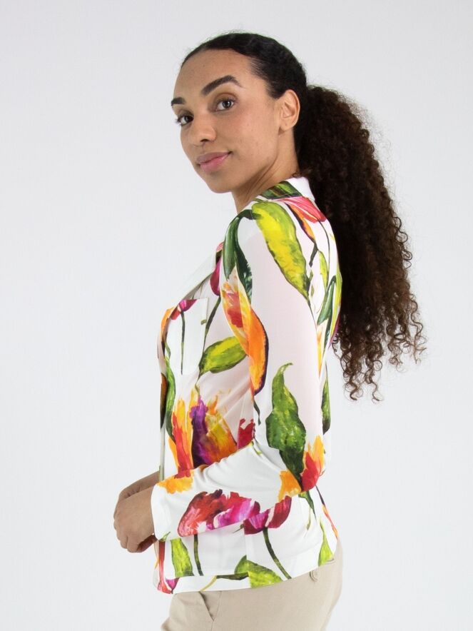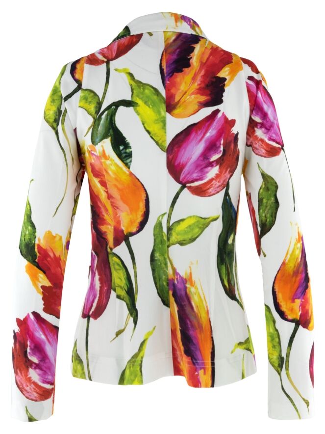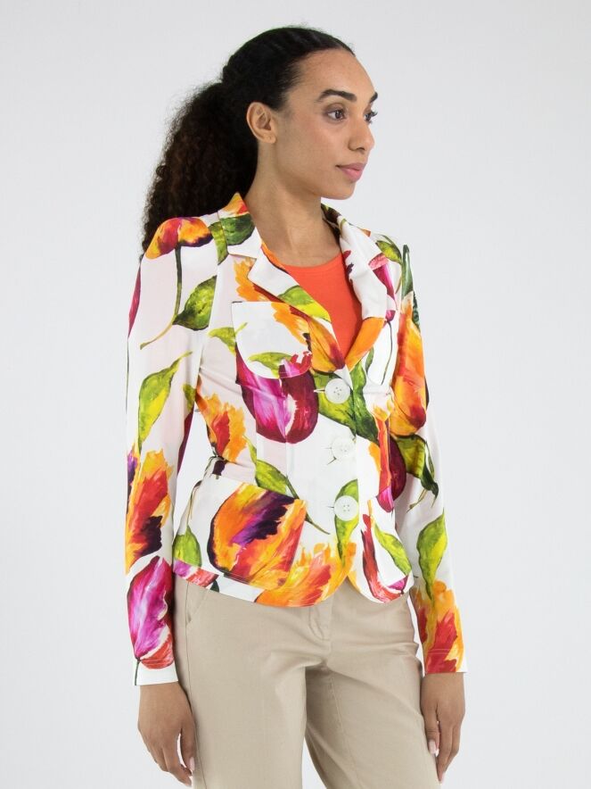 Blazer van ML Collections in een tulpenprint in meerdere kleuren op een roomwitte achtergrond. Het levendige dessin geeft het ontwerp een uitgesproken en vrouwelijke uitstraling. De blazer sluit met drie knopen en is ongevoerd, wat zorgt voor een lichte en comfortabele valling. Deze blazer mag niet worden gewassen.