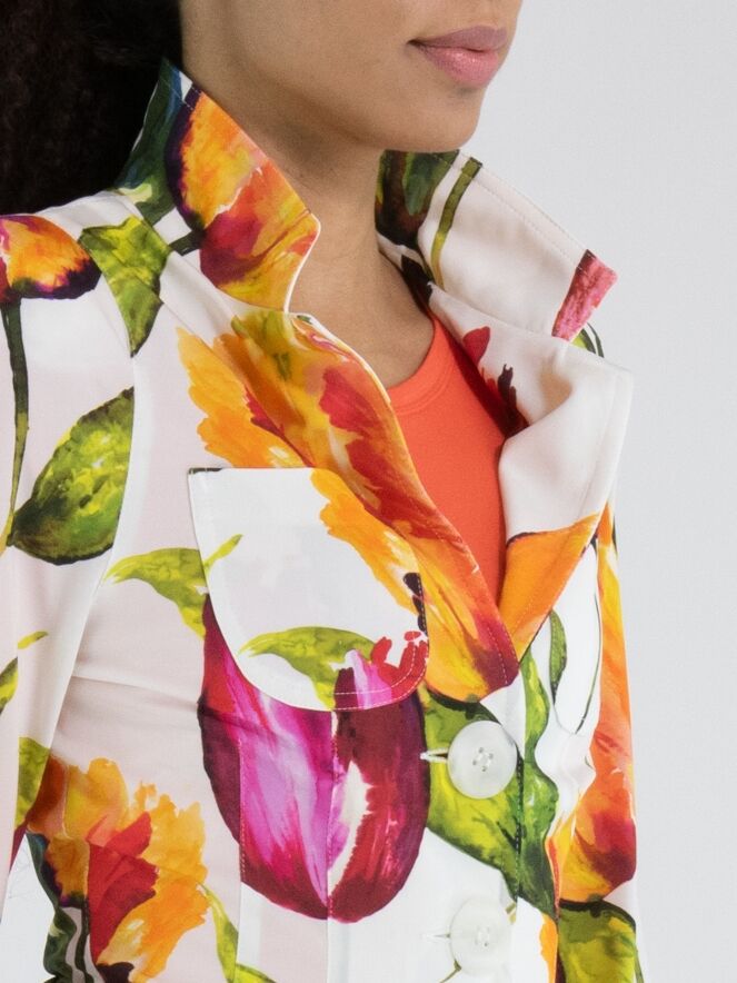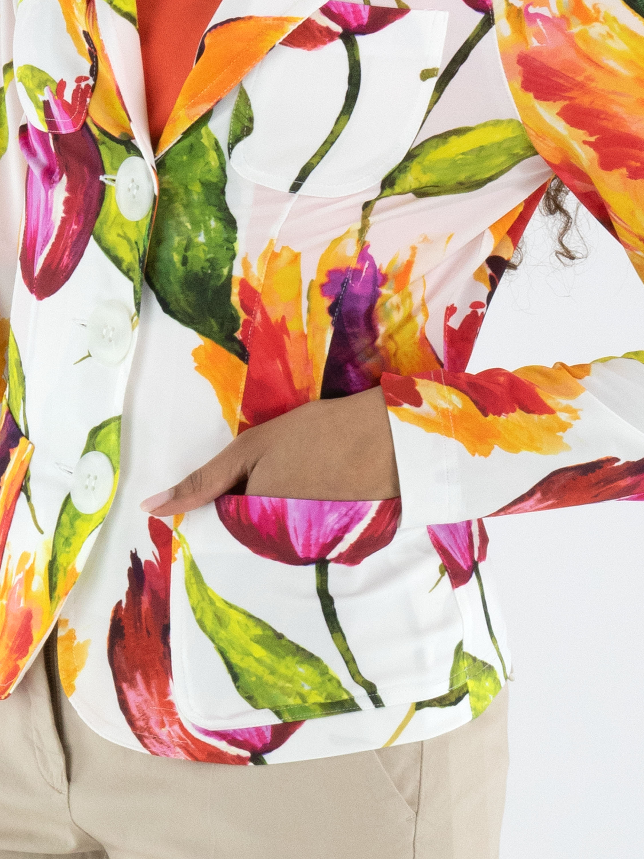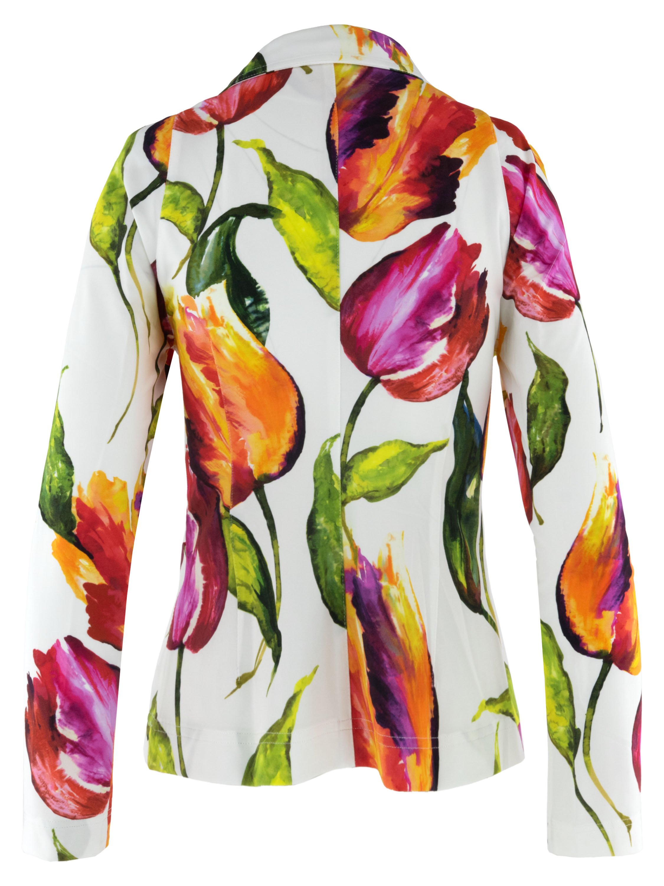 Blazer van ML Collections in een tulpenprint in meerdere kleuren op een roomwitte achtergrond. Het levendige dessin geeft het ontwerp een uitgesproken en vrouwelijke uitstraling. De blazer sluit met drie knopen en is ongevoerd, wat zorgt voor een lichte en comfortabele valling. Deze blazer mag niet worden gewassen.