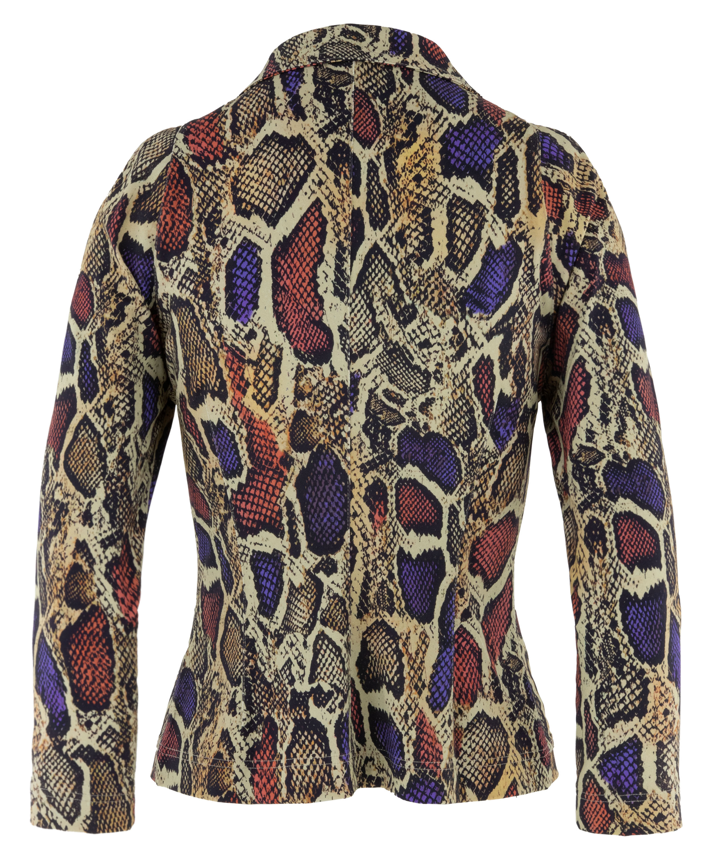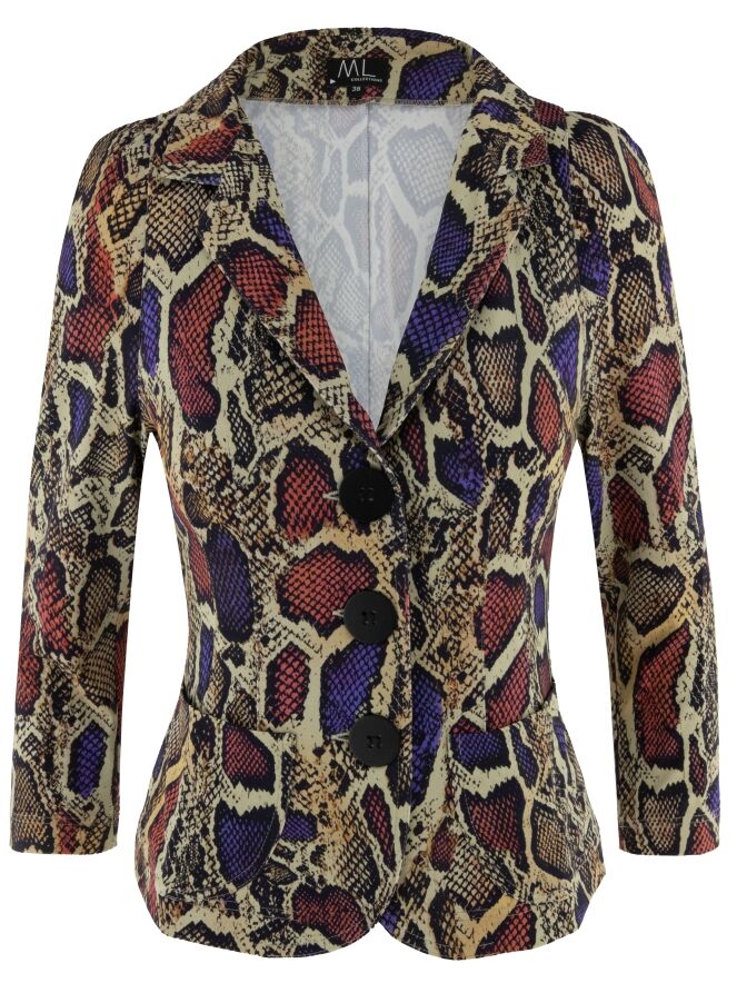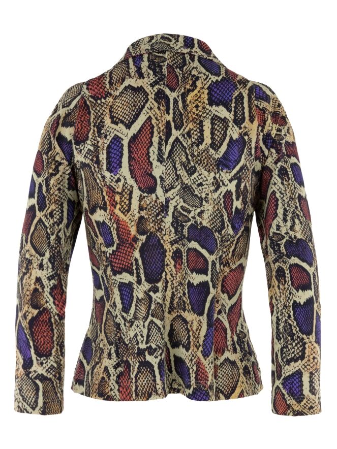 Een blazer van ML Collections met een pythonprint in de kleuren paars, rood en zwart op een zachte taupekleurige achtergrond. De blazer heeft een sluiting met drie knopen en is ongevoerd. Deze blazer mag niet worden gewassen.