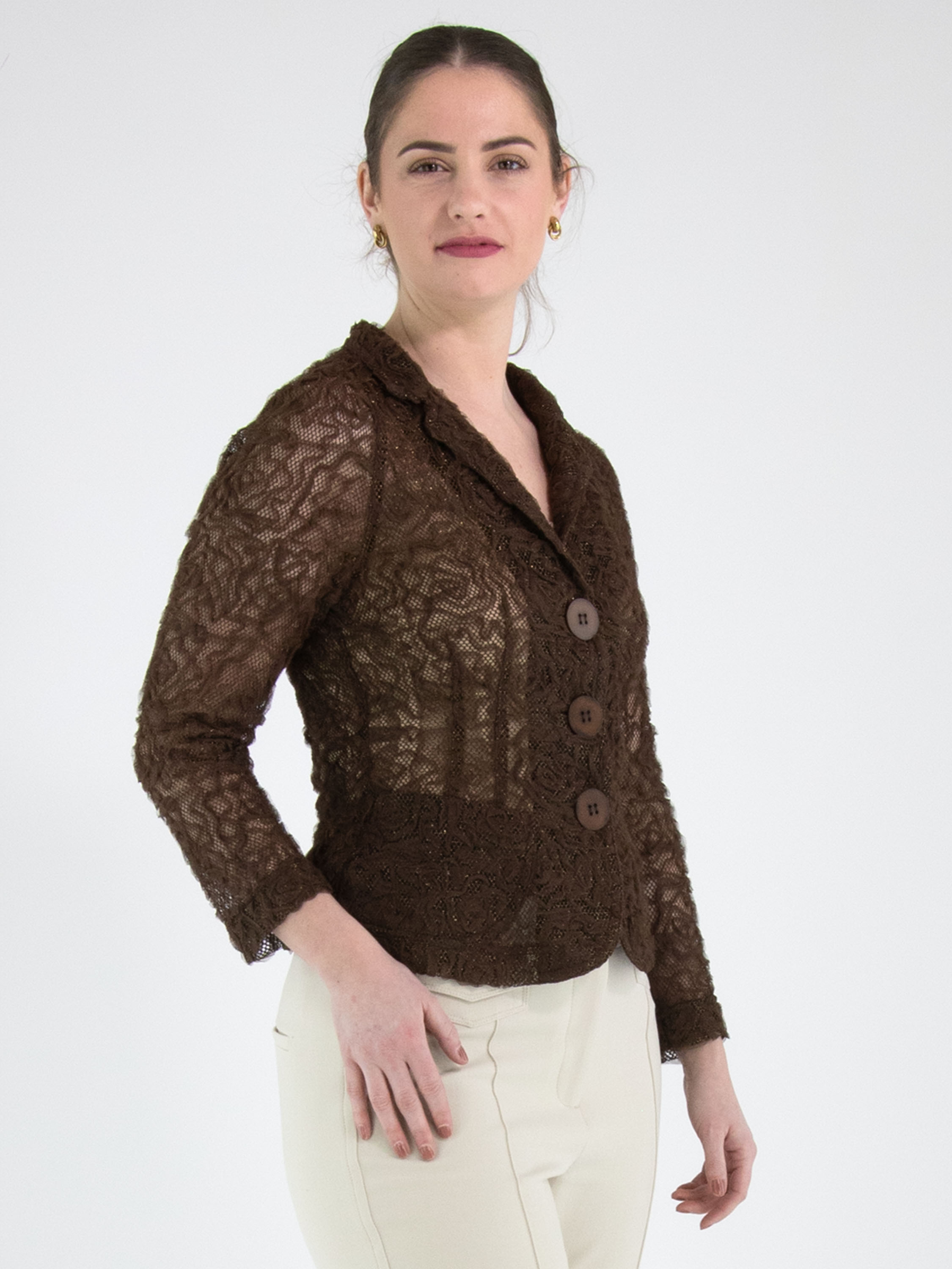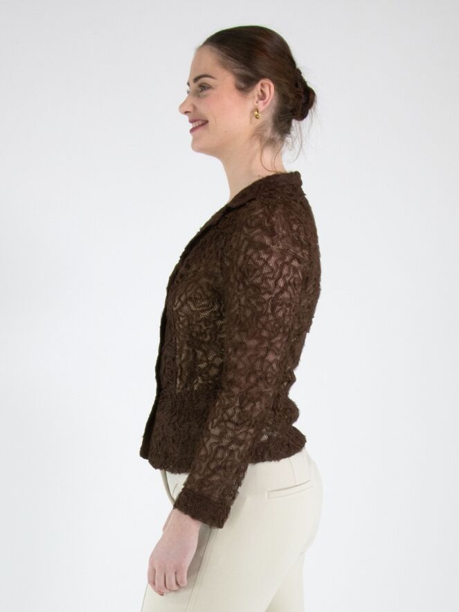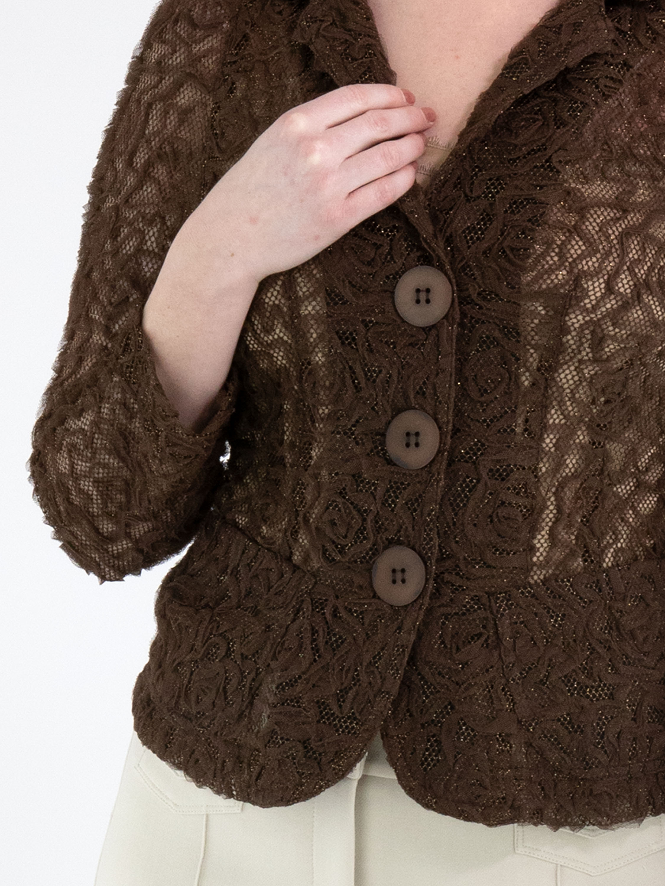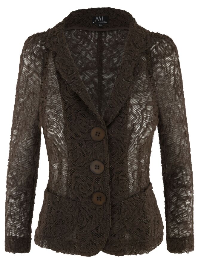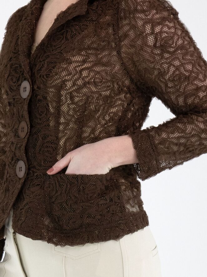Een blazer van ML Collections in de kleur mokkabruin. De stof is uitgevoerd in kant met een gouddraad die door de stof is geweven. De blazer heeft een sluiting met drie knopen en is ongevoerd. Deze blazer mag niet worden gewassen.