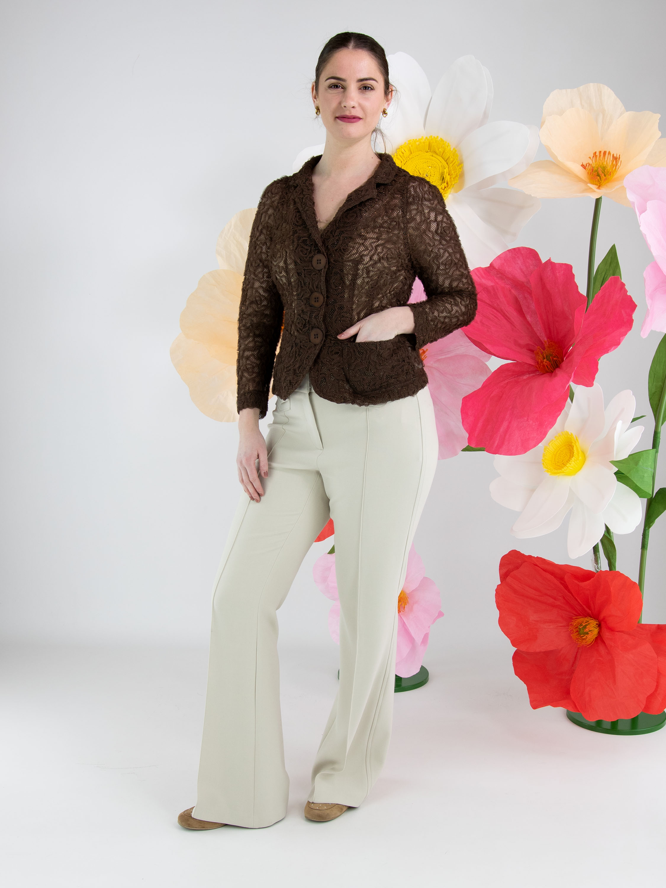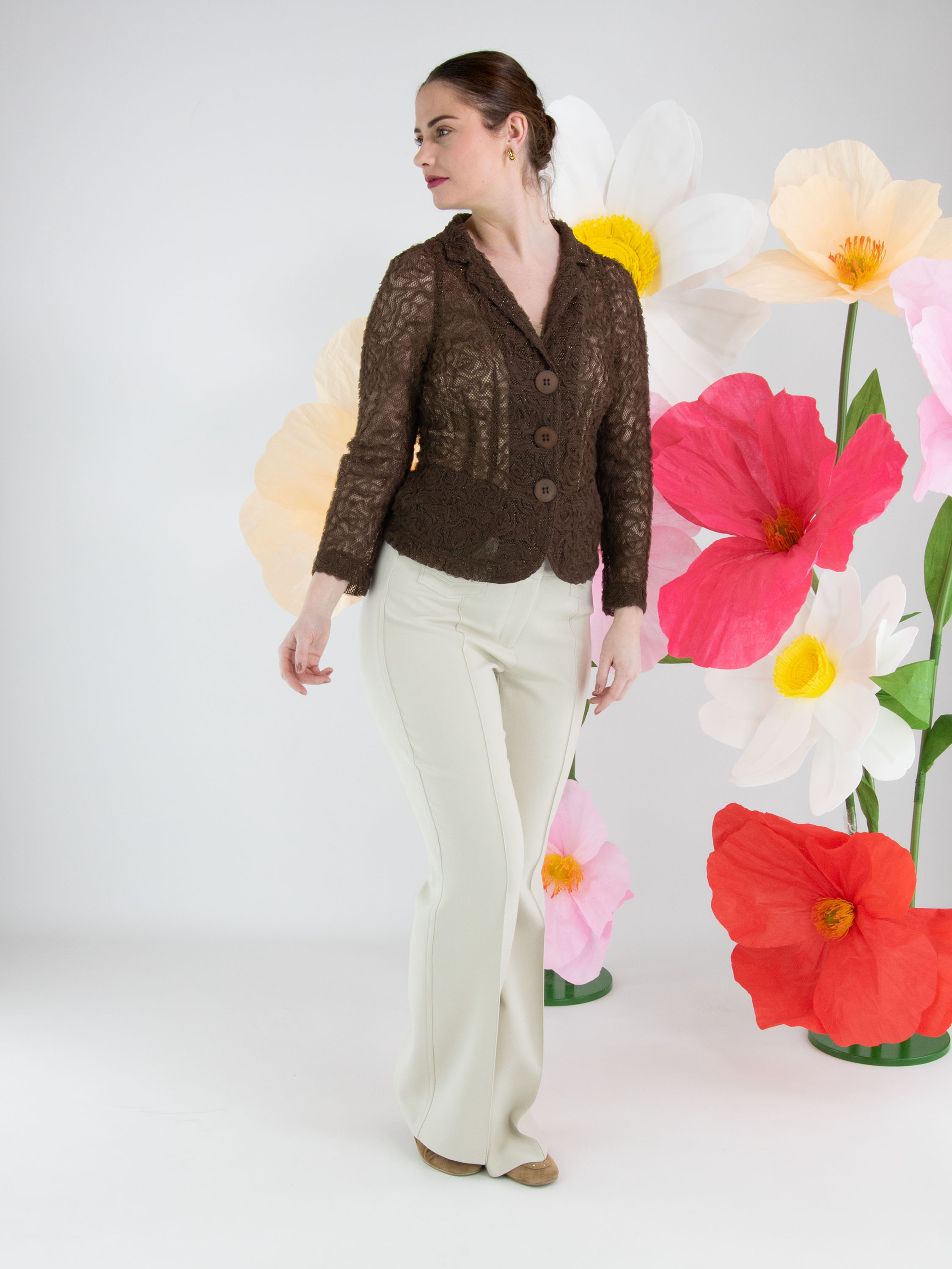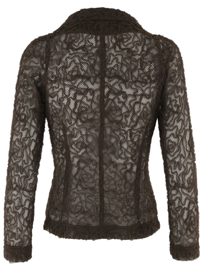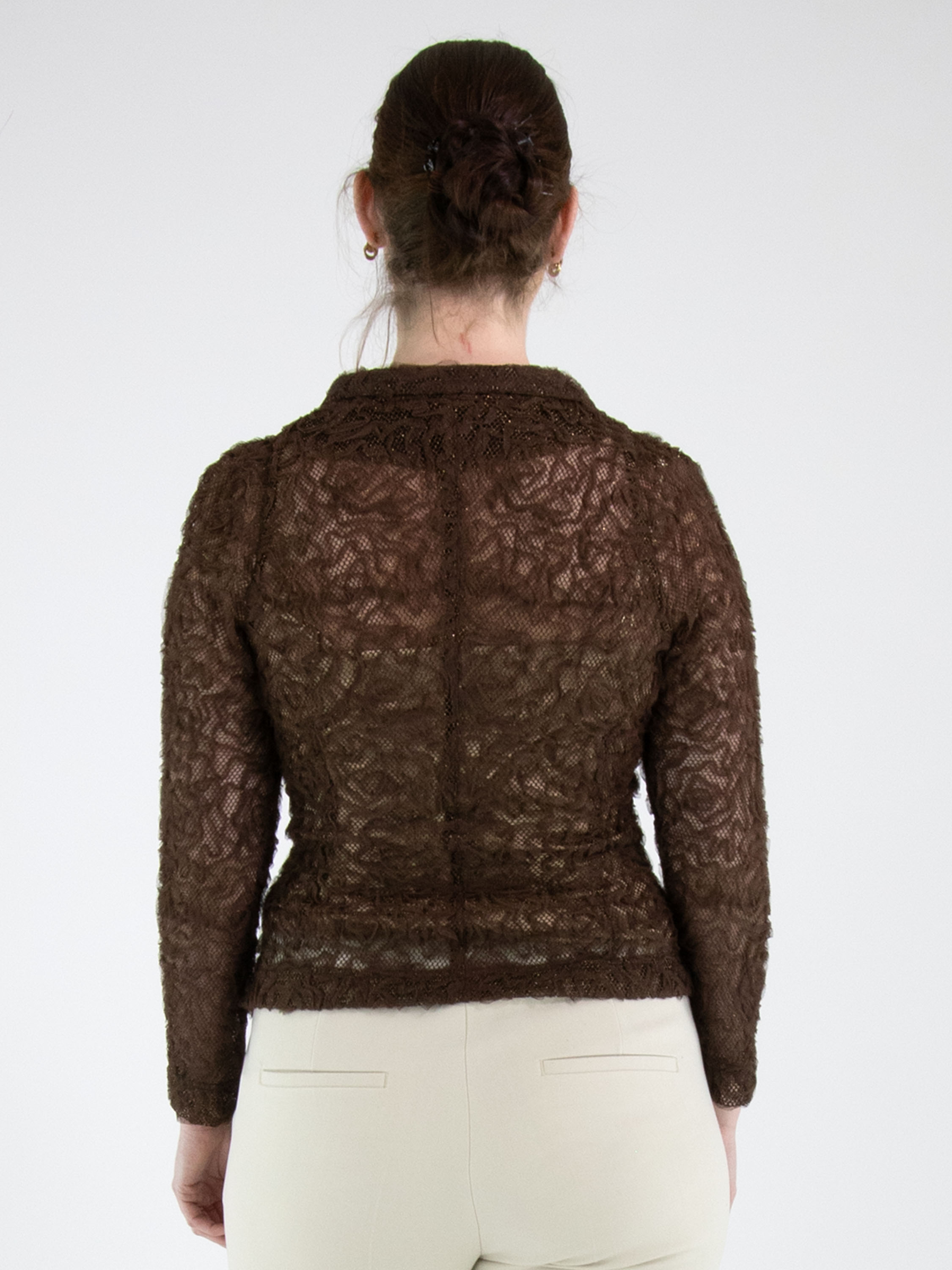 Een blazer van ML Collections in de kleur mokkabruin. De stof is uitgevoerd in kant met een gouddraad die door de stof is geweven. De blazer heeft een sluiting met drie knopen en is ongevoerd. Deze blazer mag niet worden gewassen.