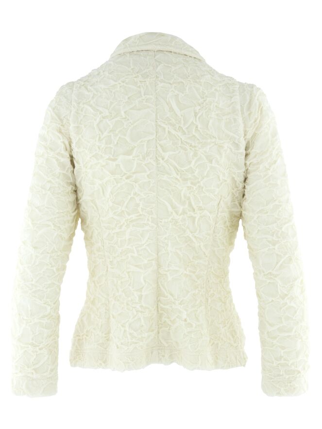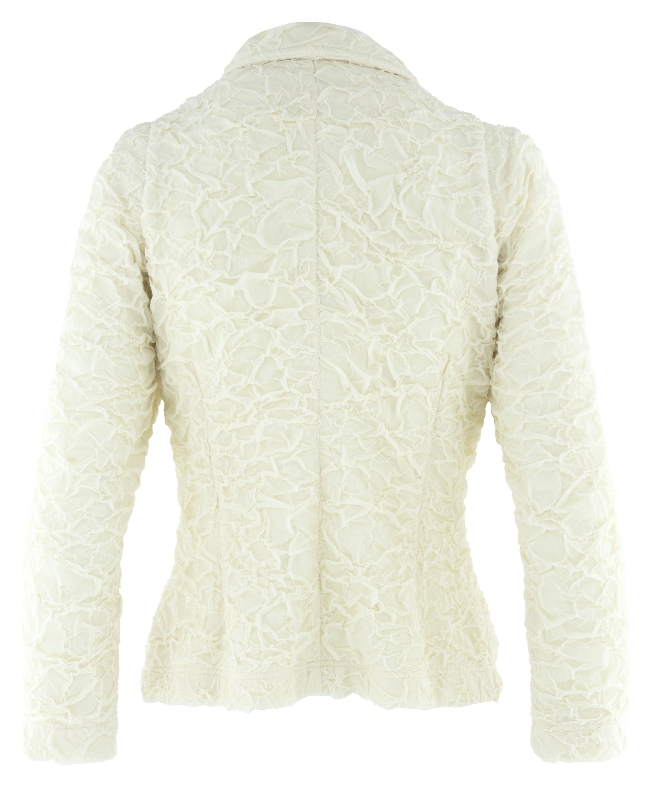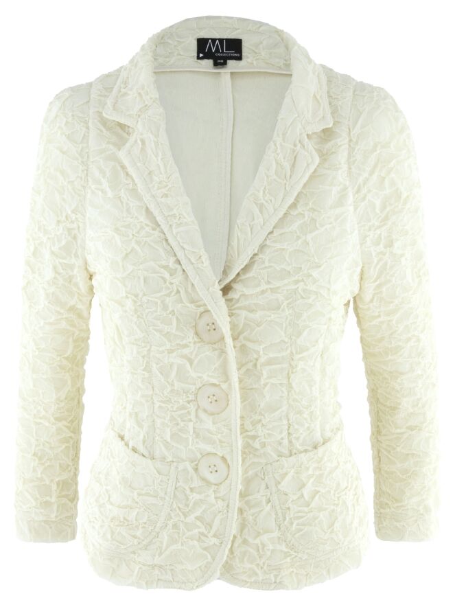 Een blazer van ML Collections in een roomwitte kleur. Over de basisstof is een gesmokte voile stof in dezelfde kleur aangebracht. De blazer heeft een sluiting met drie knopen en is ongevoerd. Deze blazer mag niet worden gewassen.