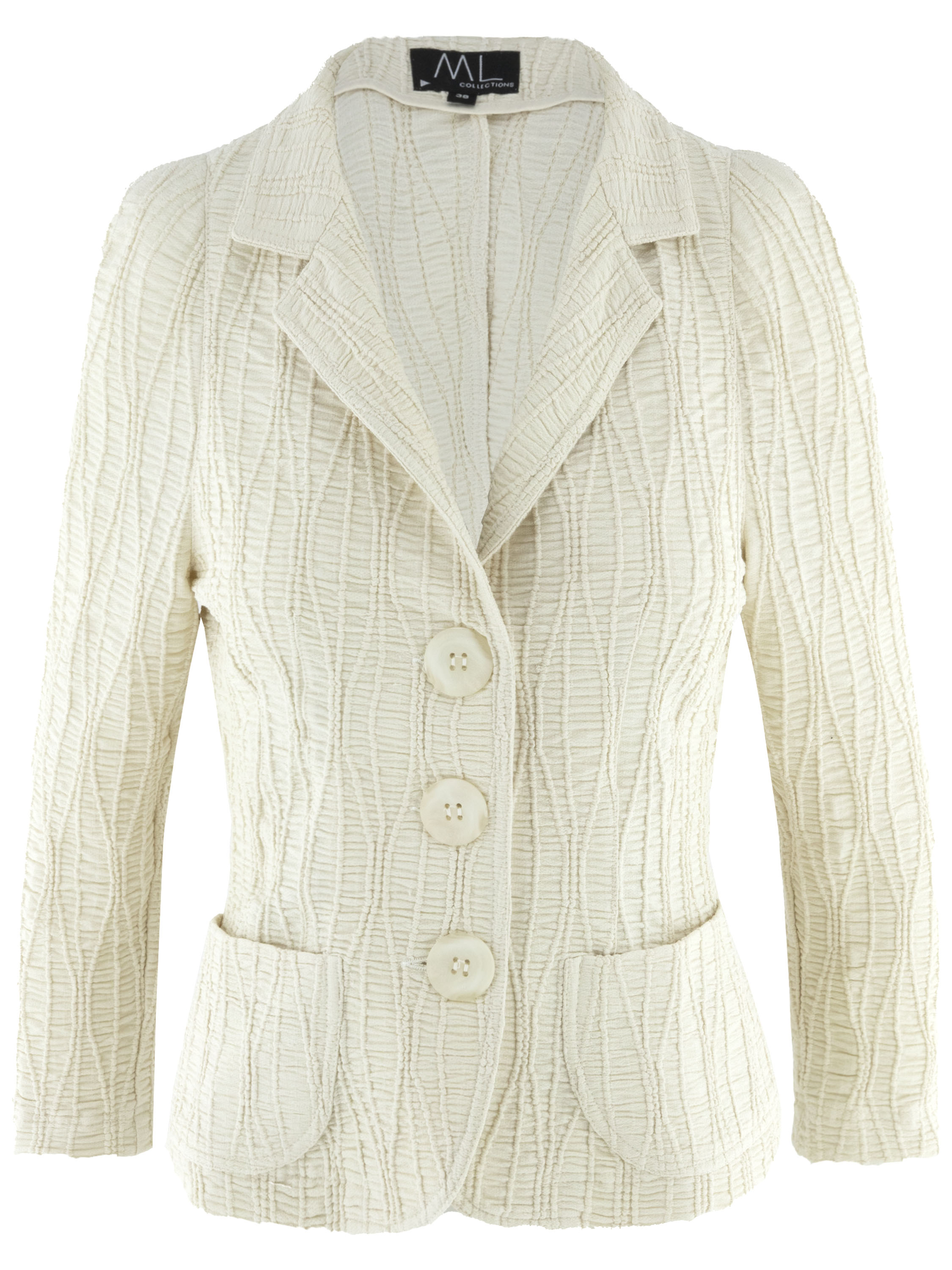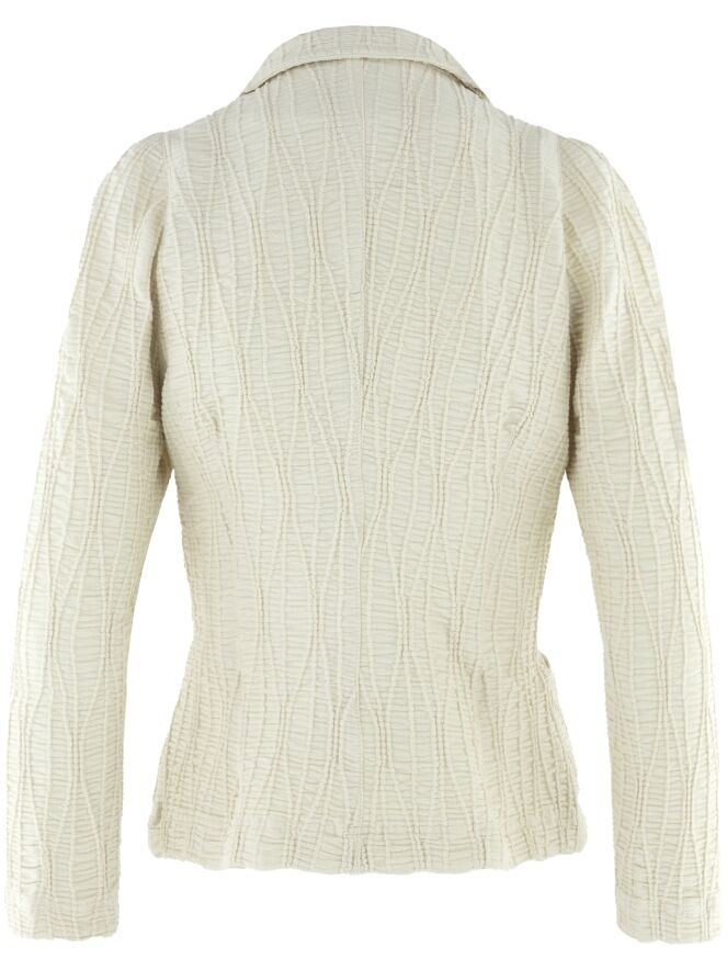 Een blazer van ML Collections in de kleur beige. De stof is horizontaal gesmokt met daarover golvende verticale lijnen. De blazer heeft een sluiting met drie knopen en is ongevoerd. Deze blazer mag niet worden gewassen.