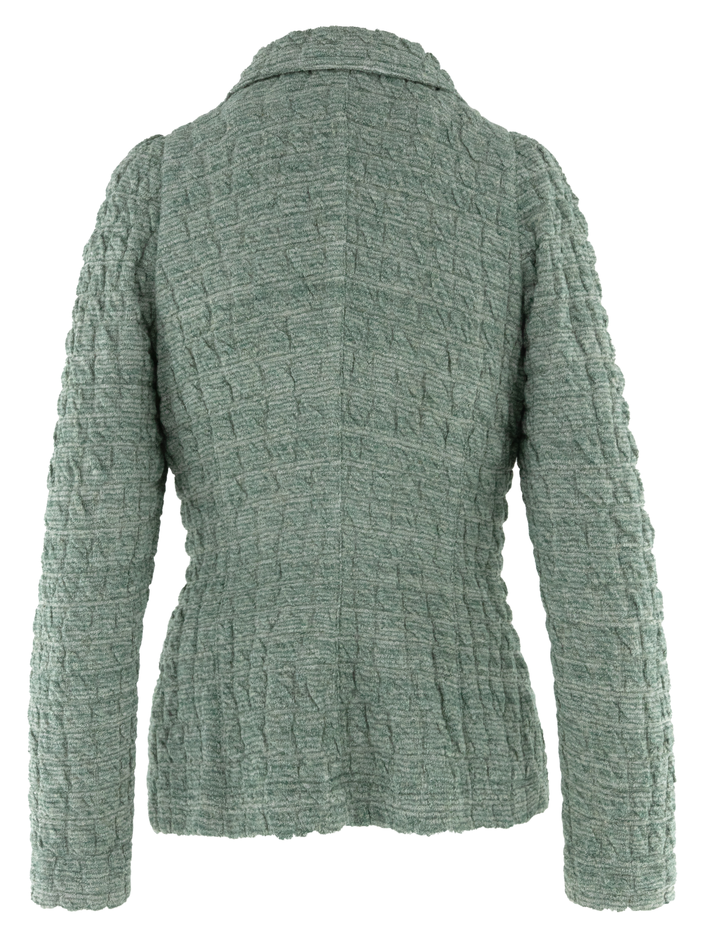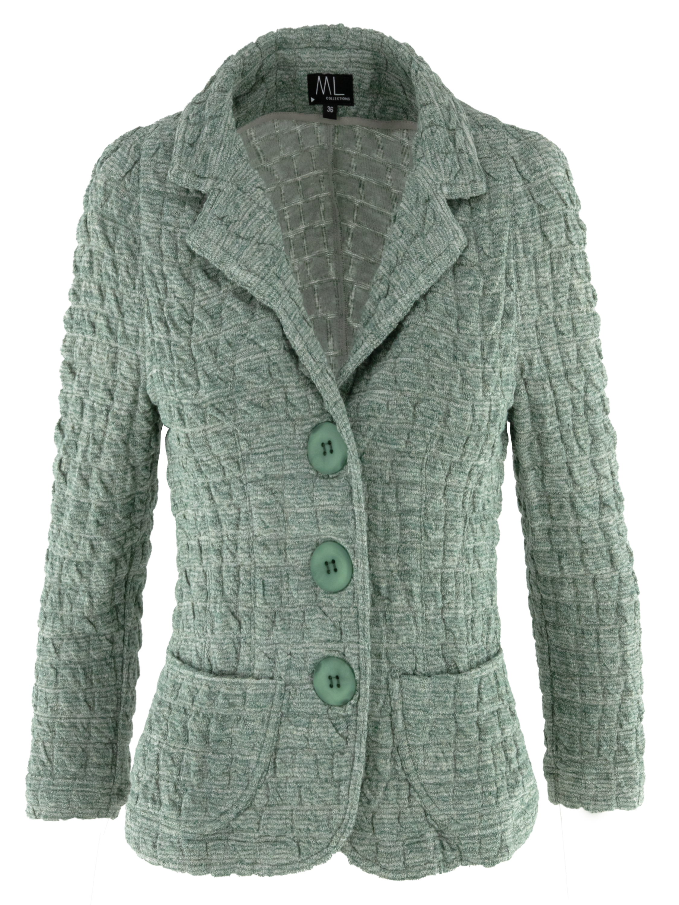 Gemêleerde blazer van ML Collections in groene tinten gecombineerd met roomwit. De stof heeft een gesmokte structuur in een subtiel blokpatroon, wat het ontwerp een speels en eigentijds reliëf geeft. De blazer sluit met drie knopen en is ongevoerd, waardoor hij licht en comfortabel draagt. Deze blazer mag niet worden gewassen.