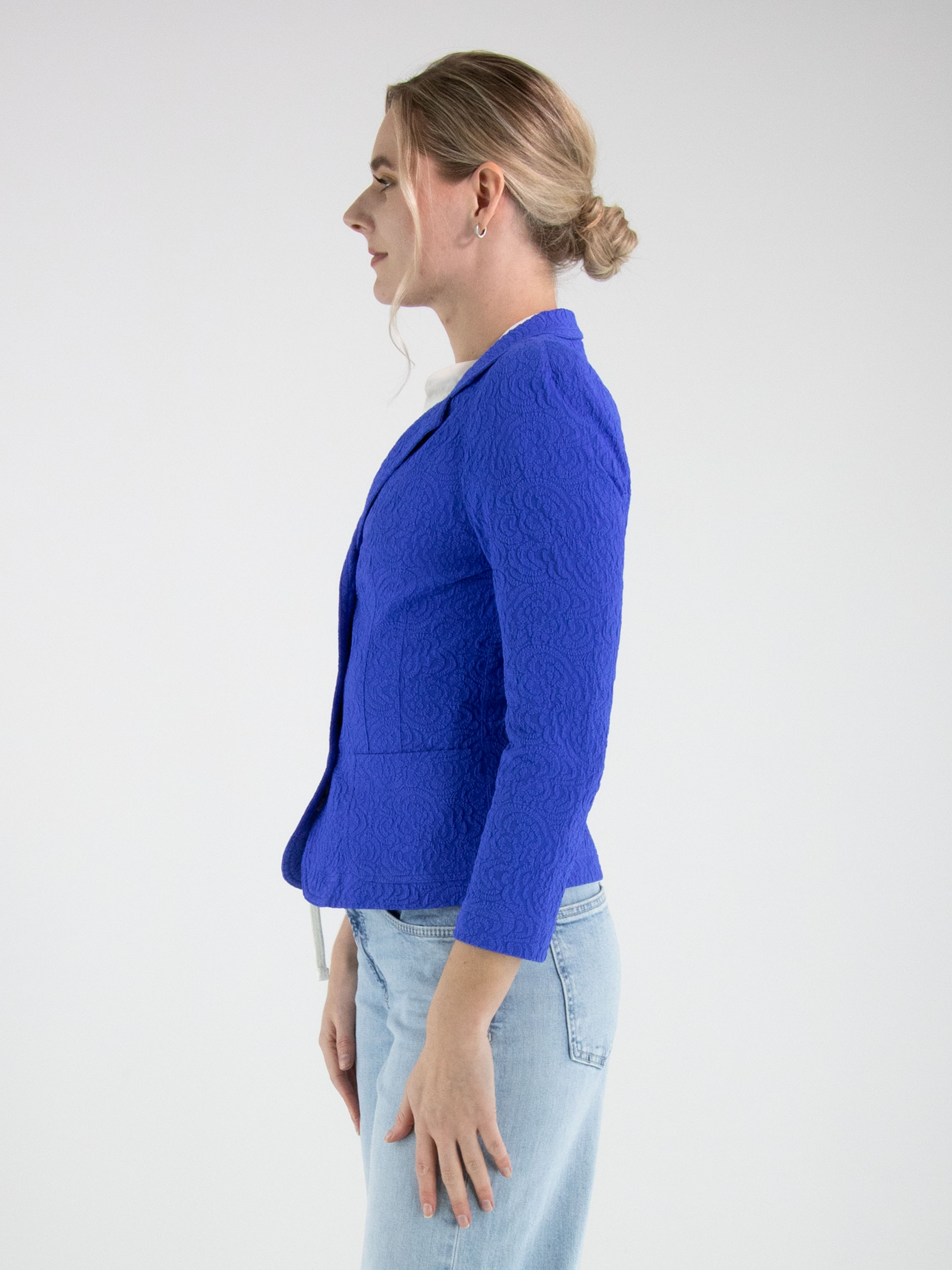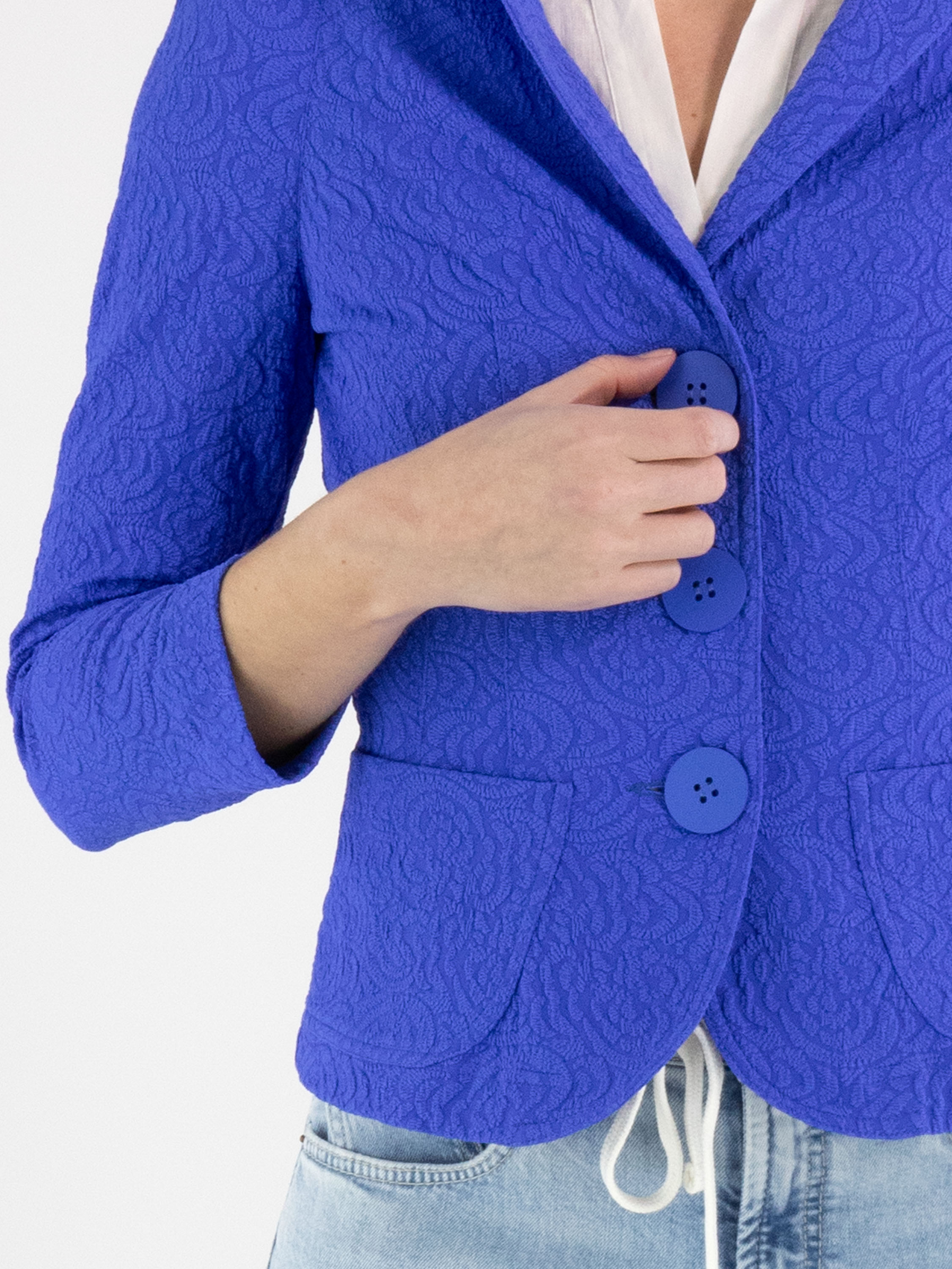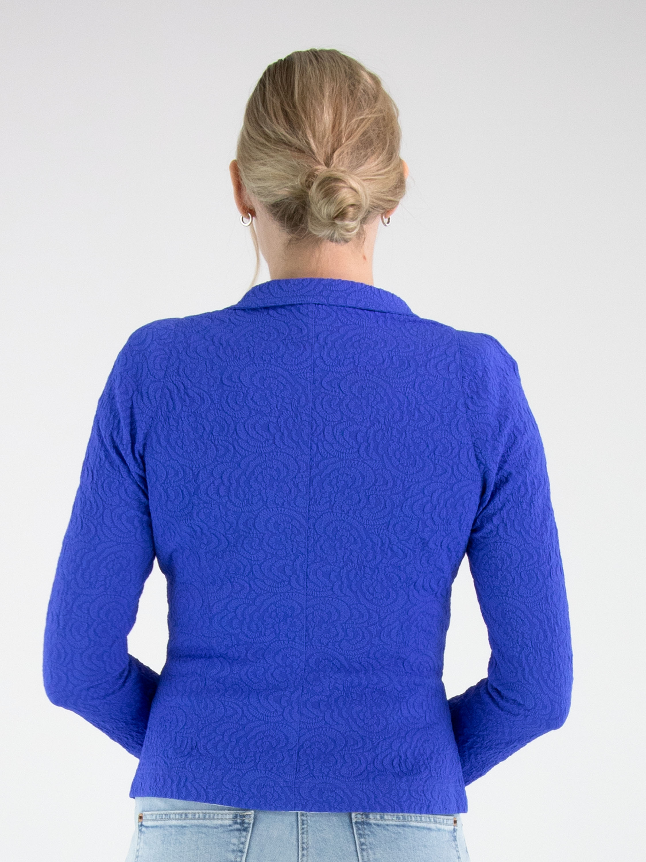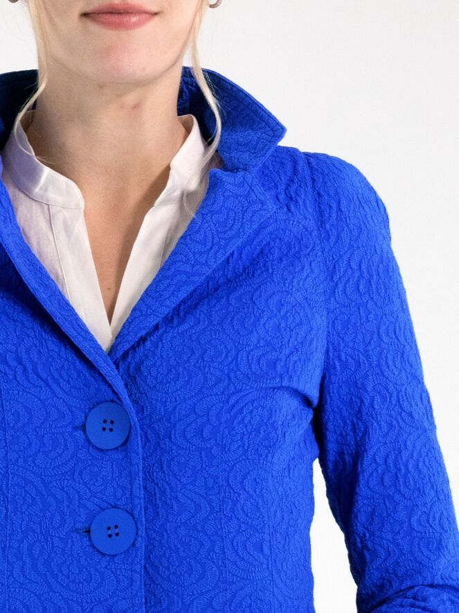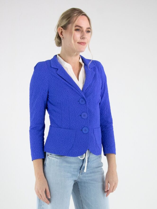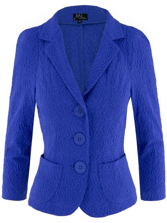 Blazer van ML Collections in een krachtige kobaltblauwe tint. De stof heeft een ton-sur-ton reliëf jacquardprint, wat het ontwerp een subtiele diepte en luxueuze uitstraling geeft. De blazer sluit met drie knopen en is ongevoerd, waardoor hij licht en soepel valt. Deze blazer mag niet worden gewassen.
