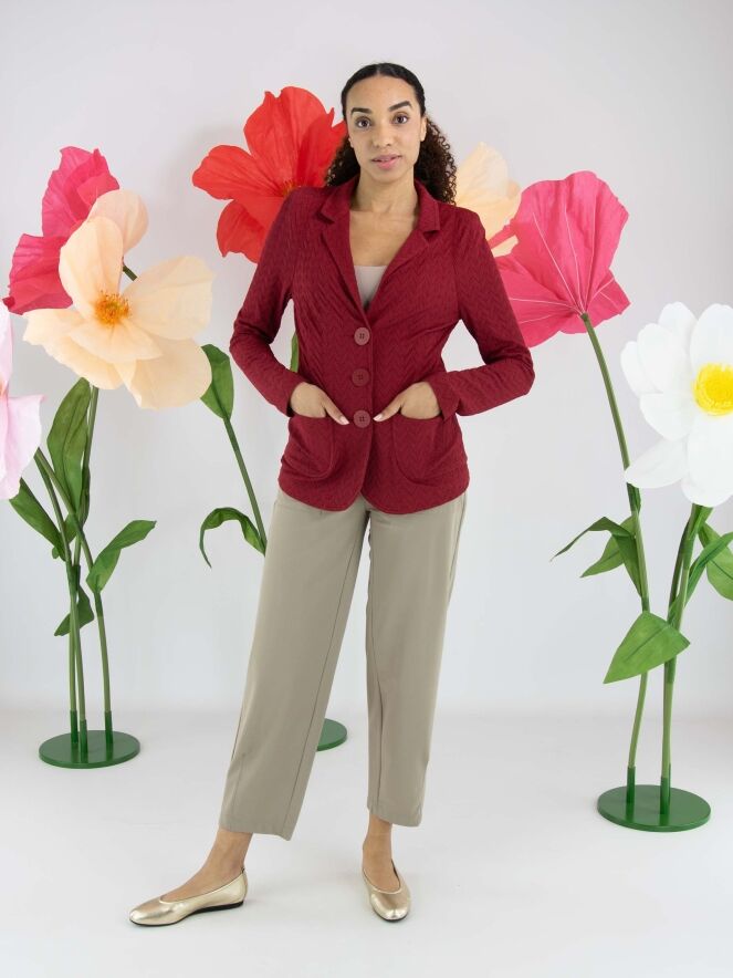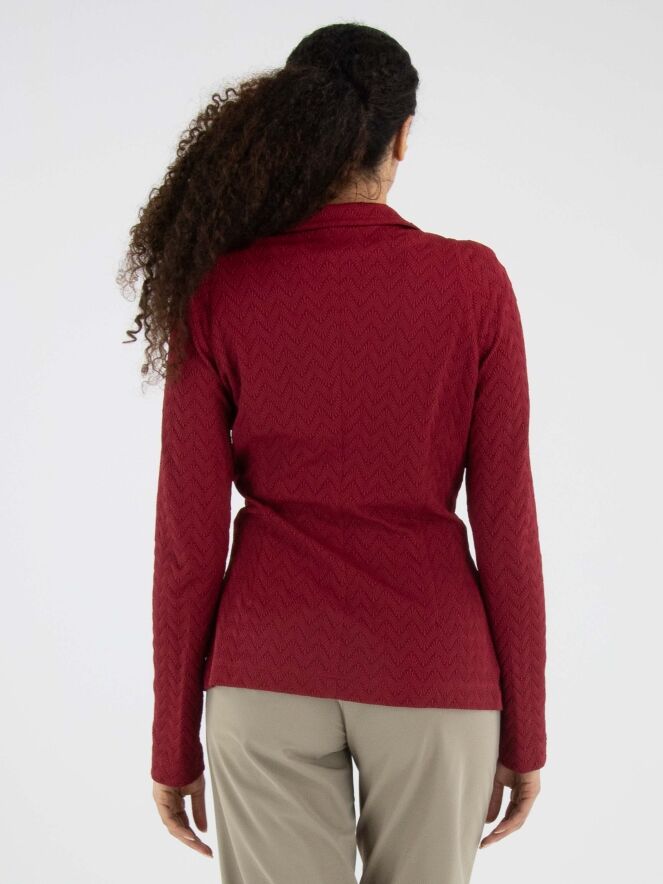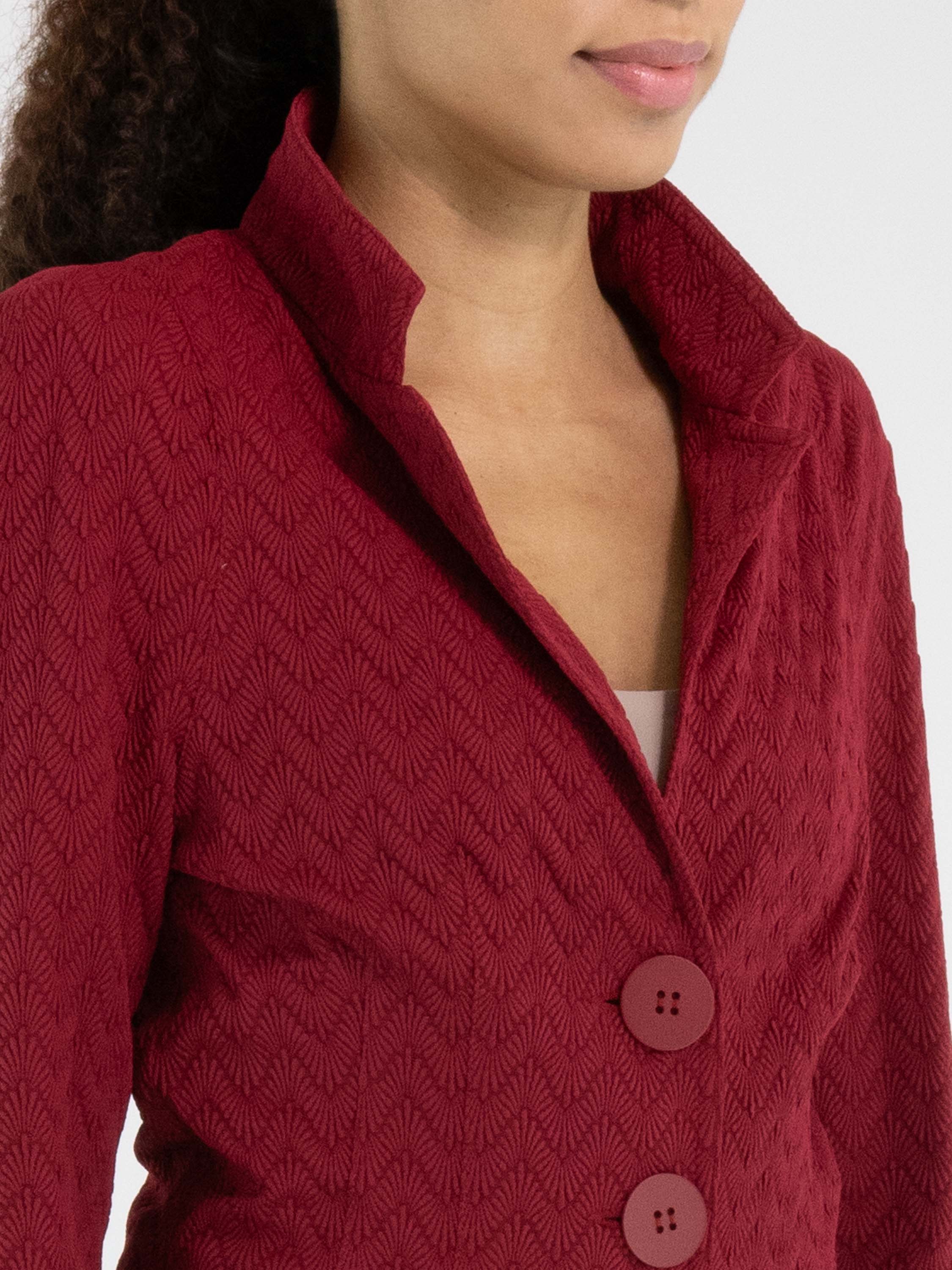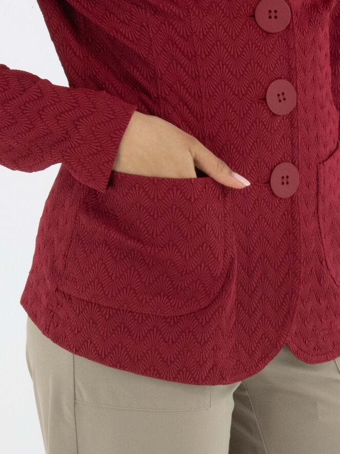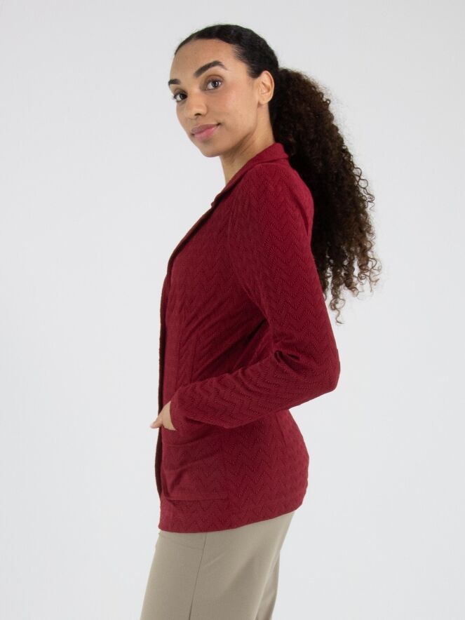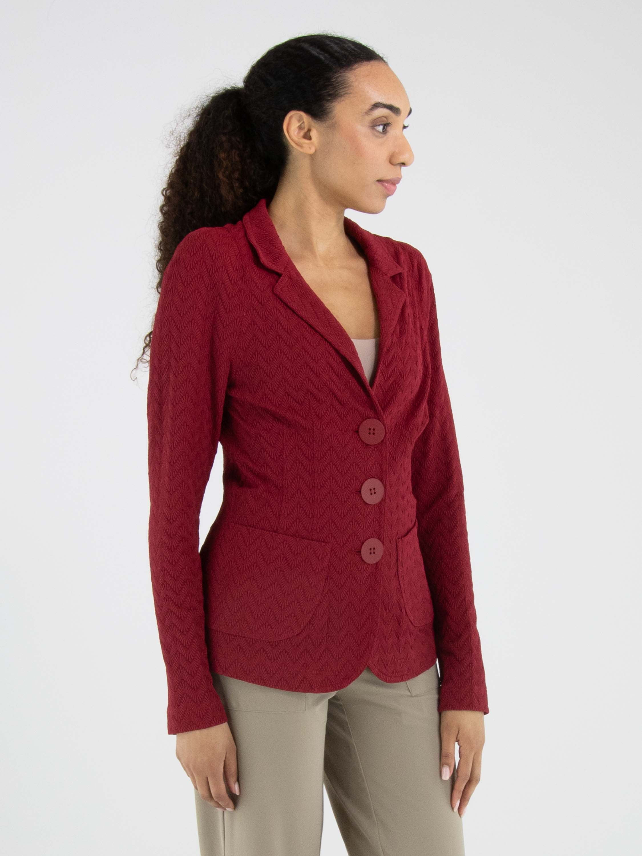 Blazer van ML Collections in een krachtige framboosrode tint. De stof heeft een reliëfprint in een subtiele zigzagstructuur, wat het ontwerp extra diepte en karakter geeft. De blazer sluit met drie knopen en is ongevoerd, wat zorgt voor een lichte en soepele valling. Deze blazer mag niet worden gewassen.