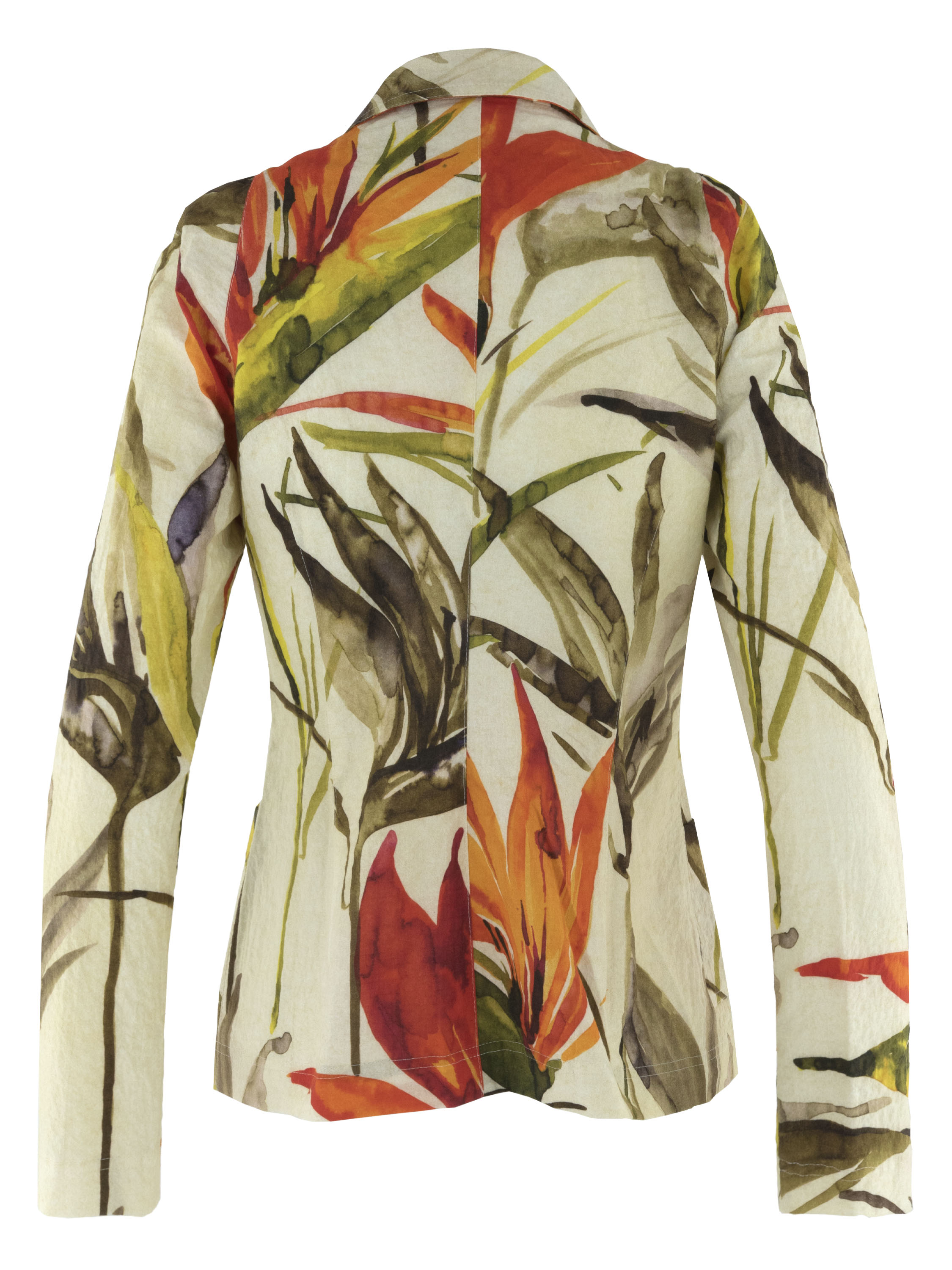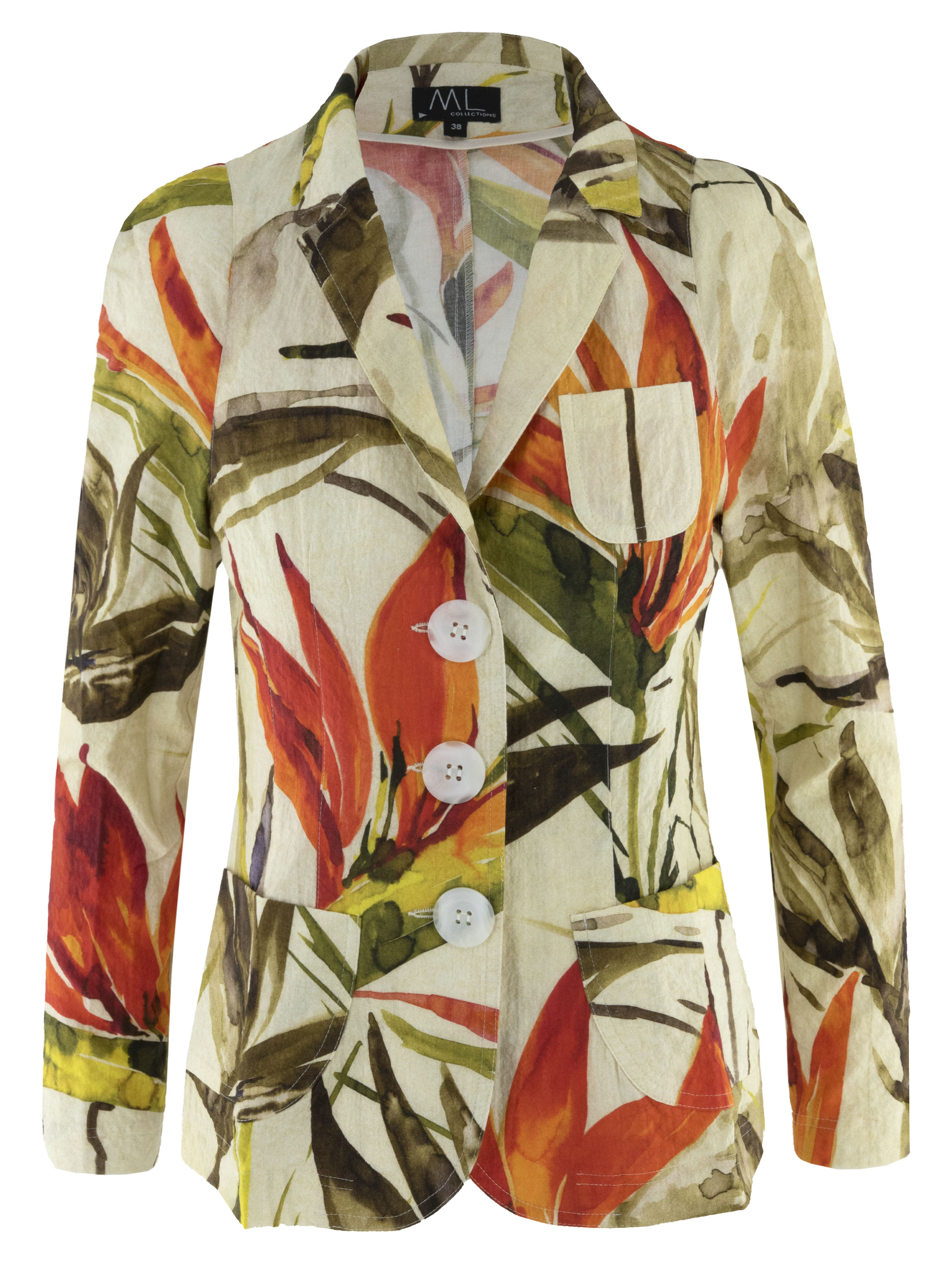 Een blazer van ML Collections met een print van bloemen en bladeren in de kleuren rood, oranje en meerdere tinten groen op een beige achtergrond. De blazer heeft een sluiting met drie knopen en is ongevoerd. Deze blazer mag niet worden gewassen.