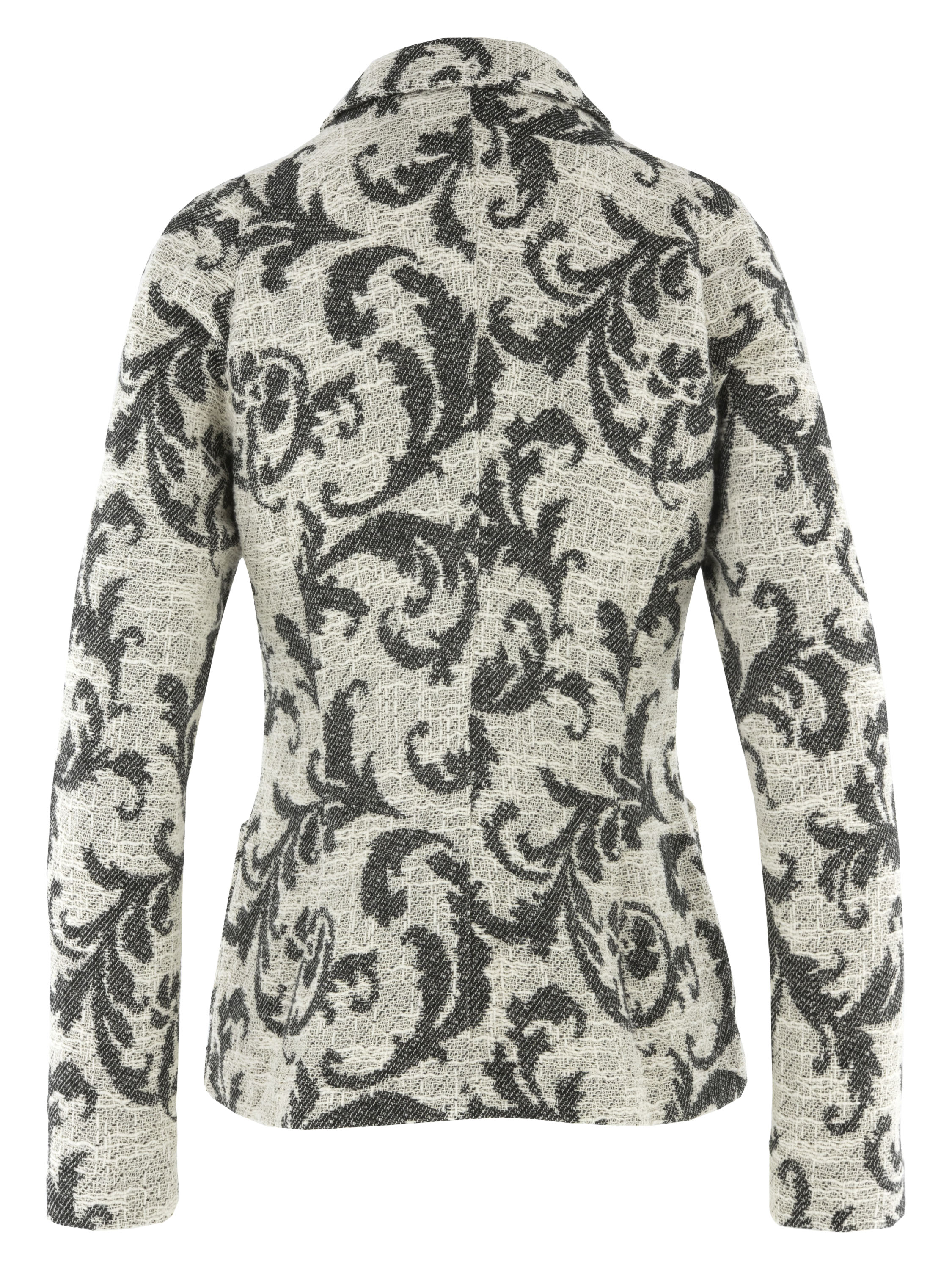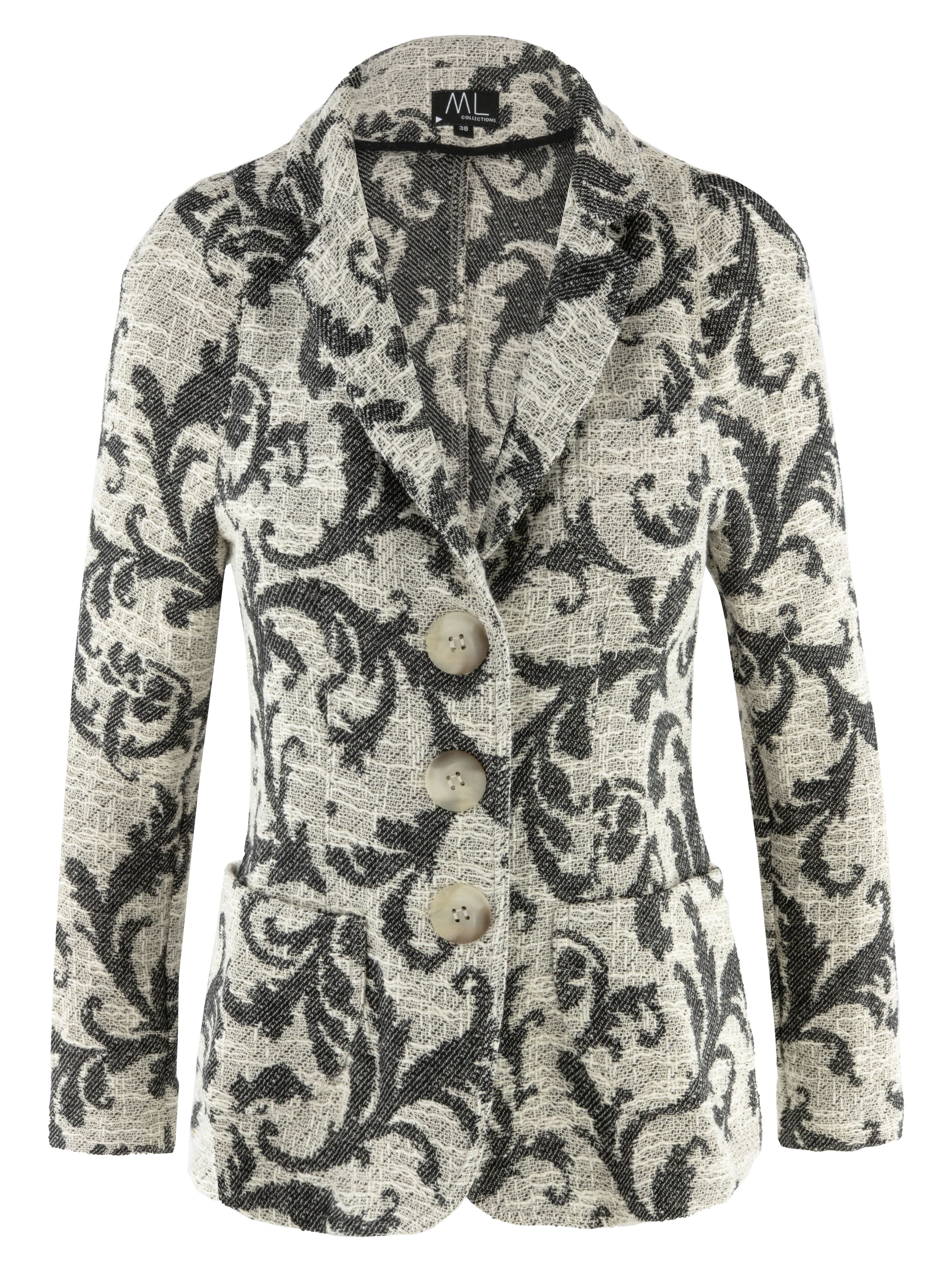 Een blazer van ML Collections met een jacquardprint in de kleuren zwart en beige. De blazer heeft een sluiting met drie knopen en is ongevoerd. Deze blazer mag niet worden gewassen.