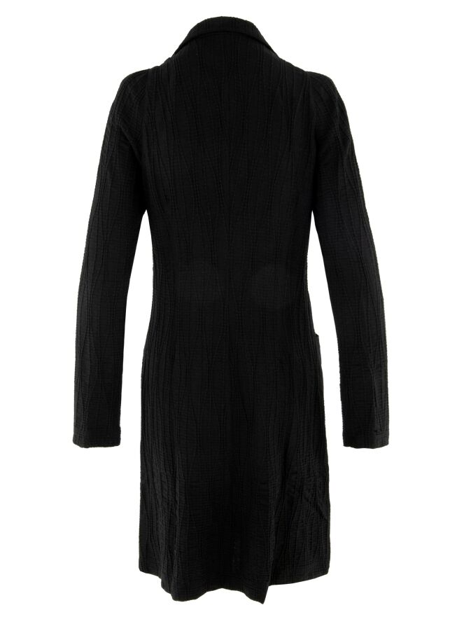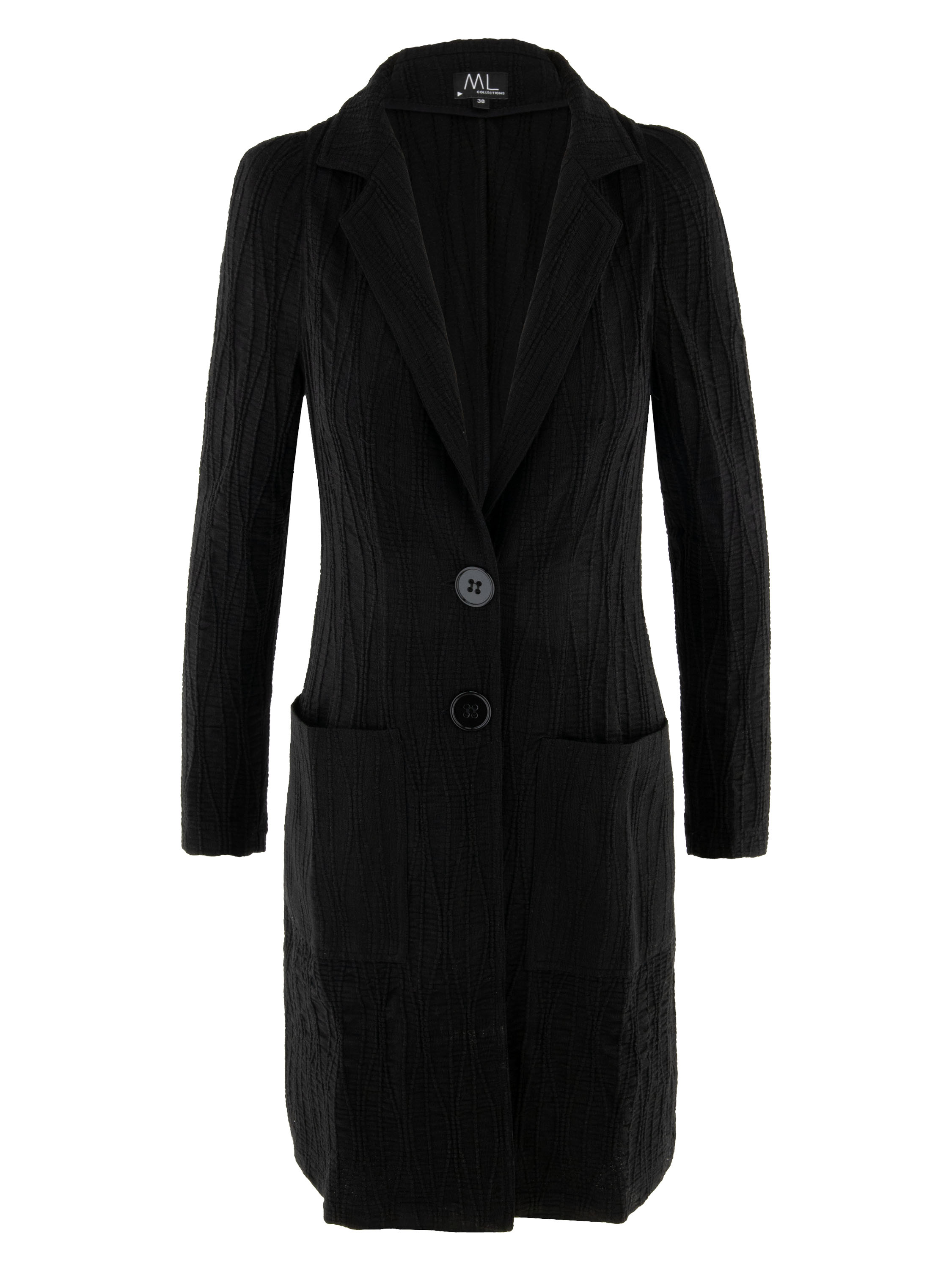 Een lange blazer van ML Collections in de kleur zwart. De stof is horizontaal gesmokt met daarover golvende verticale lijnen. De blazer heeft een sluiting met twee knopen en is ongevoerd. Deze blazer mag niet worden gewassen.