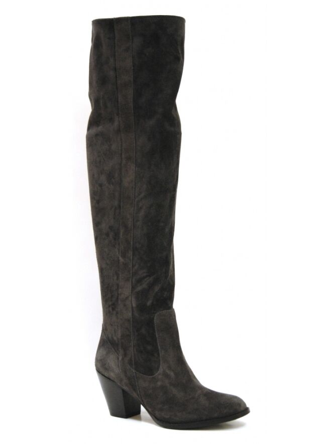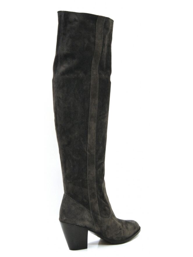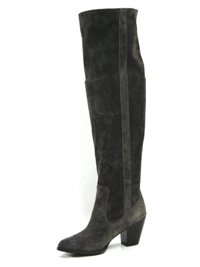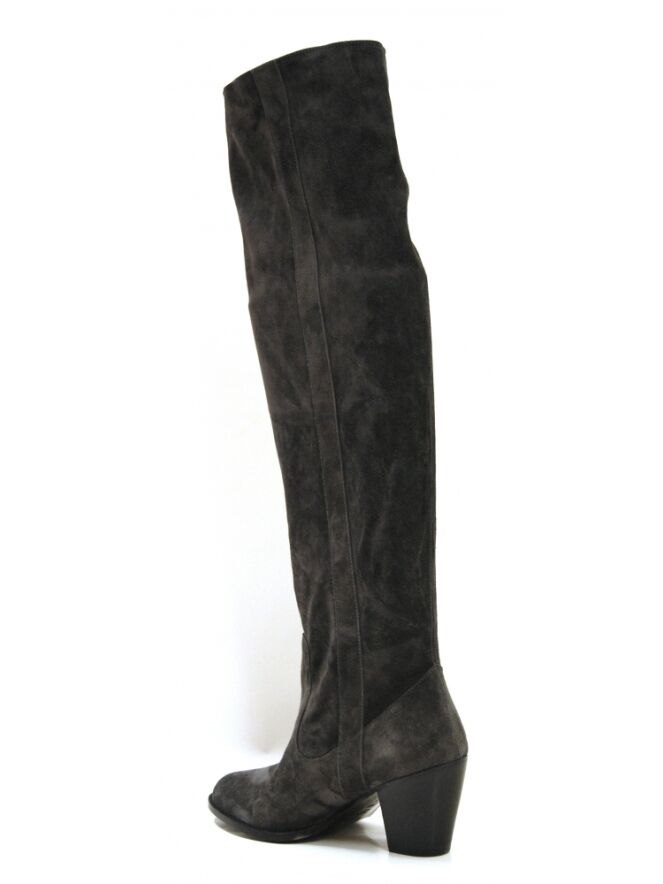 Een laars van het merk Moonflower in een antraciet kleur. De schacht is zacht en zakt iets naar beneden. Langs beide zijden van de schacht is een bies met een doorgestikte naad In de schacht is geen rits. De hoogte van de schacht is 49 cm en de omtrek is 38 cm.