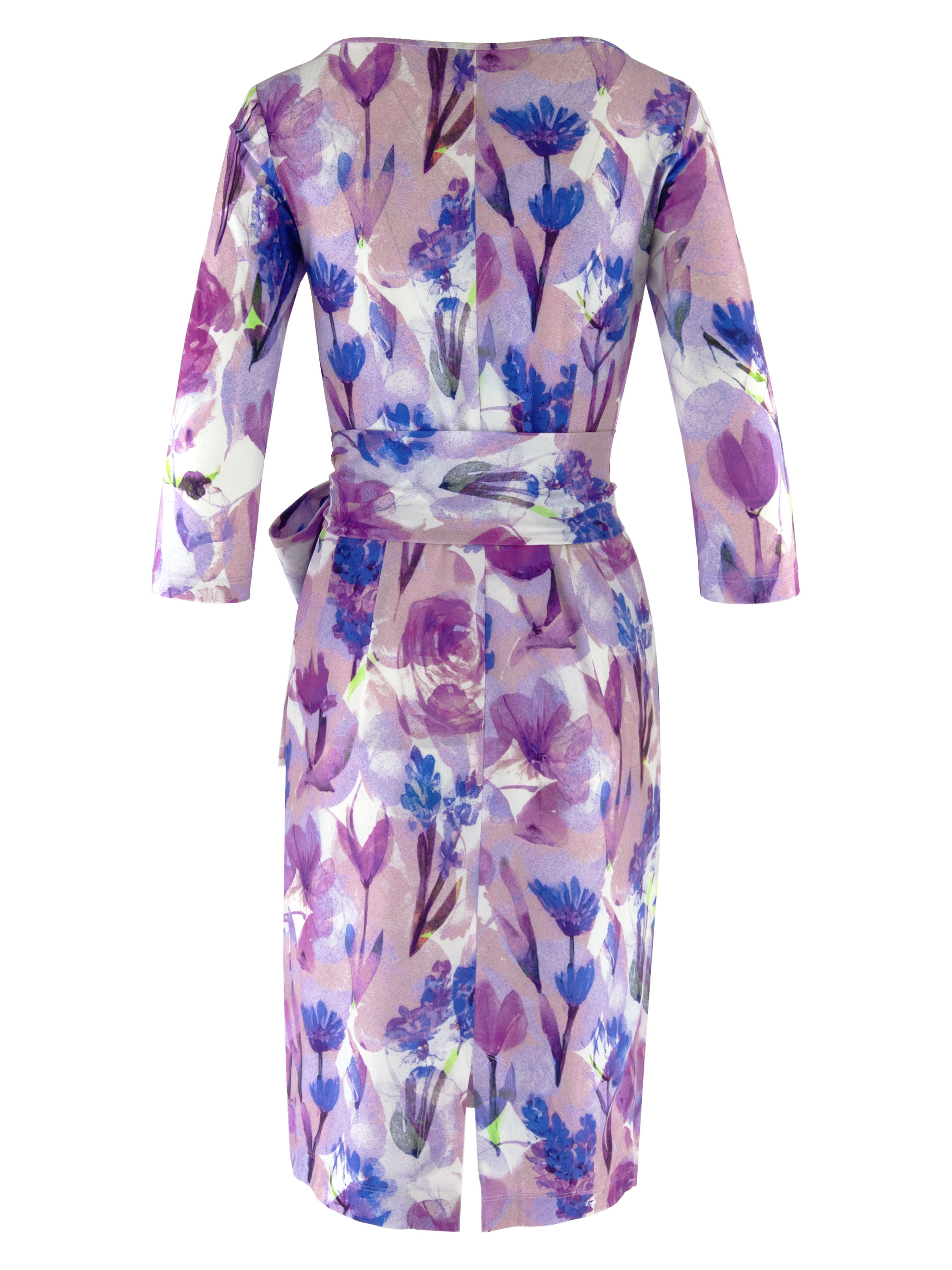 Een jurk van Moq met een grafische bloemenprint in meerdere tinten lila, roze, blauw en wit. De jurk heeft een ruime ronde hals en in de taille een ceintuur van dezelfde stof als de jurk. Het model is ongevoerd en heeft halflange mouwen. Deze jurk kan op 40 graden worden gewassen.