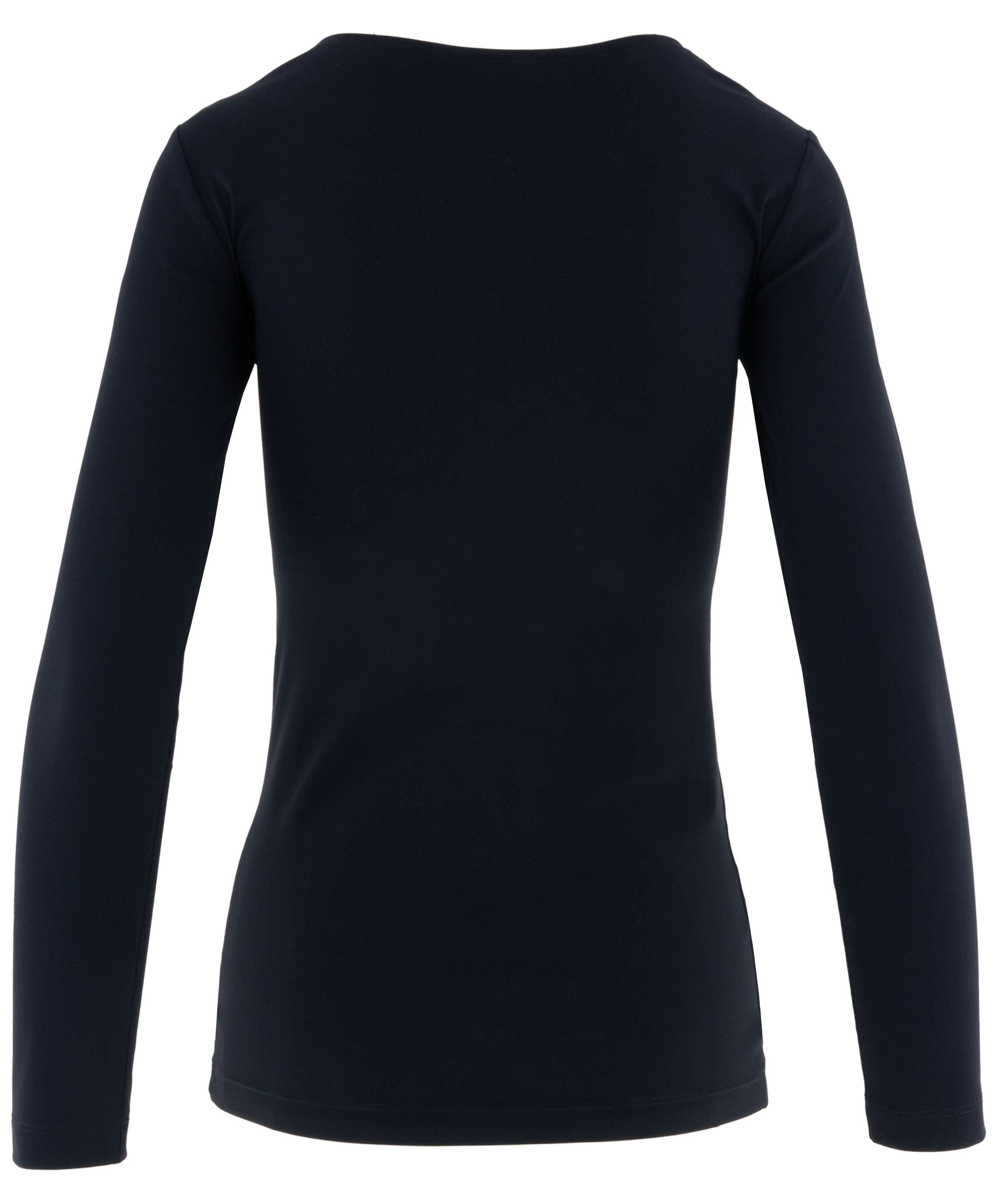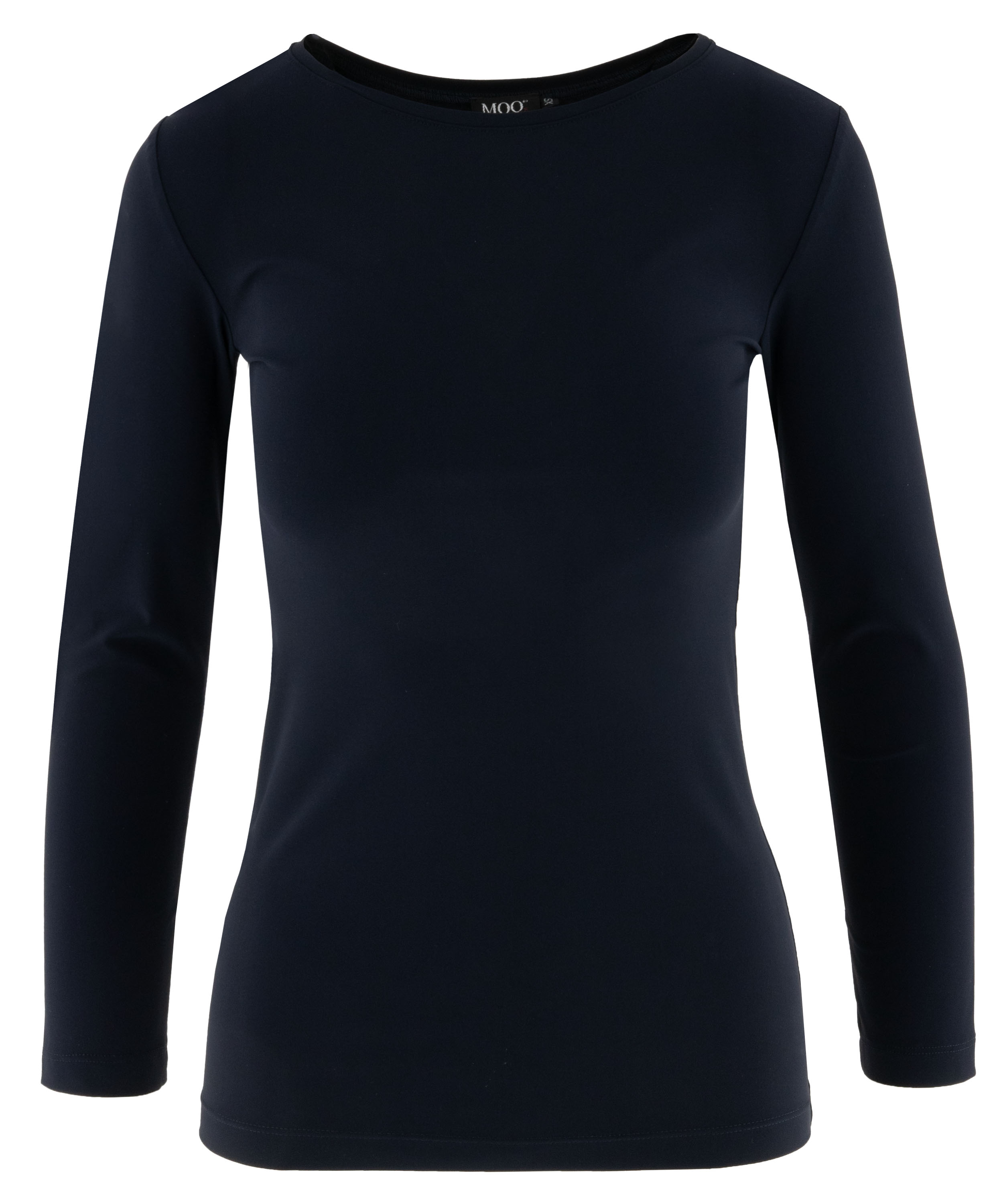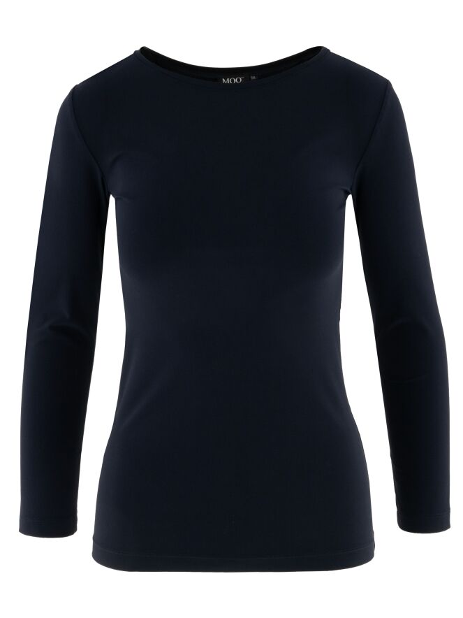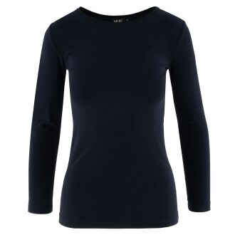 Shirt van Moq in de kleur marineblauw. Het shirt heeft een ronde hals en lange mouwen en is licht getailleerd gesneden, wat zorgt voor een vrouwelijke en comfortabele pasvorm. Dit shirt kan op 40 graden worden gewassen.