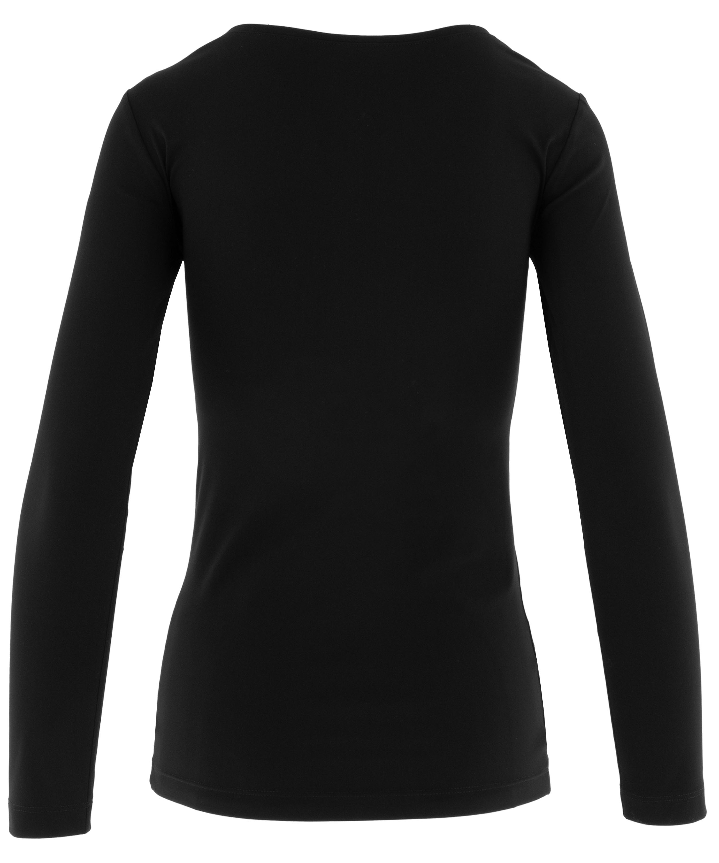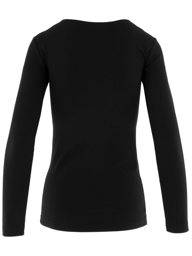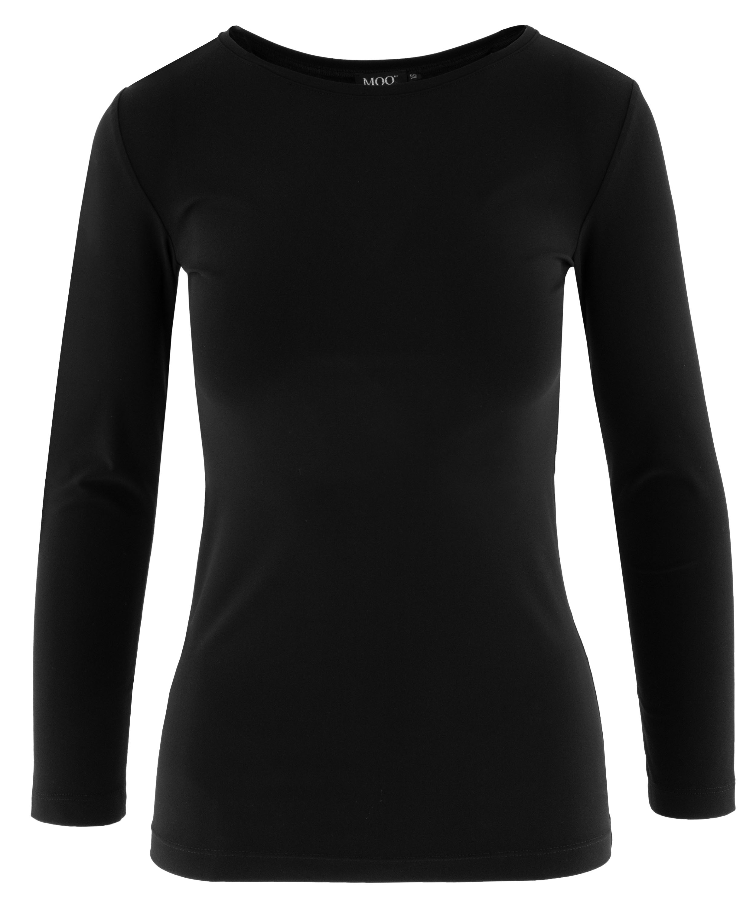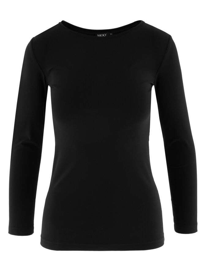 Shirt van Moq in de kleur zwart. Het shirt heeft een ronde hals en lange mouwen en is licht getailleerd gesneden, wat zorgt voor een subtiel vrouwelijke pasvorm. Dit veelzijdige shirt kan op 40 graden worden gewassen.