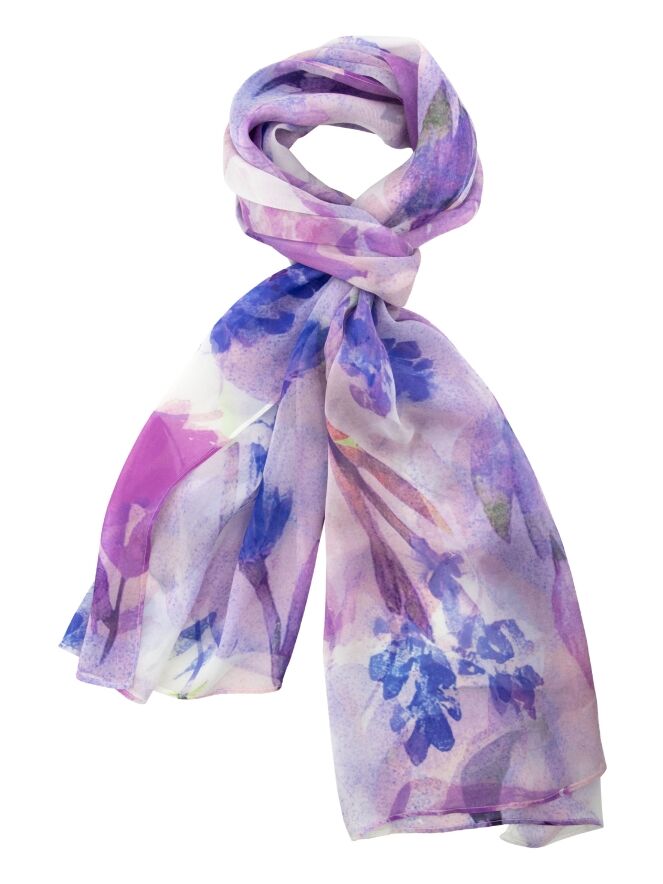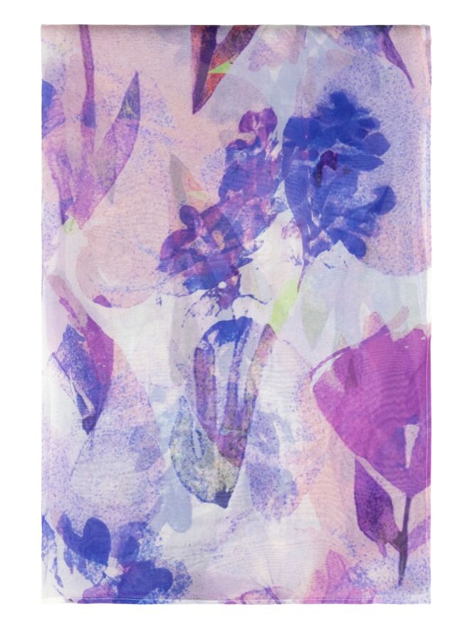 Licht transparante shawl van Moq met een grafische bloemenprint in meerdere tinten lila, roze, blauw en wit. De luchtige kwaliteit geeft de shawl een elegante en verfijnde uitstraling. Deze shawl kan met de hand worden gewassen.